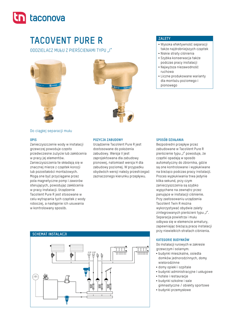 TACOVENT PURE R ZALETY ■■ ODDZIELACZ MUŁU Z PIERŚCIENAMI TYPU „I“ ■■ ■■ ■■ ■■ Wysoka efektywność separacji także najdrobniejszych cząstek Niskie straty ciśnienia Szybka konserwacja także podczas pracy instalacji Najwyższa niezawodność ruchowa Liczne produkowane warianty dla montażu poziomego i pionowego Do ciągłej separacji mułu OPIS Zanieczyszczenie wody w instalacji grzewczej powoduje często przedwczesne zużycie lub zakłócenia w pracy jej elementów. Zanieczyszczenia te składają się w znacznej mierze z cząstek korozji lub pozostałości montażowych. Mogą one być przyciągane przez pola magnetyczne pomp i zaworów sterujących, powodując zakłócenia w pracy instalacji. Urządzenie TacoVent Pure R jest stosowane w celu wytrącania tych cząstek z wody roboczej, a następnie ich usuwania w kontrolowany sposób. SCHEMAT INSTALACJI POZYCJA ZABUDOWY Urządzenie TacoVent Pure R jest dostosowane do położenia zabudowy. Wersja V jest zaprojektowana dla zabudowy pionowej, natomiast wersja H dla zabudowy poziomej. W przypadku obydwóch wersji należy przestrzegać zaznaczonego kierunku przepływu. SPOSÓB DZIAŁANIA Bezpośredni przepływ przez zabudowane w TacoVent Pure R pierścienie typu „I“ powoduje, że cząstki opadają w sposób automatyczny do zbiornika, gdzie są one kontrolowane i wypłukiwane na bieżąco podczas pracy instalacji. Proces wypłukiwania trwa jedynie kilka sekund, przy czym zanieczyszczenia są szybko wypychane na zewnątrz przez panujące w instalacji ciśnienie. Przy zastosowaniu urządzenia TacoVent Twin R można wykorzystywać obydwie zalety zintegrowanych pierścieni typu „I“. Separacja powietrza i mułu odbywa się w elemencie armatury, zapewniając bieżącą pracę instalacji przy niewielkich stratach ciśnienia. KATEGORIE BUDYNKÓW Do instalacji rurowych w zakresie grzewczym i solarnym: budynki mieszkalne, osiedla domków jednorodzinnych, domy wielorodzinne domy opieki i szpitale budynki administracyjne i usługowe hotele i restauracje budynki szkolne i sale gimnastyczne / obiekty sportowe budynki przemysłowe ■■ ■■ ■■ ■■ ■■ ■■ TACOVENT PURE R | ODDZIELACZE MUŁU TACOVENT PURE RH ZESTAWIENIE TYPÓW TacoVent Pure RH | poziomy oddzielacz mułu, przyłącze gwintowe Nr katalogowy 244.6002.000 244.6003.000 244.6004.000 244.6002.380* 244.6003.380* 244.6004.380* Opis artykułu TacoVent Pure RH ¾" TacoVent Pure RH 1" TacoVent Pure RH 1 ¼" TacoVent Pure RH Plus ¾" TacoVent Pure RH Plus 1" TacoVent Pure RH Plus 1 ¼" DN 20 25 32 20 25 32 Rp ¾" 1" 1 ¼" ¾" 1" 1 ¼" kV (m3/h) 11.2 20.0 31.4 11.2 20.0 31.4 Ciężar ** 1.4 kg 1.8 kg 2.4 kg 1.4 kg 1.8 kg 2.4 kg Pojemność wody 0.22 l 0.35 l 0.48 l 0.22 l 0.35 l 0.48 l * wraz z osłoną izolacyjną ** ciężar bez osłony izolacyjnej TEKST PRZETARGU patrz www.taconova.com DANE TECHNICZNE Dane ogólne temperatura robocza TB max: 120 ˚C ciśnienie robocze PB max: 10 bar Materiał mosiądz + tworzywo sztuczne Przepływające media woda grzewcza (VDI 2035; wytyczne SIA 384/1; ÖNORM H 5195–1) woda zimna RYSUNEK WYMIAROWY (PRODUKT / IZOLACJA) L L l l b b Rp Rp ■■ ■■ ■■ H H h h ■■ ■■ ZASADA DZIAŁANIA TABELA WYMIARÓW TacoVent Pure RH | poziomy oddzielacz mułu, przyłącze gwintowe Nr katalogowy 244.6002.000 244.6003.000 244.6004.000 244.6002.380 244.6003.380 244.6004.380 H (mm) 192 212.5 233 192 212.5 233 L (mm) 88 100 114 88 100 114 h (mm) b (mm) t (mm) 157 175.5 196 113 117 121 102 110 116 ø max. 71 80 87 71 80 87 TACOVENT PURE R | ODDZIELACZE MUŁU TACOVENT PURE RV ZESTAWIENIE TYPÓW TacoVent Pure RV | poziomy oddzielacz mułu, przyłącze gwintowe Nr katalogowy Opis artykułu 244.6102.000 TacoVent Pure RV ¾" DN 20 Rp ¾" Ciężar ** 2.15 kg Pojemność wody 0.4 l ** ciężar bez osłony izolacyjnej TEKST PRZETARGU patrz www.taconova.com RYSUNEK WYMIAROWY ø 71 ø 71 158 158 Rp ¾" Rp ¾" DANE TECHNICZNE Dane ogólne temperatura robocza TB max: 120 ˚C ciśnienie robocze PB max: 10 bar Materiał mosiądz + tworzywo sztuczne Przepływające media woda grzewcza (VDI 2035; wytyczne SIA 384/1; ÖNORM H 5195–1) woda zimna ■■ 80 80 ■■ ■■ 223 ■■ 223 ■■ Zastrzega się możliwość zmian. 05/2015 80 KONTAKT I DALSZE INFORMACJE Taconova GmbH | Biuro Polska | Rudolf-Diesel-Straße 8 | DE-78224 Singen T +48 570566200 | F +49 7731 98 28 88 | [email protected] | taconova.com 80 TACONOVA.COM
