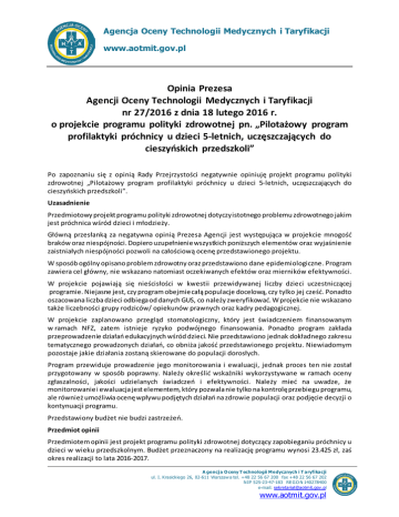 Agencja Oceny Technologii Medycznych i Taryfikacji www.aotmit.gov.pl Opinia Prezesa Agencji Oceny Technologii Medycznych i Taryfikacji nr 27/2016 z dnia 18 lutego 2016 r. o projekcie programu polityki zdrowotnej pn. „Pilotażowy program profilaktyki próchnicy u dzieci 5-letnich, uczęszczających do cieszyńskich przedszkoli” Po zapoznaniu się z opinią Rady Przejrzystości negatywnie opiniuję projekt programu polityki zdrowotnej „Pilotażowy program profilaktyki próchnicy u dzieci 5-letnich, uczęszczających do cieszyńskich przedszkoli”. Uzasadnienie Przedmiotowy projekt programu polityki zdrowotnej dotyczy istotnego problemu zdrowotnego jakim jest próchnica wśród dzieci i młodzieży. Główną przesłanką za negatywna opinią Prezesa Agencji jest występująca w projekcie mnogość braków oraz niespójności. Dopiero uzupełnienie wszystkich poniższych elementów oraz wyjaśnienie zaistniałych niespójności pozwoli na całościową ocenę przedstawionego projektu. W sposób ogólny opisano problem zdrowotny oraz przedstawiono dane epidemiologiczne. Program zawiera cel główny, nie wskazano natomiast oczekiwanych efektów oraz mierników efektywności. W projekcie pojawiają się nieścisłości w kwestii przewidywanej liczby dzieci uczestniczącej programie. Niejasne jest, czy program obejmie całą populacje docelową, czy tylko jej cześć. Ponadto oszacowana liczba dzieci odbiega od danych GUS, co należy zweryfikować. W projekcie nie wskazano także liczebności grupy rodziców/ opiekunów prawnych oraz kadry pedagogicznej. W projekcie zaplanowano przegląd stomatologiczny, który jest świadczeniem finansowanym w ramach NFZ, zatem istnieje ryzyko podwójnego finansowania. Ponadto program zakłada przeprowadzenie działań edukacyjnych wśród dzieci. Nie przedstawiono jednak dokładnego zakresu tematycznego prowadzonych działań, co obniża jakość przedstawionego projektu. Niewiadomym pozostaje jakie działania zostaną skierowane do populacji dorosłych. Program przewiduje prowadzenie jego monitorowania i ewaluacji, jednak proces ten nie został przygotowany w sposób poprawny. Należy określić wskaźniki wykorzystywane w ramach oceny zgłaszalności, jakości udzielanych świadczeń i efektywności. Należy mieć na uwadze, że monitorowanie i ewaluacja jest elementem, który pozwala nie tylko na kontrolę przebiegu programu, ale również umożliwia ocenę wpływu podjętych działań na zdrowie populacji oraz podjęcie decyzji o kontynuacji programu. Przedstawiony budżet nie budzi zastrzeżeń. Przedmiot opinii Przedmiotem opinii jest projekt programu polityki zdrowotnej dotyczący zapobieganiu próchnicy u dzieci w wieku przedszkolnym. Budżet przeznaczony na realizację programu wynosi 23.425 zł, zaś okres realizacji to lata 2016-2017. A gencja O ceny T echnologii M edycznych i T aryfikacji ul. I. Krasickiego 26, 02-611 Warszaw a tel. +48 22 56 67 200 fax +48 22 56 67 202 N IP 525-23-47-183 RE G O N 140278400 e-mail: [email protected] www.aotmit.gov.pl Opinia Prezesa AOTMiT nr 27/2016 z dnia 18 lutego 2016r. Opinia Prezesa Agencji została przygotowana w oparciu o ocenę technologii medycznej proponowanej w ramach programu polityki zdrowotnej zgodnie z kryteriami zawartymi w art. 31a ust. 1 i art. 48 ust. 4 ustawy o świadczeniach wraz z oceną założeń projektu programu polityki zdrowotnej, które wspierają efektywność kliniczną i kosztową technologii medycznej planowanej w programie. Ocena projektu programu polityki zdrowotnej Znaczenie problemu zdrowotnego Projekt odnosi się do istotnego i dobrze zdefiniowanego problemu zdrowotnego, jakim jest występowanie próchnicy wśród dzieci i młodzieży w wieku szkolnym. Opis problemu zdrowotnego został przedstawiony w sposób prawidłowy. W projekcie przedstawiono także ogólnopolskie dane epidemiologiczne. Warto uwzględnić w projekcie także dane regionalne, które będą informować i rozprzestrzenieniu problemu w gminie. Próchnica zębów jest jednym z najbardziej rozpowszechnionych schorzeń cywilizacyjnych. Według Światowej Organizacji Zdrowia szacuje się, że dotyczyć ona może 60-90% populacji dzieci i młodzieży w wieku szkolnym. Próchnica jest chorobą pojawiającą się już w zębach mlecznych w pierwszym roku życia dziecka. Między 2. a 3. r. ż. występuje u 35–50% dzieci, między 3. a 4. r. ż. próchnica występuje u 56–60% dzieci, a w wieku 6–7 lat u prawie 100% dzieci. Na podstawie ostatnich przeprowadzonych badań epidemiologicznych stwierdza się, iż blisko 90% dzieci 12-letnich w Polsce ma próchnicę. Pomiędzy 6. a 12. rokiem życia, aż 89,3% dzieci miało przynajmniej jeden ząb szósty dotknięty próchnicą. Cele i efekty programu Celami głównymi programu są: poprawa stanu zdrowotnego jamy ustnej u dzieci przedszkolnych, obniżenie kosztów leczenia stomatologicznego w przyszłości oraz zwiększenie szansy na zachowanie dobrego stanu uzębienia w kolejnych okresach życia. Dodatkowo wskazano 5 celów szczegółowych stanowiących uzupełnienie celów głównych. W projekcie nie wskazano oczekiwanych efektów ani mierników efektywności. Proszę mieć na uwadze, że są to niezbędne elementy programu, które należy uzupełnić. Oczekiwane efekty powinny odpowiadać celom programu i zostać skonstruowane w taki sposób, aby przedstawiały rzeczywiste rezultaty, które będą obserwowane po przeprowadzeniu danych interwencji. Celem mierników efektywności jest ocena stopnia realizacji założeń programowych oraz ocena wpływu danych interwencji na zdrowie populacji. W ramach mierników efektywności proszę rozważyć przeprowadzenie wizyty kontrolnej po roku od zakończenia programu i sprawdzić stan uzębienia pod kątem progresji próchnicy u dzieci objętych programem. Warto sprawdzić stan wiedzy dzieci i rodziców przed i po przeprowadzeniu instruktażu higieny jamy ustnej oraz sprawdzić, czy uczestnicy stosują się do zaleceń l