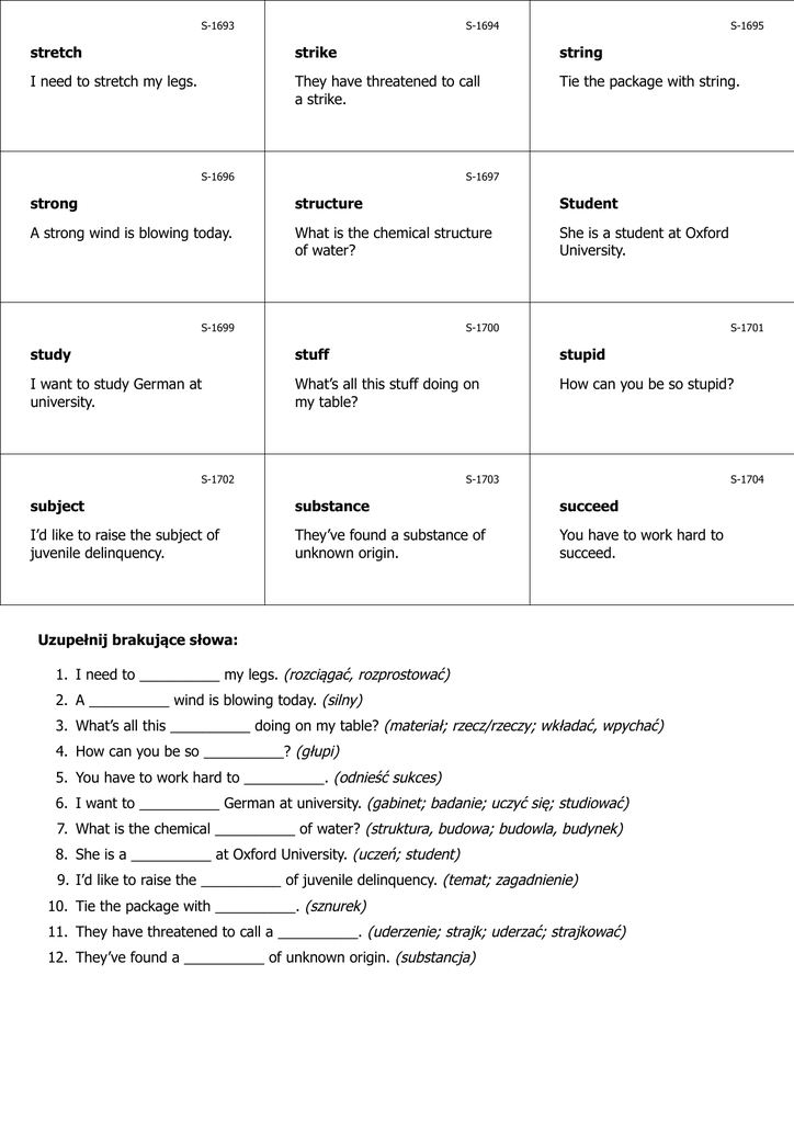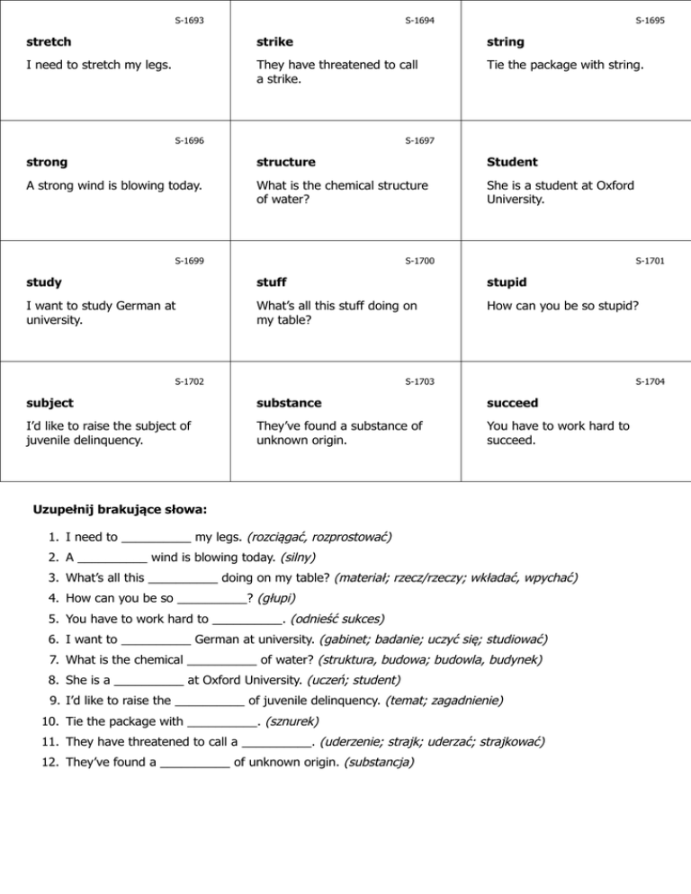 S-1693 S-1694 S-1695 stretch strike string I need to stretch my legs. They have threatened to call a strike. Tie the package with string. S-1696 S-1697 strong structure Student A strong wind is blowing today. What is the chemical structure of water? She is a student at Oxford University. S-1699 S-1700 S-1701 study stuff stupid I want to study German at university. What’s all this stuff doing on my table? How can you be so stupid? S-1702 S-1703 S-1704 subject substance succeed I’d like to raise the subject of juvenile delinquency. They’ve found a substance of unknown origin. You have to work hard to succeed. Uzupełnij brakujące słowa: 1. I need to __________ my legs. (rozciągać, rozprostować) 2. A __________ wind is blowing today. (silny) 3. What’s all this __________ doing on my table? (materiał; rzecz/rzeczy; wkładać, wpychać) 4. How can you be so __________? (głupi) 5. You have to work hard to __________. (odnieść sukces) 6. I want to __________ German at university. (gabinet; badanie; uczyć się; studiować) 7. What is the chemical __________ of water? (struktura, budowa; budowla, budynek) 8. She is a __________ at Oxford University. (uczeń; student) 9. I’d like to raise the __________ of juvenile delinquency. (temat; zagadnienie) 10. Tie the package with __________. (sznurek) 11. They have threatened to call a __________. (uderzenie; strajk; uderzać; strajkować) 12. They’ve found a __________ of unknown origin. (substancja) S-1695 sznurek S-1694 uderzenie; strajk; uderzać; strajkować Zwiąż paczkę sznurkiem. S-1693 rozciągać, rozprostować Muszę rozprostować nogi. Zagrozili, że ogłoszą strajk. www.isel.edu.pl www.isel.edu.pl www.isel.edu.pl S-1698 S-1697 S-1696 uczeń; student Jest studentką Uniwersytetu Oksfordzkiego. struktura, budowa; budowla, budynek silny Wieje dzisiaj silny wiatr. Jaka jest struktura chemiczna wody? www.isel.edu.pl www.isel.edu.pl www.isel.edu.pl S-1701 S-1700 S-1699 głupi Jak możesz być taki głupi? materiał; rzecz/rzeczy; wkładać, wpychać gabinet; badanie; uczyć się; studiować Co te wszystkie rzeczy robią na moim stole? Chcę studiować niemiecki na uniwersytecie. www.isel.edu.pl www.isel.edu.pl www.isel.edu.pl S-1704 S-1703 S-1702 odnieść sukces substancja temat; zagadnienie Musisz ciężko pracować, by odnieść sukces. Znaleźli substancję niewiadomego pochodzenia. Chciałbym poruszyć temat przestępczości nieletnich. www.isel.edu.pl Odpowiedzi: 1. stretch 2. strong 3. stuff 4. stupid 5. succeed 6. study 7. structure 8. student 9. subject 10. string 11. strike 12. substance www.isel.edu.pl www.isel.edu.pl