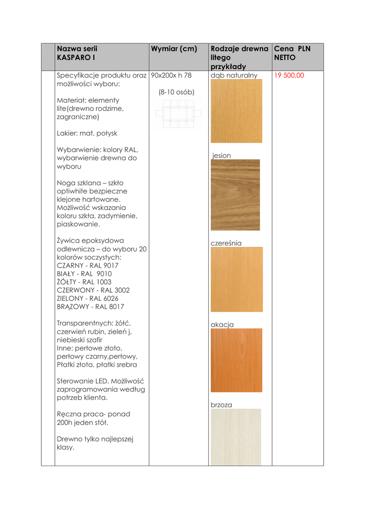 Nazwa serii KASPARO I Wymiar (cm) Specyfikacje produktu oraz 90x200x h 78 możliwości wyboru: (8-10 osób) Materiał: elementy lite(drewno rodzime, zagraniczne) Rodzaje drewna Cena PLN litego NETTO przykłady dąb naturalny Lakier: mat, połysk Wybarwienie: kolory RAL, wybarwienie drewna do wyboru jesion Noga szklana – szkło optiwhite bezpieczne klejone hartowane. Możliwość wskazania koloru szkła, zadymienie, piaskowanie. Żywica epoksydowa odlewnicza – do wyboru 20 kolorów soczystych: CZARNY - RAL 9017 BIAŁY - RAL 9010 ŻÓŁTY - RAL 1003 CZERWONY - RAL 3002 ZIELONY - RAL 6026 BRĄZOWY - RAL 8017 czereśnia Transparentnych: żółć, czerwień rubin, zieleń j, niebieski szafir Inne: perłowe złoto, perłowy czarny,perłowy, Płatki złota, płatki srebra akacja Sterowanie LED. Możliwość zaprogramowania według potrzeb klienta. brzoza Ręczna praca- ponad 200h jeden stół. Drewno tylko najlepszej klasy. 19 500,00 Lakiery i bejce z najwyższej półki Sherwin- Williams. 90x200x h 78 orzech europejski 32 000,00 (8-10 osób) Produkcja obejmuje tylko 100 sztuk jednej serii, każdy stół posiada swój numer. Każdy stół posiada logo firmy. Certyfikat autentyczności ze zdjęciami. orzech amerykański Zaświadczenie o nasadzeniu drzewa w zamian za zakup. Czas oczekiwania do 4 tygodni- wykonanie z Czarnego Dębu - 8 tygodni Wycena zawiera dostawę i montaż na terenie Polski! Organizujemy transport poza granicami Polski. Wycena na zapytanie. Oczekiwanie na transport – 1tydzień. 90x200x h 78 (8-10 osób) heban 35 000,00 90x200x h 78 Czarny dąb (8-10 osób) ! jakiekolwiek zmiany w projekcie powodują podwyższenie bądź obniżenie ceny o ~35%150% (dąb kopalny, polski heban) – drewno dębów przebywających w ziemi lub pod wodą od kilkuset do nawet kilkunastu tysięcy lat. 49 500,00