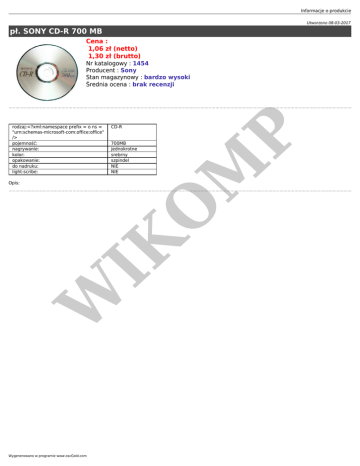 Informacje o produkcie Utworzono 08-03-2017 pł. SONY CD-R 700 MB Cena : 1,06 zł (netto) 1,30 zł (brutto) Nr katalogowy : 1454 Producent : Sony Stan magazynowy : bardzo wysoki Średnia ocena : brak recenzji W Wygenerowano w programie www.oscGold.com P 700MB jednokrotne srebrny szpindel NIE NIE IK Opis: CD-R O M rodzaj:<?xml:namespace prefix = o ns = "urn:schemas-microsoft-com:office:office" /> pojemność: nagrywanie: kolor: opakowanie: do nadruku: light-scribe: