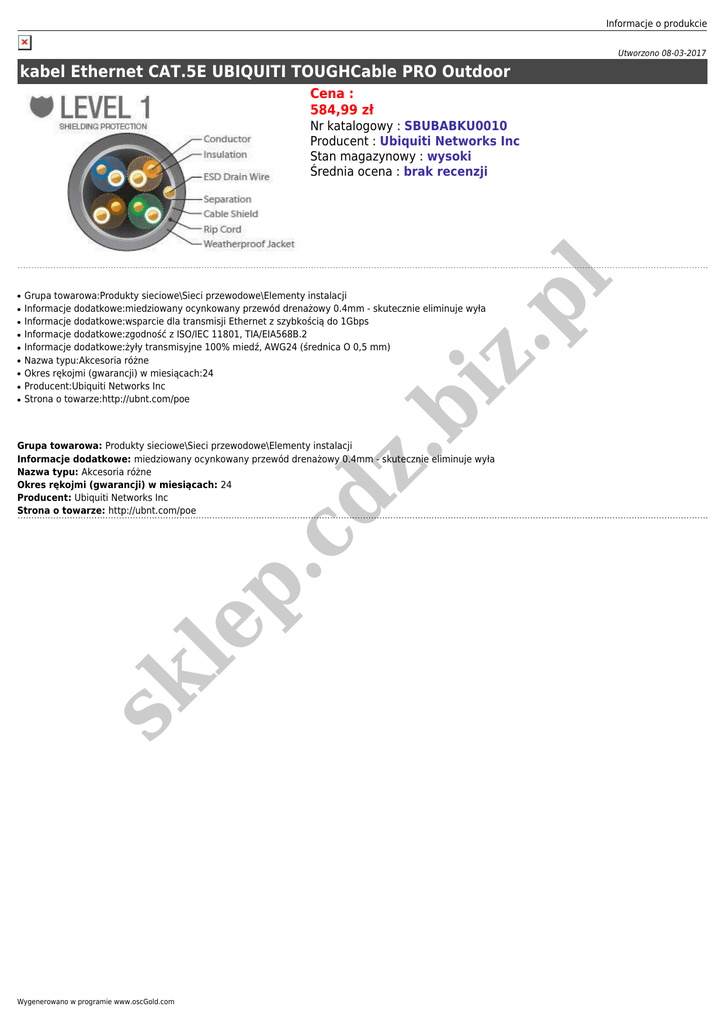 Informacje o produkcie Utworzono 08-03-2017 kabel Ethernet CAT.5E UBIQUITI TOUGHCable PRO Outdoor Cena : 584,99 zł ● ● ● ● ● ● ● .b ● Grupa towarowa:Produkty sieciowe\Sieci przewodowe\Elementy instalacji Informacje dodatkowe:miedziowany ocynkowany przewód drenażowy 0.4mm - skutecznie eliminuje wyła Informacje dodatkowe:wsparcie dla transmisji Ethernet z szybkością do 1Gbps Informacje dodatkowe:zgodność z ISO/IEC 11801, TIA/EIA568B.2 Informacje dodatkowe:żyły transmisyjne 100% miedź, AWG24 (średnica O 0,5 mm) Nazwa typu:Akcesoria różne Okres rękojmi (gwarancji) w miesiącach:24 Producent:Ubiquiti Networks Inc Strona o towarze:http://ubnt.com/poe iz .p ● l Nr katalogowy : SBUBABKU0010 Producent : Ubiquiti Networks Inc Stan magazynowy : wysoki Średnia ocena : brak recenzji sk le p .c dz Grupa towarowa: Produkty sieciowe\Sieci przewodowe\Elementy instalacji Informacje dodatkowe: miedziowany ocynkowany przewód drenażowy 0.4mm - skutecznie eliminuje wyła Nazwa typu: Akcesoria różne Okres rękojmi (gwarancji) w miesiącach: 24 Producent: Ubiquiti Networks Inc Strona o towarze: http://ubnt.com/poe Wygenerowano w programie www.oscGold.com