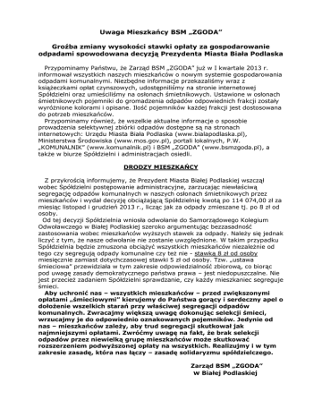 Uwaga Mieszkańcy BSM „ZGODA” Groźba zmiany wysokości stawki opłaty za gospodarowanie odpadami spowodowana decyzją Prezydenta Miasta Biała Podlaska Przypominamy Państwu, że Zarząd BSM „ZGODA” już w I kwartale 2013 r. informował wszystkich naszych mieszkańców o nowym systemie gospodarowania odpadami komunalnymi. Niezbędne informacje przekazaliśmy wraz z książeczkami opłat czynszowych, udostępniliśmy na stronie internetowej Spółdzielni oraz umieściliśmy na osłonach śmietnikowych. Ustawione w osłonach śmietnikowych pojemniki do gromadzenia odpadów odpowiednich frakcji zostały wyróżnione kolorami i opisane. Ilość pojemników każdej frakcji jest dostosowana do potrzeb mieszkańców. Przypominamy również, że wszelkie aktualne informacje o sposobie prowadzenia selektywnej zbiórki odpadów dostępne są na stronach internetowych: Urzędu Miasta Biała Podlaska (www.bialapodlaska.pl), Ministerstwa Środowiska (www.mos.gov.pl), portali lokalnych, P.W. „KOMUNALNIK” (www.komunalnik.pl) i BSM „ZGODA” (www.bsmzgoda.pl), a także w biurze Spółdzielni i administracjach osiedli. DRODZY MIESZKAŃCY Z przykrością informujemy, że Prezydent Miasta Białej Podlaskiej wszczął wobec Spółdzielni postępowanie administracyjne, zarzucając niewłaściwą segregację odpadów komunalnych w naszych osłonach śmietnikowych przez mieszkańców i wydał decyzję obciążającą Spółdzielnię kwotą po 114 074,00 zł za miesiąc listopad i grudzień 2013 r., licząc jak za odpady zmieszane tj. po 8 zł od osoby. Od tej decyzji Spółdzielnia wniosła odwołanie do Samorządowego Kolegium Odwoławczego w Białej Podlaskiej szeroko argumentując bezzasadność zastosowania wobec mieszkańców wyższych stawek za odpady. Należy się jednak liczyć z tym, że nasze odwołanie nie zostanie uwzględnione. W takim przypadku Spółdzielnia będzie zmuszona obciążyć wszystkich mieszkańców niezależnie od tego czy segregują odpady komunalne czy też nie - stawką 8 zł od osoby miesięcznie zamiast dotychczasowej stawki 5 zł od osoby. Tzw. „ustawa śmieciowa” przewidziała w tym zakresie odpowiedzialność zbiorową, co biorąc pod uwagę zasady demokratycznego państwa prawa – jest niedopuszczalne. Nie jest przecież zadaniem Spółdzielni sprawdzanie, czy każdy mieszkaniec segreguje śmieci. Aby uchronić nas – wszystkich mieszkańców – przed zwiększonymi opłatami „śmieciowymi” kierujemy do Państwa gorący i serdeczny apel o dołożenie wszelkich starań przy właściwej segregacji odpadów komunalnych. Zwracajmy większą uwagę dokonując selekcji śmieci, wrzucajmy je do odpowiednio oznakowanych pojemników. Jedynie od nas – mieszkańców zależy, aby trud segregacji skutkował jak najmniejszymi opłatami. Zwróćmy uwagę na fakt, że brak selekcji odpadów przez niewielką grupę mieszkańców może skutkować rozszerzeniem podwyższonej opłaty na wszystkich. Realizujmy i w tym zakresie zasadę, która nas łączy – zasadę solidaryzmu spółdzielczego. Zarząd BSM „ZGODA” w Białej Podlaskiej