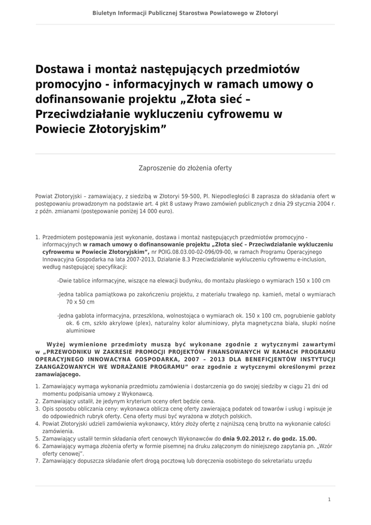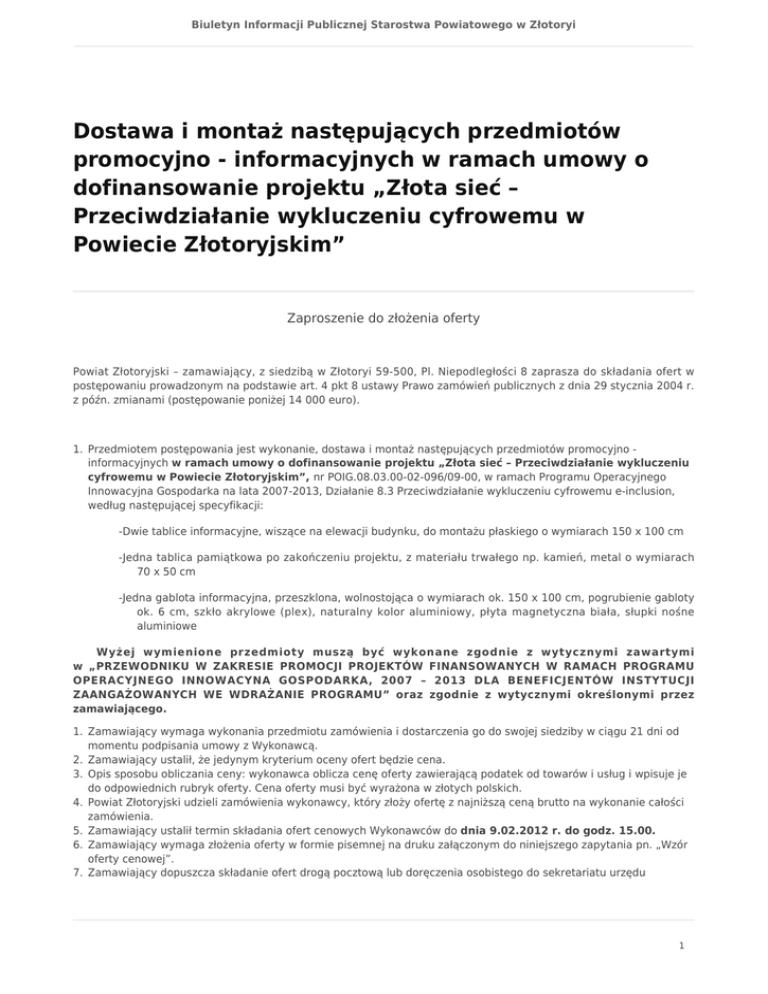 Biuletyn Informacji Publicznej Starostwa Powiatowego w Złotoryi Dostawa i montaż następujących przedmiotów promocyjno - informacyjnych w ramach umowy o dofinansowanie projektu „Złota sieć – Przeciwdziałanie wykluczeniu cyfrowemu w Powiecie Złotoryjskim” Zaproszenie do złożenia oferty Powiat Złotoryjski – zamawiający, z siedzibą w Złotoryi 59-500, Pl. Niepodległości 8 zaprasza do składania ofert w postępowaniu prowadzonym na podstawie art. 4 pkt 8 ustawy Prawo zamówień publicznych z dnia 29 stycznia 2004 r. z późn. zmianami (postępowanie poniżej 14 000 euro). 1. Przedmiotem postępowania jest wykonanie, dostawa i montaż następujących przedmiotów promocyjno informacyjnych w ramach umowy o dofinansowanie projektu „Złota sieć – Przeciwdziałanie wykluczeniu cyfrowemu w Powiecie Złotoryjskim”, nr POIG.08.03.00-02-096/09-00, w ramach Programu Operacyjnego Innowacyjna Gospodarka na lata 2007-2013, Działanie 8.3 Przeciwdziałanie wykluczeniu cyfrowemu e-inclusion, według następującej specyfikacji: -Dwie tablice informacyjne, wiszące na elewacji budynku, do montażu płaskiego o wymiarach 150 x 100 cm -Jedna tablica pamiątkowa po zakończeniu projektu, z materiału trwałego np. kamień, metal o wymiarach 70 x 50 cm -Jedna gablota informacyjna, przeszklona, wolnostojąca o wymiarach ok. 150 x 100 cm, pogrubienie gabloty ok. 6 cm, szkło akrylowe (plex), naturalny kolor aluminiowy, płyta magnetyczna biała, słupki nośne aluminiowe Wyżej wymienione przedmioty muszą być wykonane zgodnie z wytycznymi zawartymi w „PRZEWODNIKU W ZAKRESIE PROMOCJI PROJEKTÓW FINANSOWANYCH W RAMACH PROGRAMU OPERACYJNEGO INNOWACYNA GOSPODARKA, 2007 – 2013 DLA BENEFICJENTÓW INSTYTUCJI ZAANGAŻOWANYCH WE WDRAŻANIE PROGRAMU” oraz zgodnie z wytycznymi określonymi przez zamawiającego. 1. Zamawiający wymaga wykonania przedmiotu zamówienia i dostarczenia go do swojej siedziby w ciągu 21 dni od momentu podpisania umowy z Wykonawcą. 2. Zamawiający ustalił, że jedynym kryterium oceny ofert będzie cena. 3. Opis sposobu obliczania ceny: wykonawca oblicza cenę oferty zawierającą podatek od towarów i usług i wpisuje je do odpowiednich rubryk oferty. Cena oferty musi być wyrażona w złotych polskich. 4. Powiat Złotoryjski udzieli zamówienia wykonawcy, który złoży ofertę z najniższą ceną brutto na wykonanie całości zamówienia. 5. Zamawiający ustalił termin składania ofert cenowych Wykonawców do dnia 9.02.2012 r. do godz. 15.00. 6. Zamawiający wymaga złożenia oferty w formie pisemnej na druku załączonym do niniejszego zapytania pn. „Wzór oferty cenowej”. 7. Zamawiający dopuszcza składanie ofert drogą pocztową lub doręczenia osobistego do sekretariatu urzędu 1 Biuletyn Informacji Publicznej Starostwa Powiatowego w Złotoryi (decyduje data wpływu) na adres Starostwo Powiatowe w Złotoryi, 59-500 Złotoryja, Pl. Niepodległości 8, a także drogą elektroniczną w formie zeskanowanego dokumentu podpisanej oferty cenowej na adres [email protected] lub w formie faxu na nr 76 878 69 55. 2