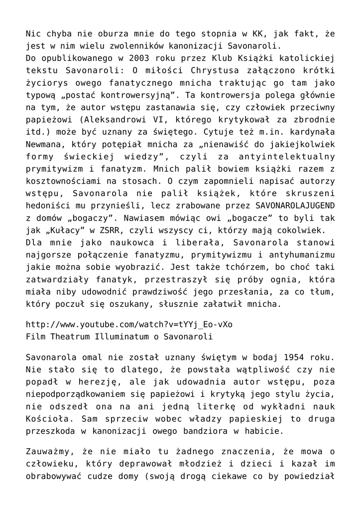 Nic chyba nie oburza mnie do tego stopnia w KK, jak fakt, że jest w nim wielu zwolenników kanonizacji Savonaroli. Do opublikowanego w 2003 roku przez Klub Książki katolickiej tekstu Savonaroli: O miłości Chrystusa załączono krótki życiorys owego fanatycznego mnicha traktując go tam jako typową „postać kontrowersyjną”. Ta kontrowersja polega głównie na tym, że autor wstępu zastanawia się, czy człowiek przeciwny papieżowi (Aleksandrowi VI, którego krytykował za zbrodnie itd.) może być uznany za świętego. Cytuje też m.in. kardynała Newmana, który potępiał mnicha za „nienawiść do jakiejkolwiek formy świeckiej wiedzy”, czyli za antyintelektualny prymitywizm i fanatyzm. Mnich palił bowiem książki razem z kosztownościami na stosach. O czym zapomnieli napisać autorzy wstępu, Savonarola nie palił książek, które skruszeni hedoniści mu przynieśli, lecz zrabowane przez SAVONAROLAJUGEND z domów „bogaczy”. Nawiasem mówiąc owi „bogacze” to byli tak jak „Kułacy” w ZSRR, czyli wszyscy ci, którzy mają cokolwiek. Dla mnie jako naukowca i liberała, Savonarola stanowi najgorsze połączenie fanatyzmu, prymitywizmu i antyhumanizmu jakie można sobie wyobrazić. Jest także tchórzem, bo choć taki zatwardziały fanatyk, przestraszył się próby ognia, która miała niby udowodnić prawdziwość jego przesłania, za co tłum, który poczuł się oszukany, słusznie załatwił mnicha. http://www.youtube.com/watch?v=tYYj_Eo-vXo Film Theatrum Illuminatum o Savonaroli Savonarola omal nie został uznany świętym w bodaj 1954 roku. Nie stało się to dlatego, że powstała wątpliwość czy nie popadł w herezję, ale jak udowadnia autor wstępu, poza niepodporządkowaniem się papieżowi i krytyką jego stylu życia, nie odszedł ona na ani jedną literkę od wykładni nauk Kościoła. Sam sprzeciw wobec władzy papieskiej to druga przeszkoda w kanonizacji owego bandziora w habicie. Zauważmy, że nie miało tu żadnego znaczenia, że mowa o człowieku, który deprawował młodzież i dzieci i kazał im obrabowywać cudze domy (swoją drogą ciekawe co by powiedział na to Thomas Woods, głosiciel tezy o związkach poszanowania prawa własności i tradycją KK), który tyranizował Florencję, niczym Kalwin Genewę, tylko głupiej. Autor owego wstępu zaznacza, że Savonarola nie potrafił być konsekwentny ani jednolicie okrutny, jakby to miało stanowić okoliczność łagodzącą, a kilka linijek dalej życzy mu rychłej kanonizacji! Jaka jest różnica między tym bandytą a innymi uduchowionymi bandytami jak Osama albo Hitler, który w Mein Kampf popiera chrześcijaństwo, i zapowiada walkę „z materializmem socjalistów”? Żadna, poza jedną – był człowiekiem ze stajni Jahwe i dlatego on jest w oczach katolików cool, a H., O. , Lenin czy Robespierre — są be. We wstępie do Miłości Chrystusa (Chrystusa Savonarola kochał, gorzej z ludźmi, a przecież Jezus zmarł na Krzyżu i mu wszystko jedno, a żywi florentyńczycy cierpieli) zaznaczono, że Machiavelli był pod wrażeniem Savonaroli i darzył go szacunkiem. Cytowanie tego stanowi skrajny brak szacunku wobec ludzi żyjących w tamtych czasach. Machiavelli był opluwany przez KK przez stulecia, choć napisał o polityce prawdę, i papieże, jak inni władcy, czytywali go (ale ukradkiem) . M. chwalił S. bo ten był skuteczny (do pewnego momentu) i tyle. Nawiasem mówiąc to Machiavellemu bliżej do świętości niż Savonaroli; był uczciwy. Kościół nigdy nie był instytucją uczciwą. Zawsze uważał, że ma monopol nie tylko na prawdę o niebiesiech, ale i na prawdę o prawidłowym funkcjonowaniu społeczeństw. Dla tego celu działał z absolutną bezwzględnością, o czym zapominamy sądząc błędnie, że monopol na przemoc mają naziści i komuniści. KK jako instytucja szkodliwa zapewne zasługuje na takiego „świętego” jak Savonarola i vice versa.
