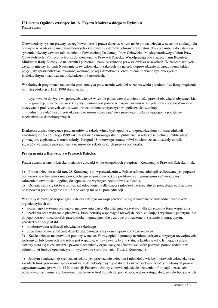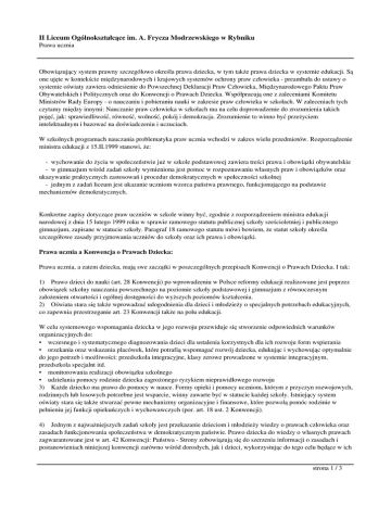 II Liceum Ogólnokształcące im. A. Frycza Modrzewskiego w Rybniku Prawa ucznia Obowiązujący system prawny szczegółowo określa prawa dziecka, w tym także prawa dziecka w systemie edukacji. Są one ujęte w kontekście międzynarodowych i krajowych systemów ochrony praw człowieka - preambuła do ustawy o systemie oświaty zawiera odniesienie do Powszechnej Deklaracji Praw Człowieka, Międzynarodowego Paktu Praw Obywatelskich i Politycznych oraz do Konwencji o Prawach Dziecka. Współpracują one z zaleceniami Komitetu Ministrów Rady Europy - o nauczaniu i pobieraniu nauki w zakresie praw człowieka w szkołach. W zaleceniach tych czytamy między innymi: Nauczanie praw człowieka w szkołach ma na celu doprowadzenie do zrozumienia takich pojęć, jak: sprawiedliwość, równość, wolność, pokój i demokracja. Zrozumienie to winno być przeżyciem intelektualnym i bazować na doświadczeniu i uczuciach. W szkolnych programach nauczania problematyka praw ucznia wchodzi w zakres wielu przedmiotów. Rozporządzenie ministra edukacji z 15.II.1999 stanowi, że: - wychowanie do życia w społeczeństwie już w szkole podstawowej zawiera treści prawa i obowiązki obywatelskie - w gimnazjum wśród zadań szkoły wymieniona jest pomoc w rozpoznawaniu własnych praw i obowiązków oraz ukazywanie praktycznych zastosowań i procedur demokratycznych w społeczności szkolnej - jednym z zadań liceum jest ukazanie uczniom wzorca państwa prawnego, funkcjonującego na podstawie mechanizmów demokratycznych. Konkretne zapisy dotyczące praw uczniów w szkole winny być, zgodnie z rozporządzeniem ministra edukacji narodowej z dnia 15 lutego 1999 roku w sprawie ramowego statutu publicznej szkoły sześcioletniej i publicznego gimnazjum, zapisane w statucie szkoły. Paragraf 18 ramowego statutu mówi bowiem, że statut szkoły określa szczegółowe zasady przyjmowania uczniów do szkoły oraz ich prawa i obowiązki. Prawa ucznia a Konwencja o Prawach Dziecka: Prawa ucznia, a zatem dziecka, mają swe zaczątki w poszczególnych przepisach Konwencji o Prawach Dziecka. I tak: 1) Prawo dzieci do nauki (art. 28 Konwencji) po wprowadzeniu w Polsce reformy edukacji realizowane jest poprzez obowiązek szkolny nauczania powszechnego na poziomie szkoły podstawowej i gimnazjum z równoczesnym założeniem otwartości i ogólnej dostępności do wyższych poziomów kształcenia. 2) Oświata stara się także wprowadzać udogodnienia dla dzieci i młodzieży o specjalnych potrzebach edukacyjnych, co zapewnia przestrzeganie art. 23 Konwencji także na polu edukacji. W celu systemowego wspomagania dziecka w jego rozwoju przewiduje się stworzenie odpowiednich warunków organizacyjnych do: • wczesnego i systematycznego diagnozowania dzieci dla ustalenia korzystnych dla ich rozwoju form wspierania • orzekania oraz wskazania placówek, które potrafią wspomagać rozwój dziecka, edukując i wychowując optymalnie do jego potrzeb i możliwości: przedszkola integracyjne, klasy zerowe prowadzone w systemie integracyjnym, przedszkola specjalnt itd. • monitorowania realizacji obowiązku szkolnego • udzielania pomocy rodzinie dziecka zagrożonego ryzykiem nieprawidłowego rozwoju 3) Każde dziecko ma prawo do pomocy w nauce. Formy opieki i pomocy uczniom, którym z przyczyn rozwojowych, rodzinnych lub losowych potrzebne jest wsparcie, winny zawarte być w statucie każdej szkoły. Istniejący system oświaty stara się także stwarzać pewne mechanizmy organizacyjne i finansowe, które pozwolą pomóc rodzinie w pełnieniu jej funkcji opiekuńczych i wychowawczych (por. art. 18 ust. 2 Konwencji). 4) Jednym z najważniejszych zadań szkoły jest przekazanie dzieciom i młodzieży wiedzy o prawach człowieka oraz zasadach funkcjonowania społeczeństwa w demokratycznym państwie. Prawo dziecka do wiedzy o własnych prawach zagwarantowane jest w art. 42 Konwencji: Państwa - Strony zobowiązują się do szerzenia informacji o zasadach i postanowieniach niniejszej konwencji zarówno wśród dorosłych, jak i dzieci, wykorzystując do tego celu będące w ich strona 1 / 3 II Liceum Ogólnokształcące im. A. Frycza Modrzewskiego w Rybniku Prawa ucznia dyspozycji środki. Problematyka praw człowieka, dziecka, ucznia w szkolnych programach nauczania wchodzi w zakres wielu przedmiotów i ścieżek międzyprzedmiotowych. 5) Szkoły zapewniają także wykonywanie art. 12 i 13 Konwencji, stwarzając uczniom możliwość wyrażenia własnych poglądów, a nawet kształtowania oblicza szkoły poprzez samorządność uczniowską. Organy samorządu są jedynymi reprezentantami ogółu uczniów. Samorząd może przekazać radzie szkoły, radzie pedagogicznej oraz dyrektorowi wnioski i opinie we wszystkich sprawach szkoły. 6) Polskie prawo oświatowe zapewnia członkom mniejszości narodowych na terenie przedszkoli i szkół odpowiednie warunki, by mogli oni właściwie kształtować swą tożsamość narodową i religijną, a także poznawać kulturę i historię swego narodu, do czego zobowiązuje art. 30 Konwencji o Prawach Dziecka. 7) Ustawa zobowiązuje szkoły publiczne do organizacji nauki religii na życzenie rodziców, bądź w szkołach ponadpodstawowych - także samych uczniów, co zapewnia właściwe wykonanie art.14 Konwencji. Prawa i obowiązki ucznia w statucie II LO: PRAWA I OBOWIĄZKI UCZNIA/SŁUCHACZA (fragment § 15. Statutu Szkoły) 1. Statut szkoły określa prawa i obowiązki ucznia/słuchacza. 2. Prawa i obowiązki ucznia zgodne są z Konwencją o Prawach Dziecka. 3. W naszej szkole uczeń ma prawo do: 1. znajomości swoich praw w szkole dostępu do wiedzy na ich temat 2. równego traktowania wobec prawa szkolnego 3. swobodnej wypowiedzi, wyrażania własnych poglądów, w szczególności dotyczących życia szkoły bez naruszania godności osobistej drugiego człowieka 4. poszanowania swojej godności osobistej oraz do kulturalnego traktowania przez wszystkich pracowników szkoły 5. otrzymywan