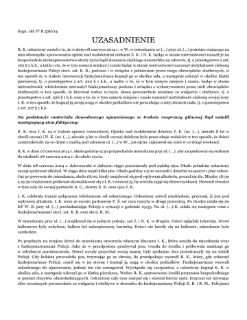 Sygn. akt IV K 528/14 UZASADNIENIE R. K. oskarżony został o to, że w dniu 08 czerwca 2014 r. w W. w mieszkaniu nr (...) przy ul. (...) pomimo ciążącego na nim obowiązku sprawowania opieki nad małoletnimi córkami Z. K. i N. K. będąc w stanie nietrzeźwości naraził je na bezpośrednie niebezpieczeństwo utraty życia bądź doznania ciężkiego uszczerbku na zdrowiu, tj. o przestępstwo z art. 160 § 2 k.k., a także o to, że w tym samym miejscu i czasie będąc w stanie nietrzeźwości naruszył nietykalność cielesną funkcjonariusza Policji sierż. szt. K. B., podczas i w związku z pełnieniem przez niego obowiązków służbowych, w ten sposób że w trakcie interwencji funkcjonariusza kopnął go w okolice uda, a następnie uderzył w okolice klatki piersiowej, tj. o przestępstwo z art. 222 § 1 k.k., a nadto o to, że w tym samym miejscu i czasie, będąc w stanie nietrzeźwości, wielokrotnie znieważył funkcjonariuszy podczas i związku z wykonywaniem przez nich obowiązków służbowych w ten sposób, że kierował wobec w/wym. słowa powszechnie uważane za wulgarne i obelżywe, tj. o przestępstwo z art. 226 § 1 k.k. oraz o to, że w tym samym miejscu i czasie naruszył nietykalność cielesną swojej żony I. K. w ten sposób, że kopnął ją swoją nogą w okolice pośladków nie powodując u niej obrażeń ciała, tj. o przestępstwo z art. 217 § 1 k.k. Na podstawie materiału dowodowego ujawnionego w trakcie rozprawy głównej Sąd ustalił następujący stan faktyczny: R. K. oraz I. K. są w trakcie sprawy rozwodowej. Opieka nad małoletnimi dziećmi Z. K. (ur. (...), niecałe 8 lat w chwili czynu) i N. K. (ur. (...), niecałe 5 lat w chwili czynu) dzielona była przez oboje rodziców w ten sposób, że dzieci zamieszkiwały na co dzień z matką pod adresem ul. (...) w W., zaś ojciec zajmował się nimi w co drugi weekend. R. K. w dniu 07 czerwca 2014 r. około godziny 9:30 przyjechał do mieszkania przy ul. (...), aby zaopiekować się córkami do niedzieli 08 czerwca 2014 r. do około 19:00. W dniu 08 czerwca 2014 r. dziewczynki w dalszym ciągu pozostawały pod opieką ojca. Około południa oskarżony zaczął spożywać alkohol. W ciągu dnia wypił kilka piw. Około godziny 14:00 wyszedł z dziećmi na spacer i plac zabaw. Już po powrocie do mieszkania, około 18:00, kiedy znajdował się pod wpływem alkoholu, poczuł się źle. Między 18:30 a 19:30 trzykrotnie próbował skontaktować się z I. K. i wezwać ją, by wróciła zająć się dziewczynkami. Dzwonił również w tym celu do swojej partnerki A. C., siostry E. K. oraz ojca J. K.. I. K. odebrała trzecie połączenie telefoniczne od oskarżonego. Oskarżony mówił nieskładnie, przyznał, iż jest pod wpływem alkoholu. I. K. wraz ze swoim partnerem P. Ś. od razu ruszyła w drogę powrotną. Po drodze udała się do KP W. B. przy ul. (...) powiadamiając Policję o sytuacji o godzinie 19:55. Na ul. (...)-K. udała się następnie wraz z funkcjonariuszami sierż. szt. K. B. oraz sierż. R. M.. W mieszkaniu przy ul. (...) znajdował się w jednym pokoju, zaś Z. i N. K. w drugim. Dzieci oglądały telewizję. Drzwi balkonowe były uchylone, balkon był zabezpieczony barierką. Dzieci nie bawiły się na balkonie, mieszkanie było zamknięte. Po przybyciu na miejsce drzwi do mieszkania otworzyła własnym kluczem I. K., która weszła do mieszkania wraz z funkcjonariuszami Policji. Jako że w przedpokoju przebywał pies, weszła do środka i próbowała zamknąć go w odrębnym pomieszczeniu. Dzieci wyszły przywitać swoją mamę, były spokojne, lecz przestraszyły się na widok Policji. Gdy kobieta prowadziła psa, trzymając go za obrożę, do przedpokoju wyszedł R. K., który, gdy zobaczył funkcjonariuszy Policji, rzucił się w jej stronę i kopnął ją nogą w okolicę pośladków. Funkcjonariusze wezwali oskarżonego do opanowania, jednak ten nie zareagował. Wywiązała się szarpanina, a oskarżony kopnął K. B. w okolicę uda, a następnie uderzył go w klatkę piersiową. Wobec R. K. zastosowano środki przymusu bezpośredniego w postaci chwytów obezwładniających. Oskarżony cały czas szarpał się i stawiał bierny opór, krzyczał też używając słów uważanych powszechnie za wulgarne i obelżywe w stosunku do funkcjonariuszy Policji K. B. i R. M.. Policjanci dokonali zatrzymania oskarżonego, a następnie doprowadzili go do radiowozu. Świadkami zatrzymania oskarżonego byli jego partnerka A. C., siostra E. K. i ojciec J. K., którzy przybyli na miejsce na prośbę oskarżonego. Oskarżony przewieziony został do KP W. B., gdzie poddano go badaniu stanu trzeźwości. Pierwszy pomiar dokonany o godzinie 20:57 wykazał 1.17 mg/l, zaś kolejny z godziny 21:34 – 1.03 mg/l alkoholu w wydychanym powietrzu. Powyższy stan faktyczny Sąd ustalił na podstawie: częściowo wyjaśnień oskarżonego (k. 34-35, 69, 174-177), częściowo zeznań oskarżycielki posiłkowej I. K. (k. 8-10, 244-246), zeznań pokrzywdzonych K. B. (k. 13, 243-244) i R. M. (k. 17-18, 177-178), częściowo zeznań świadka A. C. (k. 270-271), zeznań świadka E. K. (k. 271—272) oraz częściowo zeznań świadka P. Ś. (k. 272-274), a także protokołu zatrzymania (k. 2), protokołu badania alkometrem (k. 4), świadectwa wzorcowania (k. 5), protokołu przeszukania (k. 6-7), kwestionariusza szacowania ryzyka (k. 22-23), informacji z centralnej ewidencji (k. 24), niebieskiej karty (k. 39-45), zaświadczenia (k. 46), informacji o zgłoszeniach (k. 49-56), informacji z Ośrodka dla Osób Nietrzeźwych (k. 61-62), zaświadczenia (k. 92, 93), dokumentacji medycznej (k. 94-98), wniosku egzekucyjnego (k. 99-100, 134-135), protokołu z 19/06/2013 roku (k. 101-103), dowodów przelewów (k. 126-129), aktu notarialnego (k. 130-133), wyroku Sądu Okręgowego Warszawa P. (k. 197-209), pism procesowych (k. 210, 211, 212-216, 217-222), wypisu aktu notarialnego (k. 223-226), protokołu z 03/02/2015 roku (k. 2