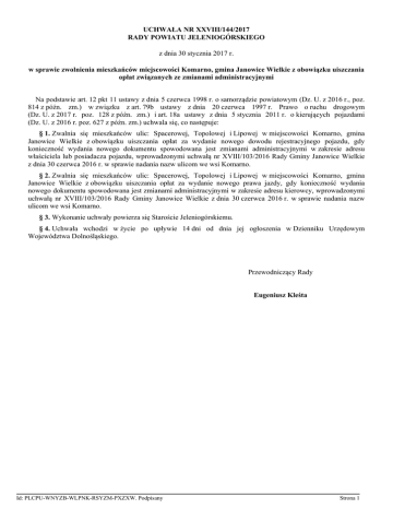 UCHWAŁA NR XXVIII/144/2017 RADY POWIATU JELENIOGÓRSKIEGO z dnia 30 stycznia 2017 r. w sprawie zwolnienia mieszkańców miejscowości Komarno, gmina Janowice Wielkie z obowiązku uiszczania opłat związanych ze zmianami administracyjnymi Na podstawie art. 12 pkt 11 ustawy z dnia 5 czerwca 1998 r. o samorządzie powiatowym (Dz. U. z 2016 r., poz. 814 z późn. zm.) w związku z art. 79b ustawy z dnia 20 czerwca 1997 r. Prawo o ruchu drogowym (Dz. U. z 2017 r. poz. 128 z późn. zm.) i art. 18a ustawy z dnia 5 stycznia 2011 r. o kierujących pojazdami (Dz. U. z 2016 r. poz. 627 z późn. zm.) uchwala się, co następuje: § 1. Zwalnia się mieszkańców ulic: Spacerowej, Topolowej i Lipowej w miejscowości Komarno, gmina Janowice Wielkie z obowiązku uiszczania opłat za wydanie nowego dowodu rejestracyjnego pojazdu, gdy konieczność wydania nowego dokumentu spowodowana jest zmianami administracyjnymi w zakresie adresu właściciela lub posiadacza pojazdu, wprowadzonymi uchwałą nr XVIII/103/2016 Rady Gminy Janowice Wielkie z dnia 30 czerwca 2016 r. w sprawie nadania nazw ulicom we wsi Komarno. § 2. Zwalnia się mieszkańców ulic: Spacerowej, Topolowej i Lipowej w miejscowości Komarno, gmina Janowice Wielkie z obowiązku uiszczania opłat za wydanie nowego prawa jazdy, gdy konieczność wydania nowego dokumentu spowodowana jest zmianami administracyjnymi w zakresie adresu kierowcy, wprowadzonymi uchwałą nr XVIII/103/2016 Rady Gminy Janowice Wielkie z dnia 30 czerwca 2016 r. w sprawie nadania nazw ulicom we wsi Komarno. § 3. Wykonanie uchwały powierza się Staroście Jeleniogórskiemu. § 4. Uchwała wchodzi w życie po upływie 14 dni od dnia jej ogłoszenia w Dzienniku Urzędowym Województwa Dolnośląskiego. Przewodniczący Rady Eugeniusz Kleśta Id: PLCPU-WNYZB-WLPNK-RSYZM-PXZXW. Podpisany Strona 1 Uzasadnienie Do wyłącznej właściwości rady powiatu zgodnie z ustawą z dnia 5 czerwca 1998 r. o samorządzie powiatowym należy podejmowanie uchwał w innych sprawach zastrzeżonych ustawami do kompetencji rady powiatu. Art.79b ustawy z dnia 20 czerwca 1997 r. Prawo o ruchu drogowym stanowi, że w przypadku gdy zmiana stanu faktycznego w zakresie adresu właściciela lub posiadacza pojazdu, wymagająca wydania nowego dowodu rejestracyjnego pojazdu, spowodowana została zmianami administracyjnymi, rada powiatu może, w drodze uchwały, zmniejszyć opłatę lub zwolnić od jej uiszczenia osoby obowiązane do ubiegania się o wydanie tego dokumentu. Według art. 18a ustawy z dnia 5 stycznia 2011 r. o kierujących pojazdami, w przypadku gdy zmiana stanu faktycznego w zakresie adresu kierowcy wymagająca wydania nowego prawa jazdy lub pozwolenia na kierowanie tramwajem, spowodowana została zmianami administracyjnymi, rada powiatu może, w drodze uchwały, zmniejszyć opłatę za wydanie lub zwolnić od jej uiszczenia osoby obowiązane do ubiegania się o wydanie tych dokumentów. Gmina Janowice Wielkie uchwałą nr XVIII/103/2016 Rady Gminy Janowice Wielkie z dnia 30 czerwca 2016 r. w sprawie nadania nazw ulicom we wsi Komarno dokonała zmiany administracyjnej polegającej na utworzeniu nazw ulic dla działek nr 466/2 i 450/7, 351, 350 w Komarnie gm. Janowice Wielkie. Działki te otrzymały oficjalne nazwy ulic – Spacerowa, Lipowa, Topolowa, co wynikło z konsultacji społecznych w tej sprawie. Bezpośrednią przyczyną podjęcia uchwały był zamiar usunięcia istniejących od 1987 r. skomplikowanych i mylących adresów z rozszerzeniem „PPH”, które pochodziły z jeszcze dawniejszych czasów, gdy budynki dawnego Przedsiębiorstwa Produkcyjno-Handlowego z siedzibą w Wojanowie (tzw. pegieeru) rozproszone na terenie części wsi otrzymywały takie właśnie rozszerzenie adresowe, mimo braku formalnej legalizacji tego rozszerzenia. Przez lata nie formalizowano tego rozszerzenia podczas wykupu mieszkań przez byłych pracowników przedsiębiorstwa od Skarbu Państwa. Doprowadziło to do błędów meldunkowych, przekładających się na sytuację własnościową i meldunkową poszczególnych osób, gdyż nie było podstaw dla rozróżnienia np. Komarna 10 i Komarna nr 10 PPH. Nieścisłości obejmują księgi wieczyste, adresy zameldowania w poszczególnych lokalach, co ma znaczenie np. dla poszukiwań policyjnych, prawa zamieszkiwania w lokalu czy prawa kandydowania i głosowania na radnego w poszczególnych okręgach. Dodatkowo problemem były interwencje służb ratowniczych, np. straży pożarnej, która udała się na akcję pod niewłaściwy adres, gdyż osoby wzywające straż pożarną i zamieszkałe pod tym adresem same nie wiedziały, że obowiązuje je rozszerzenie nazwy. Jedynym skutecznym i przejrzystym sposobem rozwiązania kilkudziesięcioletniego problemu adresowego w części Komarna było nadanie nazw ulic i wraz z nimi nowych numerów budynków. Nie była to zatem kwestia estetyczna, ale była to istotna zmiana o charakterze porządkowym, która pozwala unormować najważniejsze sprawy mieszkańców. Gmina Janowice Wielkie ze swojej strony powiadomiła wszystkie zainteresowane podmioty, dokonała zmian dotyczących mieszkańców w posiadanych rejestrach, przygotowała tablice z nazwami ulic. Nie może jednak ze względów prawnych sfinansować mieszkańcom wsi wymiany dokumentów w Starostwie Powiatowym. Dlatego też celem uchwały jest zwolnienie mieszkańców ulic Spacerowej, Topolowej i Lipowej w Komarnie z opłat za wydanie dokumentów z uwidocznionym nowym adresem, co zwiększy zaufanie mieszkańców do działania władz samorządowych Powiatu Jeleniogórskiego i będzie zgodne z poczuciem społecznej sprawiedliwości. W tej sprawie mieszkańcy i radni Rady Gminy za pośrednictwem Wójta Gminy Janowice Wielkie interweniowali, składając wniosek w dniu 19 lipca br. o podjęcie inicjatywy uchwałodawczej przez Zarząd Powiatu, uzyskując w międzyczasie (wydane 3 października br.) stanowisko Zarządu Powiatu o braku rekomendacji dla podjęcia uchwały o