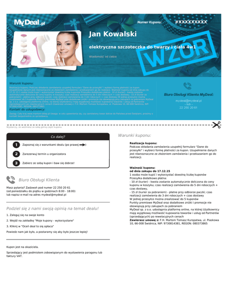 #XXXXXXXXX Jan Kowalski elektryczna szczoteczka do twarzy i ciała 4w1 Wiadomość od ciebie Warunki kuponu: Realizacja kuponu: Podczas składania zamówienia uzupełnij formularz "Dane do przesyłki" i wybierz formę płatności za kupon. Uzupełnienie danych jest równoznaczne ze złożeniem zamówienia i przekazaniem go do realizacji. Ważność kuponu:od dnia zakupu do 17.12.15 1 osoba może kupić i wykorzystać dowolną liczbę kuponów Przesyłka dodatkowo płatna:- 10 zł (kurier) - kwota zostanie automatycznie doliczona do ceny kuponu w koszyku; czas realizacji zamówienia do 5 dni roboczych + czas dostawy,- 15 zł (kurier za pobraniem) - płatne przy odbiorze paczki; czas realizacji zamówienia do 3 dni roboczych + czas dostawy W jednej przesyłce można zrealizować do 5 kuponów Punkty premiowe MyDeal oraz dodatkowe zniżki i promocje nie obowiązują przy zakupach za pobraniem MyDeal sp. z o.o. udostępnia platformę online, na której Użytkownicy mają wyjątkową możliwość kupowania towarów i usług od Partnerów (sprzedających) po rewelacyjnych cenach Zawierasz umowę z: F.H. Martom Tomasz Kuropatwa, ul. Piaskowa 10, 66-008 Świdnica, NIP: 9730814381, REGON: 080373865 Kontakt do usługodawcy: Zasięg: Cały kraj www.martom-sklep.pl Uwaga: w celu upewnienia się, czy zamówiony towar dotrze do Państwa przed Świętami, prosimy o kontakt bezpośrednio ze sprzedawcą. Wystarczy, że weźmiesz ze sobą górną część kuponu. Warunki kuponu: Co dalej? Zapoznaj się z warunkami dealu (po prawej ) Zarezerwuj termin u organizatora Realizacja kuponu: Podczas składania zamówienia uzupełnij formularz "Dane do przesyłki" i wybierz formę płatności za kupon. Uzupełnienie danych jest równoznaczne ze złożeniem zamówienia i przekazaniem go do realizacji. Zabierz ze sobą kupon i baw się dobrze! Biuro Obsługi Klienta Masz pytania? Zadzwoń pod numer 22 250 20 61 (od poniedziałku do piątku w godzinach 8:00 - 18:00) lub napisz e-mail na adres [email protected] Podziel się z nami swoją opinią na temat dealu! 1. Zaloguj się na swoje konto 2. Wejdź na zakładkę "Moje kupony - wykorzystane" 3. Kliknij w "Oceń deal to się opłaca" Powiedz nam jak było, a postaramy się aby było jeszcze lepiej! Kupon jest na okaziciela. Sprzedający jest podmiotem zobowiązanym do wystawienia paragonu lub faktury VAT. Ważność kuponu: od dnia zakupu do 17.12.15 1 osoba może kupić i wykorzystać dowolną liczbę kuponów Przesyłka dodatkowo płatna: - 10 zł (kurier) - kwota zostanie automatycznie doliczona do ceny kuponu w koszyku; czas realizacji zamówienia do 5 dni roboczych + czas dostawy, - 15 zł (kurier za pobraniem) - płatne przy odbiorze paczki; czas realizacji zamówienia do 3 dni roboczych + czas dostawy W jednej przesyłce można zrealizować do 5 kuponów Punkty premiowe MyDeal oraz dodatkowe zniżki i promocje nie obowiązują przy zakupach za pobraniem MyDeal sp. z o.o. udostępnia platformę online, na której Użytkownicy mają wyjątkową możliwość kupowania towarów i usług od Partnerów (sprzedających) po rewelacyjnych cenach Zawierasz umowę z: F.H. Martom Tomasz Kuropatwa, ul. Piaskowa 10, 66-008 Świdnica, NIP: 9730814381, REGON: 080373865
