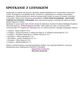 SPOTKANIE Z LEŚNIKIEM Drapieżniki od wieków fascynowały człowieka, jednak podglądanie ich w przyrodzie często bywa trudne. Szczególnie w przypadku bardzo ostrożnych i wyposażonych w świetny wzrok ptaków drapieżnych. Obserwowanie tych zwierząt wymaga dużej wiedzy na temat ich biologii, zachowań i zwyczajów. Bardzo dużo informacji pozyskaliśmy od Pana Pawła Kowalskiego – pracownika Nadleśnictwa Piotrków Trybunalski, który był naszym gościem i podzielił się wiedzą na temat ptaków żyjących w Polsce. Spotkanie w naszej szkole było również okazją do ogłoszenia wyników XI edycji Szkolnego Konkursu Przyrodniczego pn. „Ptaki drapieżne Europy”, który odbył się w dniu 13 stycznia 2016 r. Uczniowie klas V-VI napisali test składający się z 21 zadań otwartych, zajmując następujące miejsca: ● ● ● ● ● ● ● I miejsce - Nadia Łaska kl. VI B II miejsce - Damian Roczek kl. V A/Patrycja Zając kl. VI A/Nadia Dziechcińska kl. VI A V miejsce - Dominika Papiernik kl. V B/Anna Krasoń kl. VI A VII miejsce - Oskar Łukowski kl. V B VIII miejsce - Joanna Staśkiewicz kl. V A IX miejsce - Oliwi Gałwa kl. VI B X miejsce - Mikołaj Kulbat kl. V A Każdy uczestnik konkursu otrzymał pamiątkowy dyplom, oraz nagrody książkowe i rzeczowe ufundowane przez Nadleśnictwo Piotrków Trybunalski Organizator konkursu: Marzenna Kacprzyk