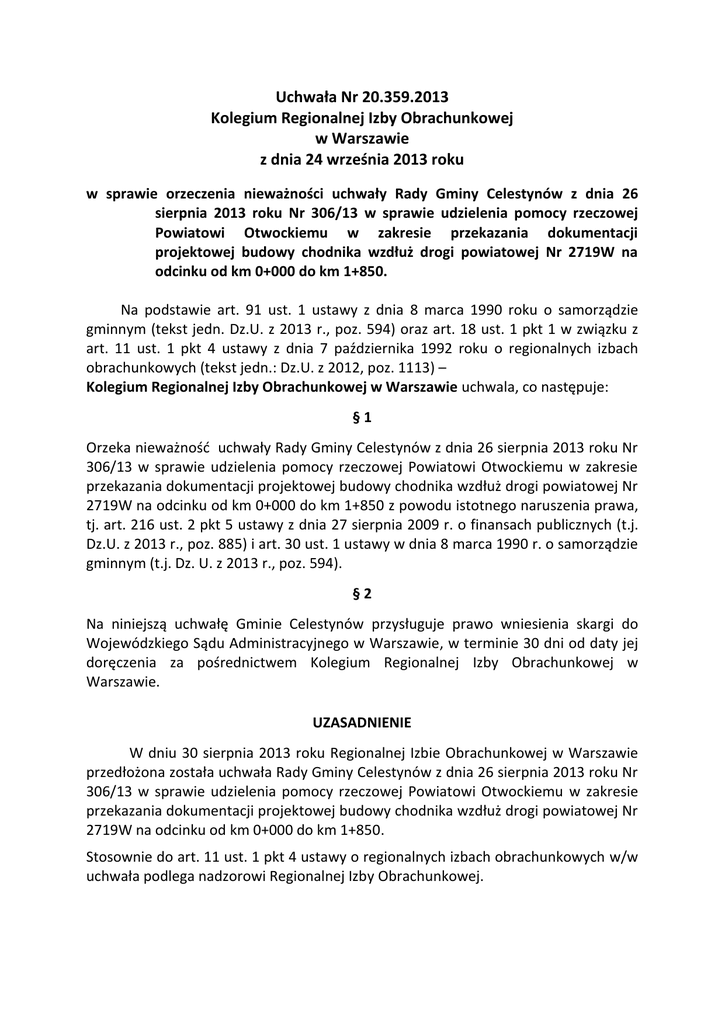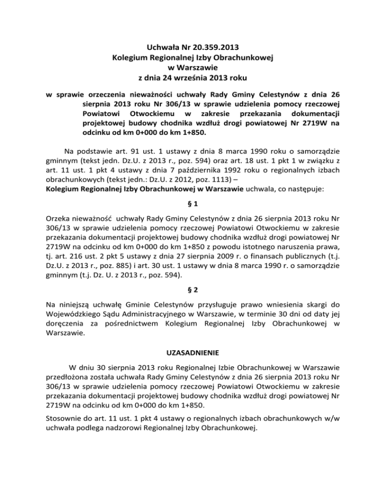 Uchwała Nr 20.359.2013 Kolegium Regionalnej Izby Obrachunkowej w Warszawie z dnia 24 września 2013 roku w sprawie orzeczenia nieważności uchwały Rady Gminy Celestynów z dnia 26 sierpnia 2013 roku Nr 306/13 w sprawie udzielenia pomocy rzeczowej Powiatowi Otwockiemu w zakresie przekazania dokumentacji projektowej budowy chodnika wzdłuż drogi powiatowej Nr 2719W na odcinku od km 0+000 do km 1+850. Na podstawie art. 91 ust. 1 ustawy z dnia 8 marca 1990 roku o samorządzie gminnym (tekst jedn. Dz.U. z 2013 r., poz. 594) oraz art. 18 ust. 1 pkt 1 w związku z art. 11 ust. 1 pkt 4 ustawy z dnia 7 października 1992 roku o regionalnych izbach obrachunkowych (tekst jedn.: Dz.U. z 2012, poz. 1113) – Kolegium Regionalnej Izby Obrachunkowej w Warszawie uchwala, co następuje: §1 Orzeka nieważność uchwały Rady Gminy Celestynów z dnia 26 sierpnia 2013 roku Nr 306/13 w sprawie udzielenia pomocy rzeczowej Powiatowi Otwockiemu w zakresie przekazania dokumentacji projektowej budowy chodnika wzdłuż drogi powiatowej Nr 2719W na odcinku od km 0+000 do km 1+850 z powodu istotnego naruszenia prawa, tj. art. 216 ust. 2 pkt 5 ustawy z dnia 27 sierpnia 2009 r. o finansach publicznych (t.j. Dz.U. z 2013 r., poz. 885) i art. 30 ust. 1 ustawy w dnia 8 marca 1990 r. o samorządzie gminnym (t.j. Dz. U. z 2013 r., poz. 594). §2 Na niniejszą uchwałę Gminie Celestynów przysługuje prawo wniesienia skargi do Wojewódzkiego Sądu Administracyjnego w Warszawie, w terminie 30 dni od daty jej doręczenia za pośrednictwem Kolegium Regionalnej Izby Obrachunkowej w Warszawie. UZASADNIENIE W dniu 30 sierpnia 2013 roku Regionalnej Izbie Obrachunkowej w Warszawie przedłożona została uchwała Rady Gminy Celestynów z dnia 26 sierpnia 2013 roku Nr 306/13 w sprawie udzielenia pomocy rzeczowej Powiatowi Otwockiemu w zakresie przekazania dokumentacji projektowej budowy chodnika wzdłuż drogi powiatowej Nr 2719W na odcinku od km 0+000 do km 1+850. Stosownie do art. 11 ust. 1 pkt 4 ustawy o regionalnych izbach obrachunkowych w/w uchwała podlega nadzorowi Regionalnej Izby Obrachunkowej. W podstawie prawnej uchwały powołano przepisy art. 10 ust. 2, art. 18 ust. 1 ustawy z dnia 8 marca 1990 r. o samorządzie gminnym oraz art. 216 ust. 2 pkt 5 i art. 220 ust. 1 i 2 ustawy z dnia 27 sierpnia 2009 r. o finansach publicznych. Cyt. przepisy ustawy o samorządzie gminnym oraz ustawy o finansach publicznych stanowią o możliwości udzielania sobie przez jednostki samorządu terytorialnego pomocy finansowej i rzeczowej. W treści badanej uchwały Rada Gminy Celestynów postanowiła „udzielić w 2013 roku pomocy rzeczowej Powiatowi Otwockiemu w zakresie przekazania dokumentacji projektowej budowy chodnika wzdłuż drogi powiatowej Nr 2719W na odcinku od km 0+000 do km 1+850”( § 1). Szczegółowe warunki udzielenia pomocy rzeczowej określone zostaną w umowie zawartej pomiędzy Gminą Celestynów a Powiatem Otwockim (§ 2). W cyt. § 2 zawarto również upoważnienie dla Wójta Gminy Celestynów do zawarcia umowy. Jak ustaliło Kolegium, na tej samej sesji Rada podjęła uchwalę Nr 303/13 zmieniającą uchwałę budżetową Gminy Celestynów na 2013 rok. W Załączniku Nr 3 do w/w uchwały ujęte zostało zadanie inwestycyjne pn. „Dokumentacja projektowa chodnika przy drodze powiatowej nr 2719W na odcinku od km 0+000 do km 1+850” (dział 600, rozdz. 60014 §6050) na wykonanie którego zaplanowano 10.000 zł. W Uzasadnieniu do uchwały, w części dotyczącej zmian w Zał. Nr 3, zapisano, iż dokonano „zmiany nazwy zadania inwestycyjnego „Dokumentacja projektowa i budowa chodnika w miejscowości Lasek” na „Dokumentacja projektowa chodnika przy drodze powiatowej nr 2719W na odcinku od km 0+000 do km 1+850”;” W żadnym z zapisów cyt. uchwały ani w uzasadnieniu nie wskazano jednak, iż w/w zadanie ma stanowić pomoc rzeczową udzieloną Powiatowi Otwockiemu. Reasumując, Kolegium stwierdziło, co następuje: Uprawnienia Rady w zakresie udzielania pomocy, w tym pomocy rzeczowej dla innych jednostek samorządowych, wynikają z przepisów art. 10 ust. 2 ustawy o samorządzie gminnym i art. 220 ustawy o finansach publicznych. W świetle regulacji cyt. art. 220 ust 2 podstawą udzielenia pomocy jest umowa. Rada w odrębnej uchwale ma zaś określić w/w pomoc, do czego obliguje ją przepis art. 216 ust. 2 pkt 5 cyt. ustawy o finansach publicznych. Uchwała rady gminy w sprawie udzielenia pomocy, w tym rzeczowej innej jednostce samorządowej powinna – w ocenie Kolegium – w sposób jednoznaczny określać zarówno tę pomoc jak i jej wysokość. Tylko organ stanowiący bowiem jest uprawniony do podjęcia decyzji o przyznaniu pomocy i winien określić ją w uchwale. Nie określając wysokości pomocy rzeczowej, której zamierza udzielić Gmina Celestynów Powiatowi Otwockiemu, Rada Gminy Celestynów naruszyła cytowane przepisy regulujące kwestie pomocy udzielonej między jednostkami samorządu terytorialnego, a w szczególności art. 216 ust. 2 pkt 5 ustawy o finansach publicznych. Ponadto Kolegium zwraca uwagę, iż zawarte w § 2 badanej uchwały upoważnienie dla Wójta Gminy Celestynów do zawarcia umowy nie znajduje 2 umocowania w powołanych wyżej przepisach i stanowi ingerencję Rady w wyłączne kompetencje organu wykonawczego jednostki samorządu terytorialnego, o której mowa także w art. 30 ust. 1 ustawy o samorządzie gminnym. Przepis ten stanowi, iż wójt (burmistrz, prezydent) wykonuje uchwały rady gminy i zadania gminy określone przepisami prawa, o czym zresztą Rada Gminy Celestynów postanowiła w § 3 uchwały. Przepisy ustawy o samorządzie gminnym wyraźnie rozgraniczają zakres kompetencji przyznanych poszczególnym organom gminy tj. radzie oraz wójtowi (burmistrzowi, prezydentowi). Organy te są zobowiązane przestrzegać w poszczególnych sprawach swoich kompetencji i wydanie aktu wykraczającego poza uprawnienie ustawowe jest sprzeczne z prawem. W ocenie Kolegium Izby Ra