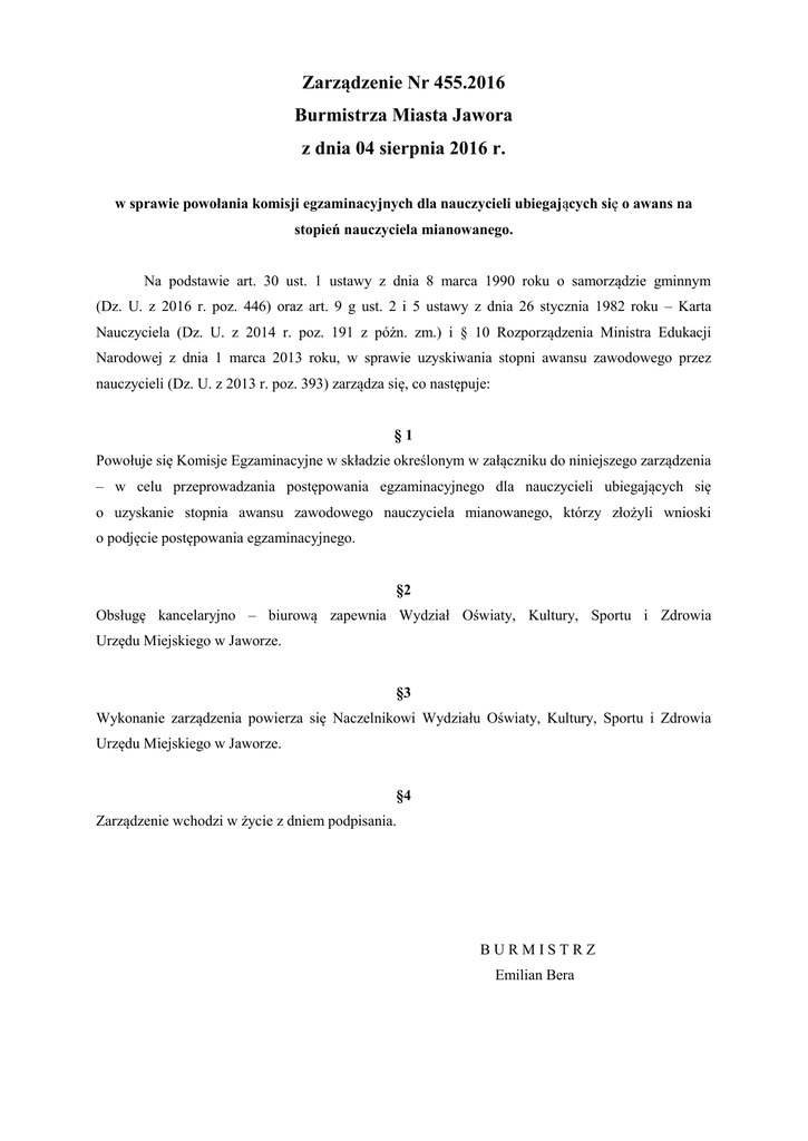 Zarządzenie Nr 455.2016 Burmistrza Miasta Jawora z dnia 04 sierpnia 2016 r. w sprawie powołania komisji egzaminacyjnych dla nauczycieli ubiegających się o awans na stopień nauczyciela mianowanego. Na podstawie art. 30 ust. 1 ustawy z dnia 8 marca 1990 roku o samorządzie gminnym (Dz. U. z 2016 r. poz. 446) oraz art. 9 g ust. 2 i 5 ustawy z dnia 26 stycznia 1982 roku – Karta Nauczyciela (Dz. U. z 2014 r. poz. 191 z późn. zm.) i § 10 Rozporządzenia Ministra Edukacji Narodowej z dnia 1 marca 2013 roku, w sprawie uzyskiwania stopni awansu zawodowego przez nauczycieli (Dz. U. z 2013 r. poz. 393) zarządza się, co następuje: §1 Powołuje się Komisje Egzaminacyjne w składzie określonym w załączniku do niniejszego zarządzenia – w celu przeprowadzania postępowania egzaminacyjnego dla nauczycieli ubiegających się o uzyskanie stopnia awansu zawodowego nauczyciela mianowanego, którzy złożyli wnioski o podjęcie postępowania egzaminacyjnego. §2 Obsługę kancelaryjno – biurową zapewnia Wydział Oświaty, Kultury, Sportu i Zdrowia Urzędu Miejskiego w Jaworze. §3 Wykonanie zarządzenia powierza się Naczelnikowi Wydziału Oświaty, Kultury, Sportu i Zdrowia Urzędu Miejskiego w Jaworze. §4 Zarządzenie wchodzi w życie z dniem podpisania. BURMISTRZ Emilian Bera Załącznik do zarządzenia Nr 455.2016 Burmistrza Miasta Jawora z dnia 04 sierpnia 2016 r. Komisje egzaminacyjne dla nauczycieli ubiegających się o awans na stopień nauczyciela mianowanego w składzie: I. Komisja dla pani Agnieszki Romanowskiej – nauczyciela języka angielskiego – Szkoła Podstawowa Nr 1 w Jaworze: 1.Przedstawiciel organu prowadzącego szkołę – Agnieszka Rynkiewicz – przewodnicząca, 2. Przedstawiciel organu nadzoru pedagogicznego – Irena Benroth, 3. Ekspert z listy MEN –Beata Jankiewicz, 4. Ekspert z listy MEN –Krzysztof Dziurla, 5. Dyrektor Szkoły, w której zatrudniony jest nauczyciel – Mariola Pajdzik. Praca Komisji rozpocznie się o godz. 1300 dnia 25 sierpnia 2016 r. w Urzędzie Miejskim w Jaworze- Wydział Oświaty, Kultury, Sportu i Zdrowia, ul. Zamkowa 2, I piętro. II. Komisja dla pani Natalii Głuszko – nauczyciela języka angielskiego – Szkoła Podstawowa Nr 1 w Jaworze: 1.Przedstawiciel organu prowadzącego szkołę – Agnieszka Rynkiewicz – przewodnicząca, 2. Przedstawiciel organu nadzoru pedagogicznego – Irena Benroth, 3. Ekspert z listy MEN –Beata Jankiewicz, 4. Ekspert z listy MEN – Krzysztof Dziurla, 5. Dyrektor Szkoły, w której zatrudniony jest nauczyciel – Mariola Pajdzik, 6. Przedstawiciel Związku Nauczycielstwa Polskiego – Stanisław Mazurek. Praca Komisji rozpocznie się o godz. 1400 dnia 25 sierpnia 2016 r. w Urzędzie Miejskim w Jaworze- Wydział Oświaty, Kultury, Sportu i Zdrowia, ul. Zamkowa 2, I piętro. III. Komisja dla pana Łukasza Tomaszewskiego – nauczyciela wychowania fizycznego – Szkoła Podstawowa Nr 5 w Jaworze: 1.Przedstawiciel organu prowadzącego szkołę – Agnieszka Rynkiewicz – przewodnicząca, 2. Przedstawiciel organu nadzoru pedagogicznego – Irena Benroth, 3. Ekspert z listy MEN – Beata Jankiewicz, 4. Ekspert z listy MEN – Krzysztof Dziurla, 5. Dyrektor Szkoły, w której zatrudniony jest nauczyciel – Regina Michalak. Praca Komisji rozpocznie się o godz. 1500 dnia 25 sierpnia 2016 r. w Urzędzie Miejskim w Jaworze- Wydział Oświaty, Kultury, Sportu i Zdrowia, ul. Zamkowa 2, I piętro. IV. Komisja dla pani Kingi Uszyłło – obecnie nauczyciela zatrudnionego w Szkole Podstawowej Nr 5 w Jaworze – nauczanie wczesnoszkolne (część stażu jako nauczyciel przedszkola – Przedszkole Publiczne Nr 4 w Jaworze): 1.Przedstawiciel organu prowadzącego szkołę – Agnieszka Rynkiewicz – przewodnicząca, 2. Przedstawiciel organu nadzoru pedagogicznego – Irena Benroth, 3. Ekspert z listy MEN –Jolanta Nowak, 4. Ekspert z listy MEN – Alicja Łukjanowicz, 5. Dyrektor Szkoły, w której zatrudniony jest nauczyciel – Regina Michalak. Praca Komisji rozpocznie się o godz. 900 dnia 26 sierpnia 2016 r. w Urzędzie Miejskim w Jaworze- Wydział Oświaty, Kultury, Sportu i Zdrowia, ul. Zamkowa 2, I piętro. V. Komisja dla pani Justyny Damjan – obecnie nauczyciela zatrudnionego w Szkole Podstawowej Nr 1 w Jaworze – nauczanie wczesnoszkolne (część stażu jako nauczyciel przedszkola – Przedszkole Publiczne Nr 4 w Jaworze): 1.Przedstawiciel organu prowadzącego szkołę – Agnieszka Rynkiewicz – przewodnicząca, 2. Przedstawiciel organu nadzoru pedagogicznego – Irena Benroth, 3. Ekspert z listy MEN –Jolanta Nowak, 4. Ekspert z listy MEN – Alicja Łukjanowicz, 5. Dyrektor Szkoły, w której zatrudniony jest nauczyciel – Mariola Pajdzik. Praca Komisji rozpocznie się o godz. 1000 dnia 26 sierpnia 2016 r. w Urzędzie Miejskim w Jaworze- Wydział Oświaty, Kultury, Sportu i Zdrowia, ul. Zamkowa 2, I piętro. VI. Komisja dla pani Anetty Dutkiewicz – nauczyciela przedszkola – Przedszkole Publiczne Nr 8: 1.Przedstawiciel organu prowadzącego szkołę – Agnieszka Rynkiewicz – przewodnicząca, 2. Przedstawiciel organu nadzoru pedagogicznego – Irena Benroth, 3. Ekspert z listy MEN –Jolanta Nowak, 4. Ekspert z listy MEN – Alicja Łukjanowicz, 5. Dyrektor Szkoły, w której zatrudniony jest nauczyciel – Maria Żurawska. Praca Komisji rozpocznie się o godz. 1100 dnia 26 sierpnia 2016 r. w Urzędzie Miejskim w Jaworze- Wydział Oświaty, Kultury, Sportu i Zdrowia, ul. Zamkowa 2, I piętro.
