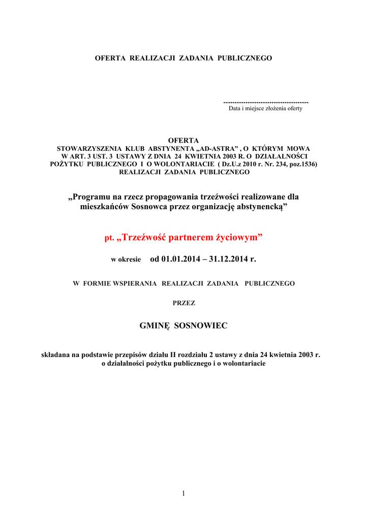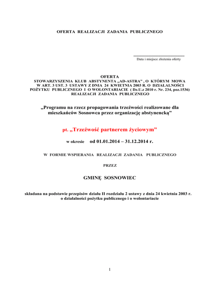 OFERTA REALIZACJI ZADANIA PUBLICZNEGO .............................................. Data i miejsce złożenia oferty OFERTA STOWARZYSZENIA KLUB ABSTYNENTA „AD-ASTRA” , O KTÓRYM MOWA W ART. 3 UST. 3 USTAWY Z DNIA 24 KWIETNIA 2003 R. O DZIAŁALNOŚCI POŻYTKU PUBLICZNEGO I O WOLONTARIACIE ( Dz.U.z 2010 r. Nr. 234, poz.1536) REALIZACJI ZADANIA PUBLICZNEGO „Programu na rzecz propagowania trzeźwości realizowane dla mieszkańców Sosnowca przez organizację abstynencką” pt. „Trzeźwość partnerem życiowym” w okresie od 01.01.2014 – 31.12.2014 r. W FORMIE WSPIERANIA REALIZACJI ZADANIA PUBLICZNEGO PRZEZ GMINĘ SOSNOWIEC składana na podstawie przepisów działu II rozdziału 2 ustawy z dnia 24 kwietnia 2003 r. o działalności pożytku publicznego i o wolontariacie 1 I . Dane oferenta: 1. Nazwa : Stowarzyszenie Klub Abstynenta „Ad-Astra” 2. Forma prawna: Stowarzyszenie 3. Nr. w Krajowym Rejestrze Sądowym KRS 0000101280 4. Data wpisu, rejestracji lub utworzenia: 13 grudnia 1988 r. 5. Nr. NIP 6442775132 Nr. Regon 273335625 6. Adres: miejscowość : dzielnica lub inna jednostka pomocnicza ; gmina : Sosnowiec powiat: województwo: Śląskie kod pocztowy: 41-200 poczta: 7. Tel: 32 266 96 35 , kom. 507 195 965 e-mail: adastra_sosnowiec @ op.pl faks: Sosnowiec ul. 3 Maja 11 Centrum Sosnowiec Sosnowiec - http:// www. ad-astra.rzsa.pl 8. Numer rachunku bankowego: 77 1090 2008 0000 0001 1558 6624 Nazwa banku: Bank Zachodni WBK Oddział Sosnowiec 9. Nazwiska i imiona osób upoważnionych do reprezentowania Stowarzyszenia: a) Zbigniew Świtała b) Janina Chochół 10. Nazwa, adres i telefon kontaktowy jednostki organizacyjnej bezpośrednio wykonującej zadanie, o którym mowa w ofercie: Stowarzyszenie Klub Abstynenta „Ad-Astra” 41-200 Sosnowiec ul. 3 Maja 11 Tel. 32 266 96 35 tel. kom. 507 195 965 11. Osoba upoważniona do składania wyjaśnień dotyczących oferty: Zbigniew Świtała tel. 507 195 965 12. Przedmiot działalności pożytku publicznego: a) działalność nieodpłatna pożytku publicznego * ułatwienie dostępności do różnych form pomocy terapeutycznej i rehabilitacyjnej dla osób uzależnionych od alkoholu po zakończeniu programu psychoterapii w zakładzie lecznictwa odwykowego oraz członków ich rodzin i dzieci. * stworzenie alternatywnego środowiska dla osób pragnących wyjść z uzależnień. * udzielanie informacji i pomocy w kwestii wyboru metod i sposobów leczenia. 2 * * * * * * * * * * * * * organizowanie różnorodnych form zajęć psychoterapeutycznych i z zakresu oświaty zdrowotnej tworzenie osobom uzależnionym warunków do spędzania wolnego czasu w atmosferze trzeźwości. wspieranie i pomoc w organizowaniu wypoczynku dzieci, młodzieży oraz dorosłych. upowszechnianie krajoznawstwa, kultury fizycznej i sportu. prowadzenie obozów terapeutycznych i szkoleń z zakresu wiedzy o uzależnieniach i współuzależnieniach oraz innych form adaptacji dla członków Stowarzyszenia i ich rodzin. doradztwo i pomoc informacyjno-organizacyjna dla członków Stowarzyszenia oraz inicjowanie innych form działań sprzyjających rozwojowi statutowych celów Stowarzyszenia. prowadzenie działalności integrującej członków Stowarzyszenia poprzez aktywność kulturalną, sportową, rekreacyjną, towarzyską oraz podtrzymywanie tradycji narodowych. organizowanie w klubie i poza nim spotkań z przedstawicielami różnych środowisk celem przedstawienia pracy klubu i jego form działania, działania na rzecz szerokiej publiczności poprzez udział w festiwalach abstynenckich organizowanie spotkań dyskusyjnych, pogadanek i prelekcji z doświadczonymi terepeutami i psychologami dotyczących problemów uzależnienia i sposobów wychodzenia z uzależnienia pomoc i działalność na rzecz społeczności lokalnej Miasta Sosnowca prowadzenie grup wsparcia i grup samopomocowych dla osób uzależnionych i współuzależnionych edukacja i szkolenia dla członków stowarzyszenia b) działalność odpłatna pożytku publicznego: * wpłaty i dopłaty uczestników projektu 13. jeżeli oferent prowadzi działalność gospodarczą: a) numer wpisu do rejestru przedsiębiorców b) przedmiot działalności gospodarczej - nie posiadamy nie prowadzimy II. Informacja o sposobie reprezentacji oferenta wobec organu administracji publicznej wraz z przytoczeniem podstawy prawnej. nie dotyczy III. Szczegółowy zakres rzeczowy zadania publicznego proponowanego do realizacji 1. Krótka charakterystyka zadania publicznego: Stowarzyszenie posiada certyfikat działań zgodnych ze standardami. * realizacja projektu pt. „Trzeźwość partnerem życiowym” wg standardu programu edukacyjnego dla stowarzyszenia „Ad-Astra” w Sosnowcu w podniesieniu wiedzy i umiejętności osób –członków stowarzyszenia w obszarze profilaktyki i rozwiązywania problemów alkoholowych wśród społeczności lokalnej * realizacja projektu pt. „Trzeźwość partnerem życiowym” wg standardu współpracy stowarzyszenia „Ad-Astra” w Sosnowcu z samorządem lokalnym i podmiotami zewnętrznymi. * realizacja projektu pt. „Trzeźwość partnerem życiowym” wg standardu organizacyjno – formalnego stowarzyszenia „Ad-Astra” w Sosnowcu. * realizacja projektów zadań zgodnych z zadaniami Gminnego Programu Profilaktyki i Rozwiązywania Problemów Alkoholowych oraz Przeciwdziałania Narkomanii dla mieszkańców Sosnowca w 2014 r. * działalność stowarzyszenia „Ad-Astra’ zgodnie z realiami prawa 3 * współpraca z innymi organizacjami i instytucjami w formie informacji o rodzaju pomocy, której może udzielić stowarzyszenie abstynenckie poprzez aktywizację społeczną * wspomaganie procesu trzeźwienia osób po terapii i leczeniu odwykowym * udzielanie wsparcia osobom uzależnionym i członkom ich rodzin * prowadzenie grup wsparcia, rozmów motywacyjnych, informacyjnych i wspierających przez wyznaczone osoby - członków klubu posiadających szkolenia w zakresie I kontaktu i prowadzenia grup 