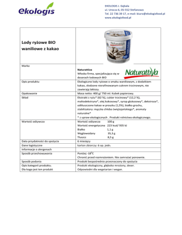 EKOLOGIS J. Gębala ul. Urocza 6, 05-552 Stefanowo Tel. 22 736 39 17, e-mail: [email protected] www.ekologisfood.pl Lody ryżowe BIO waniliowe z kakao Marka Opis produktu Opakowanie Skład Wartość odżywcza Data przydatności do spożycia Dane logistyczne Informacje o alergenach Sposób przechowywania Sposób podania Opis kategorii produktu. Dla kogo jest ten produkt Naturattiva Włoska firma, specjalizująca się w deserach lodowych BIO Ekologiczne lody ryżowe o smaku waniliowym, z dodatkiem kakao, słodzone nierafinowanym cukrem trzcinowym, nie zawierają laktozy. Masa netto: 400 g/ 750 ml. Kubek papierowy. Ekstrakt z ryżu* (62 %), cukier trzcinowy* (12,2 %), maltodekstryna*, olej kokosowy*, syrop glukozowy*, dekstroza*, odtłuszczone kakao w proszku (1,5%), białko grochu, stabilizatory: mączka chleba świętojańskiego*, aromaty naturalne* * z upraw ekologicznych . Produkt rolnictwa ekologicznego. Wartość odżywcza 100 g Wartość energetyczna 223 kcal/ 935 kJ Białko 1,1 g Węglowodany 35,3 g Tłuszcz 8,5 g 6 miesięcy karton zbiorczy: 6 op. jedn. 0 Poniżej -18 C Chronić przed rozmrożeniem. Nie zamrażać ponownie. Produkt bezpośrednio przeznaczony do spożycia Produkt ekologiczny, głęboko mrożony, deser. Odpowiedni dla wegetarian i wegan.