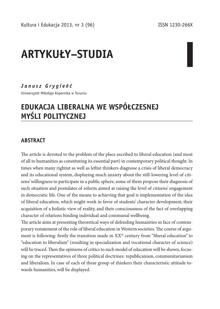 Kultura i Edukacja 2013, nr 3 (96) ISSN 1230-266X ARTYKUŁY–STUDIA Janusz Grygieńć Uniwersytet Mikołaja Kopernika w Toruniu EDUKACJA LIBERALNA WE WSPÓŁCZESNEJ MYŚLI POLITYCZNEJ ABSTRACT The article is devoted to the problem of the place ascribed to liberal education (and most of all to humanities as constituting its essential part) in contemporary political thought. In times when many rightist as well as leftist thinkers diagnose a crisis of liberal democracy and its educational system, displaying much anxiety about the still-lowering level of citizens’ willingness to participate in a public sphere, some of them propose their diagnosis of such situation and postulates of reform aimed at raising the level of citizens’ engagement in democratic life. One of the means to achieving that goal is implementation of the idea of liberal education, which might work in favor of students’ character development, their acquisition of a holistic view of reality, and their consciousness of the fact of overlapping character of relations binding individual and communal wellbeing. The article aims at presenting theoretical ways of defending humanities in face of contemporary restatement of the role of liberal education in Western societies. The course of argument is following: firstly the transition made in XXth century from “liberal education” to “education to liberalism” (resulting in specialization and vocational character of science) will be traced. Then the opinions of critics to such model of education will be shown, focusing on the representatives of three political doctrines: republicanism, communitarianism and liberalism. In case of each of these group of thinkers their characteristic attitude towards humanities, will be displayed. 8 Janusz Grygieńć Key words: liberal education, republicanism, liberalism, communitarianism, democracy, civic virtue, Great Books, humanities 1. Od edukacji liberalnej do proliberalnej Gdy w 1951 roku amerykański filozof i pedagog Mortimer Adler charakteryzował edukację liberalną jako dobro autoteliczne, czynność źródłowo niepraktyczną, nastawioną na realizację celów wewnętrznych, a nie zewnętrznych wobec uczniów, związaną z zarządzaniem czasem wolnym, nie zaś doskonaleniem zdolności umożliwiających późniejsze zarobkowanie (określonym przez Adlera pogardliwie „edukacją niewolników i robotników”), nie mógł przewidzieć, że nadejdzie czas, gdy deprecjacja wykształcenia ogólnego urośnie do rangi kierunku polityki rządów państw demokratycznych1. Podobnie gdy obserwując politykę nazistowskich Niemiec, przestrzegał w 1939 roku, że „demokracja musi utrzymać i rozwijać edukację liberalną lub zginąć”, nie mógł przeczuwać, że hasło to pobrzmiewać będzie także w pracach myślicieli żyjących w warunkach liberalnej demokracji przełomu wieków XX i XXI2. Szereg prac tegoż i wielu innych autorów tworzących na przełomie dziewiętnastego i dwudziestego stulecia i później, broniących edukacji liberalnej w jej znaczeniu pierwotnym, średniowiecznym – jako ogólnego kształcenia zdolności ludzkiego charakteru (poprzez naukę przedmiotów wchodzących w skład trivium i quadrivium) zdaje się odzyskiwać dziś utraconą z czasem aktualność3. Uwaga ta odnosi się zwłaszcza do charakterystycznego stosowania przez nich terminu „liberalny”, niemal całkowicie przeciwnego dzisiejszemu jego używaniu. W ich przypadku, podobnie jak u autorów mediewalnych, odniesienie „liberalnego” do ludzi denotowało jednostki wolne, żyjące dla siebie, w odróżnieniu od niewolników czyniących ze swego życia instrument w rękach innych4. Wolny był dla nich ktoś 1 M. Adler, Labor, Leisure and Liberal Education, „Journal of General Education” 1951, t. 6, s. 35 – 45. 2 M. Adler, Liberalism and Liberal Education, „Educational Record”, lipiec 1939, s. 422 – 436; por. idem, The Crisis in Contemporary Education, „The Social Frontier” 1939, nr 42, t. 5, s. 140 – 145. 3 Zob. m.in. W.P. Atkinson, Liberal Education of the Nineteenth Century, New York 1873; E.T. Fisher, Plan of Institutions Devoted to Liberal Education, New York 1881; F. West, Short Papers on American Liberal Education, New York 1907; E.D. Martin, A Meaning of a Liberal Education, New York 1926. 4 L. Strauss, Wykształcenie liberalne i odpowiedzialność [w:] idem, Sokratejskie pytania. Eseje wybrane, Warszawa 1998, s. 259. Edukacja liberalna we współczesnej myśli politycznej 9 nieprzymuszony do katorżniczej pracy, niesprowadzony wymogami egzystencji do roli wołu. Wolny był dżentelmen, któremu stan posiadania pozwalał na dbałość o przymioty moralne i rozwój osobowości, kto oddawał się edukacji rozwijającej nie tylko podstawowe zdolności pisma czy rachunku, ale też poezji i zarządzania sprawami miasta i swego domu, w kim edukacja ta rozwinęła fundamentalne poczucie odpowiedzialności cywilnej i potrzebę dbałości o współtowarzyszy. Nie każdy mógł aspirować do miana takiego dżentelmena. Na przeszkodzie do wspięcia się na duchowe wyżyny obywatelstwa stanąć mogły bądź to naturalne ograniczenia intelektualne, bądź to stan posiadania uniemożliwiający dbałość o przymioty ducha. Nie każdy potrafił dbać o dobro wspólne. Jeżeli celem ma być sprawiedliwy system polityczny, to powinien mieć on charakter raczej elitarny niż popularny5. Wcześniej jeszcze, przed pisarzami dziewiętnasto- i wczesnodwudziestowiecznymi takie rozumienie edukacji liberalnej długo powielali autorzy identyfikowani dziś z najróżniejszymi doktrynami politycznymi. Podobne zadania – kształcenie ku obywatelskości i rozwijanie najwznioślejszych cech osobowościowych – przypisywał jej John Locke w Myślach o wychowaniu. Zalecana przezeń nauka sztuk wyzwolonych (artes liberales) musiała iść w parze z nauką „dobrych przyzwyczajeń i zasady cnoty i mądrości, dawać po trochu pogląd na ród ludzki