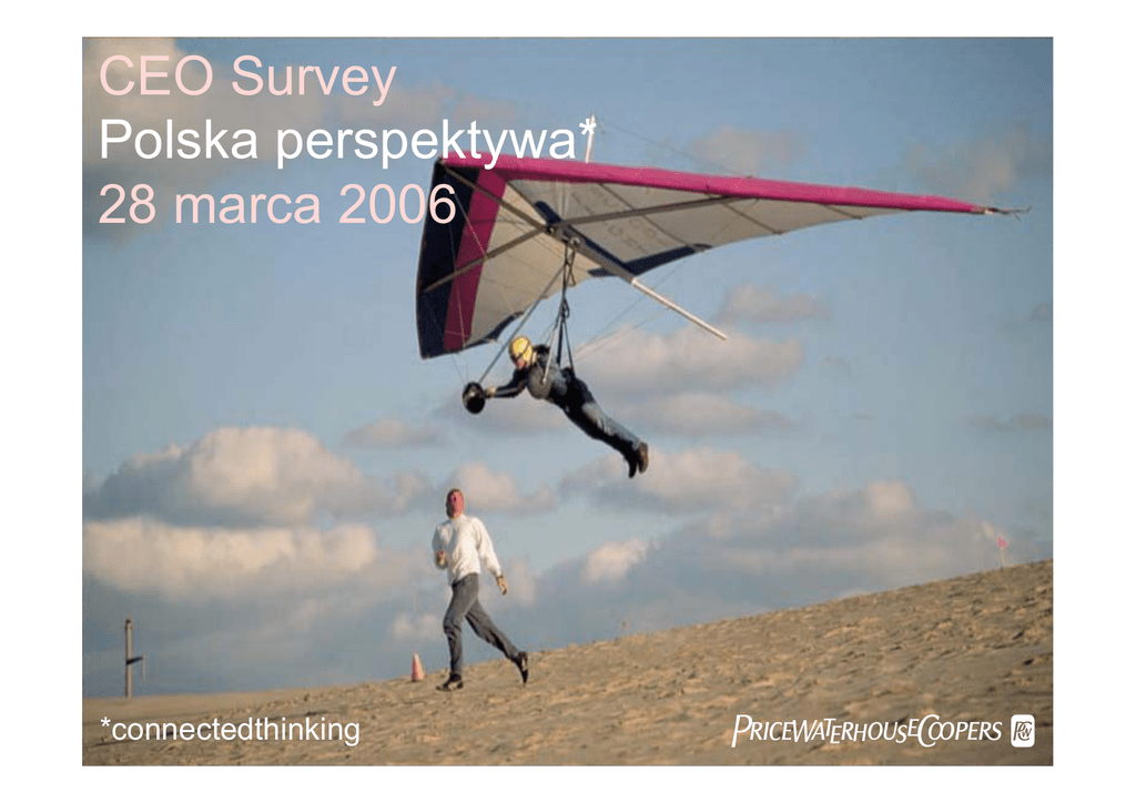 CEO Survey Polska perspektywa* 28 marca 2006 *connectedthinking PwC Agenda Metodologia badania Badanie globalne Globalizacja – polska perspektywa Złożoność – polska perspektywa Główne wnioski Kontakt Metodologia Metodologia badania Badanie globalne Badanie polskie • 33 menedżerów • 1410 menedżerów zarządzających polskimi w 45 krajach firmami (52% z sektora (463 w Europie, produkcji dóbr w tym 23 w Polsce, konsumpcyjnych 301 w Ameryce Południowej, i inwestycyjnych, 331 w Azji i Oceanii, 259 14% z sektora usług w Ameryce Północnej finansowych, 34% z sektora i 56 na Bliskim Wschodzie innych usług). i w Afryce). • Ankietę przeprowadzono • Ankietę przeprowadzono w I kwartale 2006. w IV kwartale 2005. CEO Survey PricewaterhouseCoopers 28 marca 2006 Strona 3 Badanie globalne Annual Global CEO Survey • Globalizacja – koncentracja na krajach BRIC – Brazylia, Rosja, Indie, Chiny. • Złożoność – nieuchronny skutek globalizacji w nowoczesnym biznesie. • Wywiady z czołowymi prezesami (Bank of China, ScheringPlough Corporation, National Australia Bank i in.). CEO Survey PricewaterhouseCoopers 28 marca 2006 Strona 4 Badanie globalne Annual Global CEO Survey – główne wnioski • Globalizacja przestała być jedynie metodą na redukcję kosztów, ale stała się również drogą do zdobywania nowych rynków i sprawniejszej obsługi istniejących klientów. • Globalizacja jest kwestią istotną zarówno dla rozwiniętych, jak i rozwijających się krajów. • Najważniejszymi barierami globalizacji są: nadmierne regulacje, ograniczenia handlu i protekcjonizm, a także niestabilność polityczna i naciski społeczne. • Chociaż prezesi na świecie dostrzegają zalety globalizacji, zdają sobie sprawę z tego, że zwiększa ona stopień skomplikowania biznesu prowadzonego przez ich firmy. • Wśród czynników zwiększających złożoność najczęściej wymieniane są: ekspansja na inne terytoria, fuzje i przejęcia oraz wprowadzanie nowych produktów i usług. CEO Survey PricewaterhouseCoopers 28 marca 2006 Strona 5 Globalizacja - polska perspektywa Globalizacja – polska perspektywa „Globalizacja jest nie do powstrzymania. Niezależnie od położenia geograficznego, rodzaju działalności czy wielkości obrotów, firmy globalizują się, aby uzyskać nowych klientów i dostęp do nowych rynków.” 9. doroczne badanie CEO Survey, PricewaterhouseCoopers CEO Survey PricewaterhouseCoopers 28 marca 2006 Strona 6 Globalizacja - polska perspektywa Globalizacja istotnie wpływa na funkcjonowanie firmy Zarządzający polskimi przedsiębiorstwami postrzegają procesy globalizacyjne podobnie jak menedżerowie w innych krajach świata, choć podchodzą do nich nieco mniej entuzjastycznie. Wpływ globalizacji Bardzo pozytywny Raczej pozytywny Neutralny Polska Świat Raczej negatywny Bardzo negatywny Nie wiem 0 CEO Survey PricewaterhouseCoopers 10 20 30 40 50 60 28 marca 2006 Strona 7 Globalizacja - polska perspektywa Globalizacja przynosi nowe, poważne wyzwania Największym zmartwieniem jest dla polskich menedżerów polityka kursowa i nadmierna regulacja gospodarki. Polskich menedżerów wyróżnia niska ocena zagrożeń wynikających z problemów społecznych. Postrzegane wyzwania globalizacyjne Nadmierne regulacje Krajowa polityka walutowa Korupcja Zmiany układu politycznego/niestabilność polityczna Utrata kapitału intelektualnego Bariery handlowe/protekcjonizm Terroryzm Problemy społeczne Ruch antyglobalistyczny -60 -40 -20 CEO Survey PricewaterhouseCoopers 0 20 40 60 80 100 120 Żadne wyzwanie Małe wyzwanie Duże wyzwanie Jedno z największych wyzwań 28 marca 2006 Strona 8 Globalizacja - polska perspektywa Pola ekspansji zagranicznej Polscy menedżerowie są skłonni szukać swoich największych możliwości ekspansji w Europie Środkowej i Wschodniej. Od menedżerów w innych krajach świata odróżnia ich niskie zainteresowanie ekspansją na Dalekim Wschodzie. Gdzie są największe możliwości rynkowe? Europa Środkowo-Wschodnia Europa Zachodnia Ukraina Rosja Daleki Wschód USA CEO Survey PricewaterhouseCoopers 0% 10% 20% 30% 40% 50% 28 marca 2006 Strona 9 Globalizacja - polska perspektywa Co skłania do ekspansji? Głównym motorem ekspansji jest dla polskich menedżerów zdobycie nowych klientów. Biznesowe motywy ekspansji za granicę Zdobycie nowych klientów Lepsza obsługa obecnych klientów Redukcja kosztów Zwiększenie wydajności Możliwość zatrudnienia wysoko wykwalifikowanych pracowników 0 CEO Survey PricewaterhouseCoopers Kraje rozwinięte 20 40 60 Kraje rozwijające się 80 Polska 100 28 marca 2006 Strona 10 Globalizacja - polska perspektywa Sposoby ekspansji Głównymi wskazanymi przez polskich menedżerów sposobami ekspansji było nawiązanie aliansu z zagranicznym partnerem lub przejęcie firmy zagranicznej. Działania planowane w innych krajach Nawiązywanie współpracy z partnerami (alianse) Udział w fuzjach i przejęciach Otwarcie nowych biur Tworzenie produktów specjalnie dla danego rynku Outsourcing Offshoring CEO Survey PricewaterhouseCoopers 0% 10% 20% 30% 40% 50% 60% 70% 28 marca 2006 Strona 11 Złożoność - polska perspektywa Złożoność – polska perspektywa „Złożoność może być korzystna, jeśli wynika z działań podnoszących wartość firmy. Ale może być niekorzystna, jeśli jest skutkiem presji geopolityki i znajduje się poza kontrolą menedżerów.” 9. doroczne badanie CEO Survey, PricewaterhouseCoopers CEO Survey PricewaterhouseCoopers 28 marca 2006 Strona 12 Złożoność - polska perspektywa Działania podnoszące wartość firmy Polscy menedżerowie zaangażowali się w ciągu minionych 3 lat w szereg aktywności, których celem było zwiększenie wartości ich firm. Intensywność tych działań była niższa niż przeciętnie obserwowana w skali globalnej. Podjęte działania Wprowadzenie nowych produktów i/lub usług Udział w fuzjach i przejęciach Rozszerzenie działalnośc