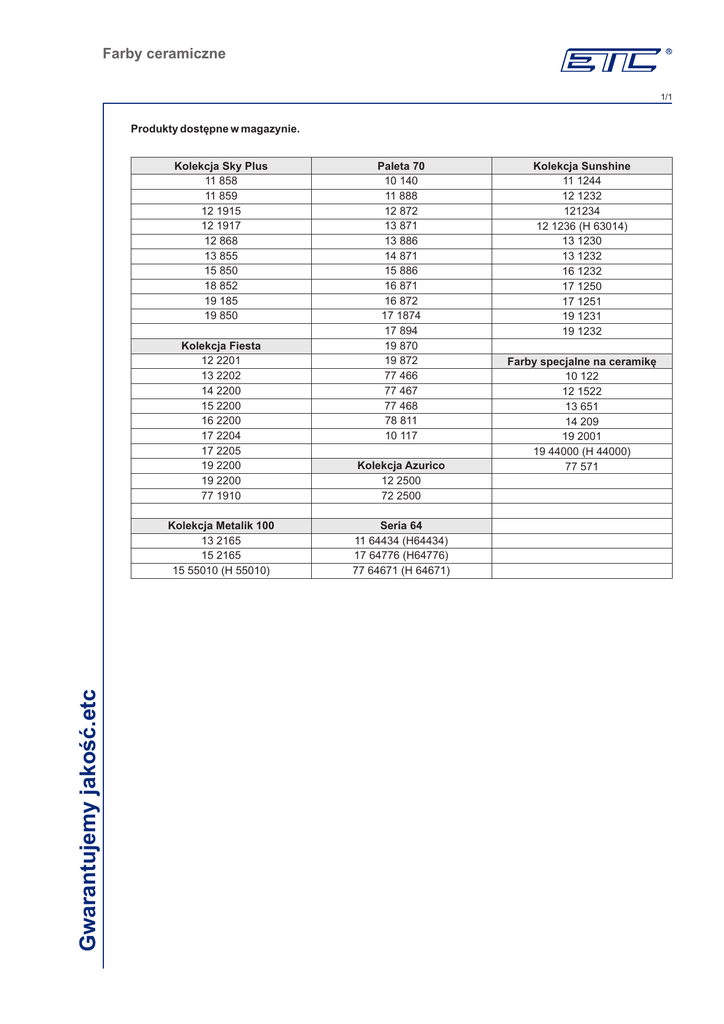 Farby ceramiczne 1/1 Produkty dostępne w magazynie. Gwarantujemy jakość.etc Kolekcja Sky Plus 11 858 11 859 12 1915 12 1917 12 868 13 855 15 850 18 852 19 185 19 850 Paleta 70 10 140 11 888 12 872 13 871 13 886 14 871 15 886 16 871 16 872 17 1874 17 894 19 870 19 872 77 466 77 467 77 468 78 811 10 117 Kolekcja Fiesta 12 2201 13 2202 14 2200 15 2200 16 2200 17 2204 17 2205 19 2200 19 2200 77 1910 Kolekcja Azurico 12 2500 72 2500 Kolekcja Metalik 100 13 2165 15 2165 15 55010 (H 55010) Seria 64 11 64434 (H64434) 17 64776 (H64776) 77 64671 (H 64671) Kolekcja Sunshine 11 1244 12 1232 121234 12 1236 (H 63014) 13 1230 13 1232 16 1232 17 1250 17 1251 19 1231 19 1232 Farby specjalne na ceramikę 10 122 12 1522 13 651 14 209 19 2001 19 44000 (H 44000) 77 571