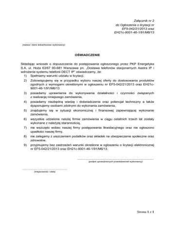 Załącznik nr 2 do Ogłoszenia o licytacji nr EF5-042/21/2013 oraz EH21c-9001-46-1/91/M6/13 .......................................................... (nazwa i dane teleadresowe wykonawcy) OŚWIADCZENIE Składając wniosek o dopuszczenie do postępowania ogłoszonego przez PKP Energetyka S.A. ul. Hoża 63/67 00-681 Warszawa pn. „Dostawa telefonów stacjonarnych Aastra IP i wdrożenie systemu telefonii DECT IP” oświadczamy, że: 1) Spełniamy warunki udziału w licytacji, 2) Zobowiązujemy się w przypadku wyboru naszej oferty do dostosowania produktów zgodnych z wymogami określonymi w ogłoszeniu nr EF5-042/21/2013 oraz EH21c9001-46-1/91/M6/13 3) posiadamy uprawnienia do wykonywania działalności i czynności związanych z realizacją niniejszego zamówienia, 4) posiadamy niezbędną wiedzę i doświadczenie oraz potencjał techniczny a także dysponujemy osobami zdolnymi do wykonania zamówienia, 5) znajdujemy się w sytuacji ekonomicznej i finansowej zapewniającej wykonanie zamówienia, 6) wszystkie udzielone naszej firmie zamówienia w ciągu ostatnich trzech lat zostały wykonane z należytą starannością, 7) nie wszczęto wobec naszej firmy postępowania likwidacyjnego oraz nie ogłoszono upadłości naszej firmy, 8) nie zalegamy z uiszczeniem podatków oraz składek na ubezpieczenie społeczne oraz zdrowotne, 9) przyjmujemy bez zastrzeżeń warunki określone w ogłoszeniu o licytacji elektronicznej nr EF5-042/21/2013 oraz EH21c-9001-46-1/91/M6/13. ..................................................................................... (podpis upoważnionych przedstawicieli wykonawcy) …………………………………… (miejscowość i data) Strona 1 z 1