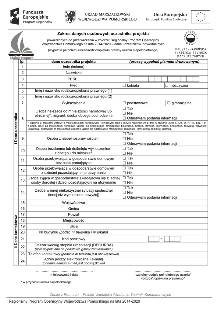 Zakres danych osobowych uczestnika projektu powierzonych do przetwarzania w zbiorze: Regionalny Program Operacyjny Województwa Pomorskiego na lata 2014-2020 – dane uczestników indywidualnych I Dane uczestnika (wypełnia pełnoletni uczeń/rodzic/opiekun prawny ucznia niepełnoletniego) lp. 1. dane uczestnika projektu Imię (imiona) 2. Nazwisko 3. PESEL 4. 5. Płeć Imię i nazwisko rodzica/opiekuna prawnego (1) 6. Imię i nazwisko rodzica/opiekuna prawnego (2) 7. Wykształcenie 8. ☐ mężczyzna ☐ kobieta ☐ podstawowe ☐ gimnazjalne ☐ Tak ☐ Nie ☐ Odmawiam podania informacji * Zgodnie z zapisami Ustawy o mniejszościach narodowych i etnicznych oraz o języku regionalnym z dnia 6 stycznia 2005 r. (Dz. U. Nr 17, poz. 141, z późn. zm.): za mniejszości narodowe uznaje się następujące mniejszości: białoruską, czeską, litewską, niemiecką, ormiańską, rosyjską, słowacką, ukraińską i żydowską; za mniejszości etniczne uznaje się następujące mniejszości: karaimską, łemkowską, romską i tatarską. 9. 10. 11. 12. 13. 14. 15. II Dane kontaktowe Osoba należąca do mniejszości narodowej lub etnicznej*, migrant, osoba obcego pochodzenia (proszę wypełnić pismem drukowanym) ☐ Tak Osoba z niepełnosprawnościami ☐ Nie ☐ Odmawiam podania informacji ☐ Tak Osoba bezdomna lub dotknięta wykluczeniem z dostępu do mieszkań ☐ Nie ☐ Tak Osoba przebywająca w gospodarstwie domowym bez osób pracujących ☐ Nie ☐ Tak Osoba przebywająca w gospodarstwie domowym z dziećmi pozostającymi na utrzymaniu ☐ Nie Osoba żyjąca w gospodarstwie składającym się z jednej ☐ Tak osoby dorosłej i dzieci pozostających na utrzymaniu ☐ Nie ☐ Tak Osoba w innej niekorzystnej sytuacji społecznej ☐ Nie (innej niż wymienione powyżej) ☐ Odmawiam podania informacji Województwo 16. Gmina 17. Powiat 18. Miejscowość 19. Ulica 20. Nr budynku (podać nr budynku i nr lokalu) 21. Kod pocztowy 22. - Obszar według stopnia urbanizacji (DEGURBA) (pole wypełniane na podstawie gminy zamieszkania) 23. Telefon kontaktowy (podanie nr telefonu jest obowiązkowe) Adres poczty elektronicznej (e-mail) 24. (podanie adresu e-mail jest obowiązkowe) …………………………………………… miejscowość i data …………………………………………… czytelny podpis pełnoletniego ucznia/ rodzica*/opiekuna prawnego* * w przypadku ucznia niepełnoletniego Zdolni z Pomorza – Polsko–Japońska Akademia Technik Komputerowych