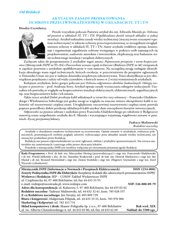 Od Redakcji Aktualne zasady projektowania ochrony przeciwpor ażenioweJ w układach IT, TT i TN Drodzy Czytelnicy, Przede wszystkim polecam Państwu artykuł dra inż. Edwarda Musiała pt. Ochrona od porażeń w układach IT, TT i TN. Współdziałanie dwóch różnych układów w jednej instalacji. Artykuł uaktualnia zasady wiedzy technicznej (inaczej zwane uznanymi regułami technicznymi) w zakresie ochrony przeciwporażeniowej, ze szczególnym uwzględnieniem ochrony w układach IT, TT i TN. Autor artykułu wnikliwie opisuje, komentuje i argumentuje zagadnienia ochrony występujące w praktyce osób zajmujących się projektowaniem, nadzorem autorskim i inwestorskim, eksploatacją oraz badaniem stanu technicznego instalacji i urządzeń elektrycznych. Zachęcam także do przypomnienia 2 artykułów tegoż autora: Pojmowanie przepisów i norm bezpieczeństwa (Miesięcznik INPE nr 93–94) i Powszechnie uznane reguły techniczne (Biuletyn INPE nr 46) związanych w aspekcie prawnym z artykułem opublikowanym w tym numerze. Na szczególną uwagę zasługuje identyfikacja aktualnego stanu reguł technicznych, których ewolucja, w przeciwieństwie do przepisów ogłaszanych w Dzienniku Ustaw nie jest w żadnym dzienniku urzędowym odnotowywana. Toteż identyfikacja ta jest obowiązkiem projektanta i zależy od wielu czynników, o których mowa w 2 wyżej wymienionych artykułach. Kolejnym artykułem, który gorąco polecam jest Ochrona odgromowa obiektów budowlanych. Odstępy izolacyjne w powietrzu – prof. Andrzeja Sowy. Artykuł opisuje zasady wyznaczania odstępów izolacyjnych. Uzasadnia ich potrzebę ze względu na bezpieczeństwo instalacji elektrycznych, elektronicznych, sygnalizacyjnych itp. oraz bezpieczeństwo ludzi i ich mienia. Także trzeci artykuł Dobór przekroju kabli układanych w ziemi bez rury osłonowej – Franciszka Gładykowskiego i Włodzimierza Sobeckiego jest godny uwagi ze względu na znaczne różnice obciążalności kabli w zależności od rezystywności cieplnej ziemi. Uwzględnienie rzeczywistej rezystywności cieplnej ziemi pozwala poprzez prawidłowy dobór przekroju układanych kabli uzyskać duże oszczędności kosztów inwestycyjnych. Odpowiedzi na pytania zebrane i nadesłane przez Franciszka Gładykowskiego po szkoleniu w Bydgoszczy stanowią cenne uzupełnienie artykułu dra E. Musiała i wyczerpująco wyjaśniają wątpliwości zawarte w pytaniach. Życzę przyjemnej lektury. Tadeusz Malinowski Redaktor naczelny Artykuły o charakterze naukowo-technicznym są recenzowane. Opinie zawarte w artykułach, zwłaszcza polemicznych, prezentujących osobiste poglądy autorów, wykraczające poza aktualne zasady wiedzy technicznej, nie muszą być podzielane przez Redakcję. Redakcja nie ponosi odpowiedzialności za treść ogłoszeń, reklam i artykułów sponsorowanych. Nie zwraca materiałów nie zamówionych i zastrzega sobie prawo skracania tekstów. Przedruk z miesięcznika INPE jest możliwy wyłącznie po otrzymaniu pisemnej zgody Redakcji. Rada Programowa: • Prof. dr hab. inż. Mieczysław Hering (przewodniczący) • mgr inż. Franciszek Gładykowski • dr inż. Witold Jabłoński • doc. dr inż. Stanisław Krakowiak • prof. dr hab. inż. Henryk Markiewicz • mgr inż. Jan Musiał • dr inż. Ryszard Niewiedział • mgr inż. Zenon Stodolski • mgr inż. Zbigniew Szymański • mgr inż. Józef Wysocki (członkowie) Miesięcznik INPE (Informacje o Normach i Przepisach Elektrycznych) ISSN 1234-0081 Zeszyty Podręcznika INPE dla Elektryków (bezpłatny dodatek dla całorocznych prenumeratorów INPE) Wydawca i Redakcja: SEP – COSiW Zakład Wydawniczy INPE ul. Czapliniecka 44, 97-400 Bełchatów, tel./fax 44 633 33 55 e-mail: [email protected], www.redinpe.com NIP: 526-000-09-79 Adres dla korespondencji: ul. Kalinowa 5, 97-400 Bełchatów, fax 44 635 02 02 Redaktor naczelny: Tadeusz Malinowski, tel. 44 632 32 61, kom. 785 028 557 Z-ca Redaktora naczelnego: Jan Strojny, tel. 695 899 729 Biuro i księgowość: Małgorzata Filipiak, tel. 44 633 33 55, kom. 783 976 966 Marketing i Kolportaż: tel. 782 415 731 Skład komputerowy i druk: Skaner-Poligrafia Sp. z o.o., 97-400 Bełchatów Rok wyd. XIX ul. św. Alberta Chmielowskiego 6, tel. 44 633 83 00, tel./fax 44 633 62 69 Nakład: do 5500 egz.