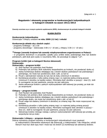 Załącznik nr 1 Regulamin i elementy programów w konkurencjach indywidualnych w kategorii młodzik na sezon 2012/2013 Zawody oceniane są w nowym systemie sędziowania (NSS), dostosowanym do potrzeb kategorii młodzik KLASA ZŁOTA Konkurencje indywidualne Dziewczęta i chłopcy urodzeni w roku 2000 (12 lat) i młodsi Konkurencja składa się z dwóch części: - programu krótkiego – do 2:30 - programu dowolnego – dziewczęta 3:00 (+/- 10 sek.), chłopcy 3:30 (+/- 10 sek.) *Uwaga (zawody krajowe lub zawody międzynarodowe organizowane w Polsce): - w programie dowolnym w przypadku upadku przy próbie skoku podwójnego Axla lub skoków potrójnych, jeśli skok jest czysty w rozumieniu NSS, nie powoduje to odjęcia "1,0". Program krótki (jak w kategorii Novice Advanced) Dziewczęta Dziewczęta – program krótki a) Axel Paulsen lub podwójny Axel Paulsen b) Podwójny lub potrójny skok wykonany bezpośrednio po krokach, nie powtarzać skoku a) c) Jedna kombinacja skoków składająca się z dwóch skoków podwójnych lub podwójnego i potrójnego, nie może być powtórzony skok z pkt. a) lub b) d) Piruet z odchyleniem tułowia do tyłu lub do boku (minimum 6 obrotów) e) Kombinacja piruetów z tylko jedną zmianą nogi i co najmniej jedną zmianą pozycji (minimum 5 obrotów na każdej nodze). Minimalna ilość obrotów w pozycji – dwa (2). Jeśli to wymaganie nie jest spełnione, pozycja nie jest zaliczona. f) Jedna sekwencja kroków z pełnym wykorzystaniem tafli lodowej (po prostej, po kole lub po serpentynie Chłopcy – program krótki a) Axel Paulsen lub podwójny Axel Paulsen b) Podwójny lub potrójny skok wykonany bezpośrednio po krokach, nie powtarzać skoku a) c) Jedna kombinacja skoków składająca się z dwóch skoków podwójnych lub podwójnego i potrójnego skoku, nie może być powtórzony skok z pkt. a) lub b) d) Piruet waga lub siadany (minimum 6 obrotów) ze zmianą nogi. Nie może rozpoczynać się skokiem. e) Kombinacja piruetów z tylko jedną zmianą nogi i co najmniej jedną zmianą pozycji (minimum 5 obrotów na każdej nodze). Minimalna wymagana ilość obrotów w pozycji – dwa (2). Jeśli to wymaganie nie jest spełnione, pozycja nie jest zaliczona. f) Sekwencja kroków różnego rodzaju z pełnym wykorzystaniem tafli lodowej (po prostej, po serpentynie lub po kole) Dziewczęta i chłopcy – program dowolny Dobrze wyważony program dowolny w konkurencjach indywidualnych musi zawierać: a/ maksymalnie 6 elementów skokowych dla dziewcząt, a maksymalnie 7 dla chłopców; wśród których musi być skok typu Axel i może być do dwóch (2) kombinacji lub sekwencji skoków. 1 Kombinacja skoków może składać się tylko z dwóch (2) skoków. Sekwencja skoków może składać się z dowolnej ilości skoków, ale liczone będą tylko dwa najtrudniejsze. b/ maksymalnie dwa (2) różne piruety, z których jeden musi być kombinacją piruetów (minimum dziesięć (10) obrotów), a jeden skokiem do piruetu lub piruetem rozpoczynającym się skokiem (minimum sześć (6) obrotów). W piruetach minimalna wymagana ilość obrotów w pozycji – dwa (2). Jeśli to wymaganie nie jest spełnione, pozycja nie jest zaliczona. Ilość zmian nogi w kombinacji piruetów jest dowolna. c/ maksymalnie jedna (1) sekwencja kroków !!! w klasie złotej można osiągnąć maksymalnie 3 poziom trudności w elementach technicznych; wszystkie cechy powyżej 3 poziomu nie będą liczone i będą ignorowane przez panel techniczny KLASA SREBRNA Konkurencje indywidualne Dziewczęta i chłopcy urodzeni w roku 2002 (10 lat) i młodsi Konkurencja składa się z jednej części: - programu dowolnego – dziewczęta do 3:10, chłopcy do 3:40 *Uwaga (zawody krajowe lub zawody międzynarodowe organizowane w Polsce): - w programie dowolnym w przypadku upadku przy próbie skoku podwójnego Axla lub skoków potrójnych, jeśli skok jest czysty w rozumieniu NSS, nie powoduje to odjęcia "1,0". Dziewczęta i chłopcy – program dowolny Dobrze wyważony program dowolny w konkurencjach indywidualnych musi zawierać: a/ maksymalnie 6 elementów skokowych dla dziewcząt, a maksymalnie 7 dla chłopców; wśród których musi być skok typu Axel i może być do dwóch (2) kombinacji lub sekwencji skoków. Kombinacja skoków może składać się tylko z dwóch (2) skoków. Sekwencja skoków może składać się z dowolnej ilości skoków, ale liczone będą tylko dwa najtrudniejsze. b/ maksymalnie dwa (2) różne piruety, z których jeden musi być kombinacją piruetów (minimum dziesięć (10) obrotów), a jeden skokiem do piruetu lub piruetem rozpoczynającym się skokiem (minimum sześć (6) obrotów). W piruetach minimalna wymagana ilość obrotów w pozycji – dwa (2). Jeśli to wymaganie nie jest spełnione, pozycja nie jest zaliczona. Ilość zmian nogi w kombinacji piruetów jest dowolna. c/ maksymalnie jedna (1) sekwencja kroków !!! w klasie srebrnej można osiągnąć maksymalnie 2 poziom trudności w elementach technicznych; wszystkie cechy powyżej 2 poziomu nie będą liczone i będą ignorowane przez panel techniczny Sędziowie będą brać pod uwagę tylko następujące komponenty: # umiejętności łyżwiarskie # wykonanie # interpretacja Mnożniki dla komponentów to: - dla chłopców 2,0 - dla dziewcząt 1,7 2 KLASA BRĄZOWA Konkurencje indywidualne Dziewczęta i chłopcy urodzeni w roku 2004 (8 lat) i młodsi Konkurencja składa się z jednej części: - programu dowolnego – do 2:30 Program dowolny 1. Maksymalnie 5 elementów skokowych – w tym co najmniej jedna (ale nie więcej niż 2) kombinacja lub sekwencja skoków (Definicja sekwencji skoków według wymagań NSS) 2. Maksymalnie 2 różne piruety, z których jeden musi być piruetem w jednej pozycji podstawowej i bez zmiany nogi (minimum 4 obroty). Drugi zaś powinien być dowolnym piruetem (złożonym tylko z pozycji podstawowych), zawierającym inną pozycję podstawową. Jeśli jest kombinacją – musi mieć minimum