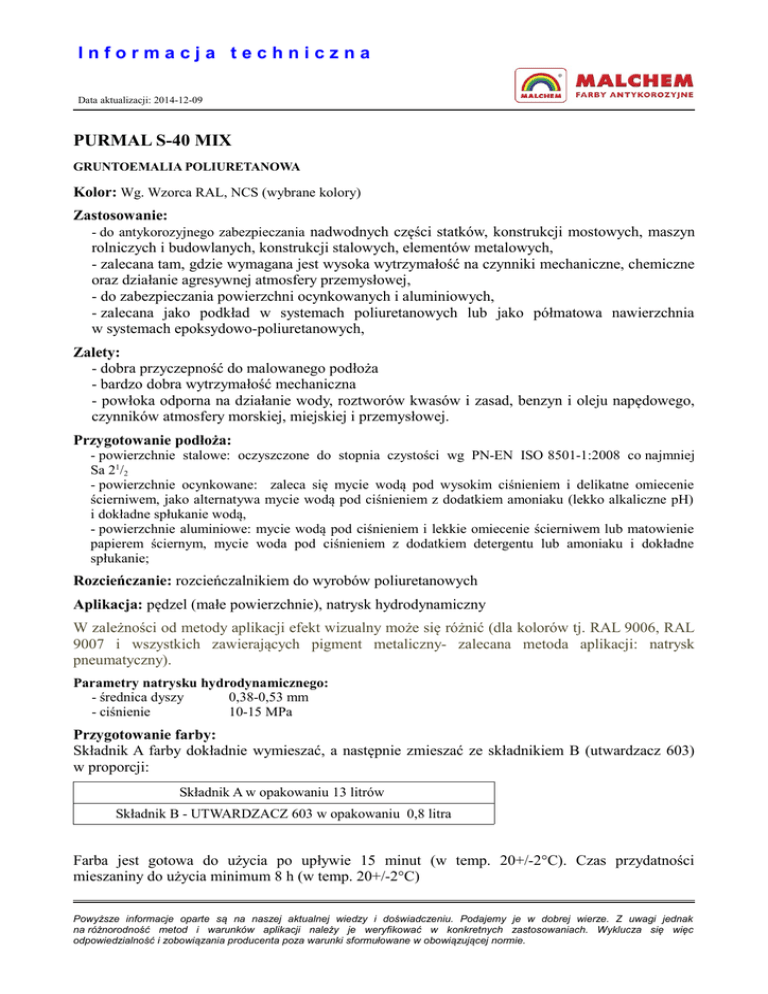 Informacja techniczna Data aktualizacji: 2014-12-09 PURMAL S-40 MIX GRUNTOEMALIA POLIURETANOWA Kolor: Wg. Wzorca RAL, NCS (wybrane kolory) Zastosowanie: - do antykorozyjnego zabezpieczania nadwodnych części statków, konstrukcji mostowych, maszyn rolniczych i budowlanych, konstrukcji stalowych, elementów metalowych, - zalecana tam, gdzie wymagana jest wysoka wytrzymałość na czynniki mechaniczne, chemiczne oraz działanie agresywnej atmosfery przemysłowej, - do zabezpieczania powierzchni ocynkowanych i aluminiowych, - zalecana jako podkład w systemach poliuretanowych lub jako półmatowa nawierzchnia w systemach epoksydowo-poliuretanowych, Zalety: - dobra przyczepność do malowanego podłoża - bardzo dobra wytrzymałość mechaniczna - powłoka odporna na działanie wody, roztworów kwasów i zasad, benzyn i oleju napędowego, czynników atmosfery morskiej, miejskiej i przemysłowej. Przygotowanie podłoża: - powierzchnie stalowe: oczyszczone do stopnia czystości wg PN-EN ISO 8501-1:2008 co najmniej Sa 21/2 - powierzchnie ocynkowane: zaleca się mycie wodą pod wysokim ciśnieniem i delikatne omiecenie ścierniwem, jako alternatywa mycie wodą pod ciśnieniem z dodatkiem amoniaku (lekko alkaliczne pH) i dokładne spłukanie wodą, - powierzchnie aluminiowe: mycie wodą pod ciśnieniem i lekkie omiecenie ścierniwem lub matowienie papierem ściernym, mycie woda pod ciśnieniem z dodatkiem detergentu lub amoniaku i dokładne spłukanie; Rozcieńczanie: rozcieńczalnikiem do wyrobów poliuretanowych Aplikacja: pędzel (małe powierzchnie), natrysk hydrodynamiczny W zależności od metody aplikacji efekt wizualny może się różnić (dla kolorów tj. RAL 9006, RAL 9007 i wszystkich zawierających pigment metaliczny- zalecana metoda aplikacji: natrysk pneumatyczny). Parametry natrysku hydrodynamicznego: - średnica dyszy 0,38-0,53 mm - ciśnienie 10-15 MPa Przygotowanie farby: Składnik A farby dokładnie wymieszać, a następnie zmieszać ze składnikiem B (utwardzacz 603) w proporcji: Składnik A w opakowaniu 13 litrów Składnik B - UTWARDZACZ 603 w opakowaniu 0,8 litra Farba jest gotowa do użycia po upływie 15 minut (w temp. 20+/-2°C). Czas przydatności mieszaniny do użycia minimum 8 h (w temp. 20+/-2°C) Powyższe informacje oparte są na naszej aktualnej wiedzy i doświadczeniu. Podajemy je w dobrej wierze. Z uwagi jednak na różnorodność metod i warunków aplikacji należy je weryfikować w konkretnych zastosowaniach. Wyklucza się więc odpowiedzialność i zobowiązania producenta poza warunki sformułowane w obowiązującej normie. Informacja techniczna Data aktualizacji: 2014-12-09 Warunki podczas prac malarskich: - minimalna temperatura powierzchni podczas aplikacji i utwardzania -5°C, nie może być wilgotna ani pokryta lodem - temperatura powierzchni musi być wyższa od punku rosy o co najmniej 3°C - maksymalna względna wilgotność powietrza 80 % - kondensacja wilgoci może spowodować zmianę koloru i obniżenie połysku. Zalecana ilość warstw: 1-2 Wybrane parametry techniczne mieszaniny handlowej: gęstość, g/cm3 LZO, g/l zawartość rozpuszczalników (około), % wag. zawartość substancji nielotnych (około), % obj temperatura zapłonu, oC, nie mniej niż zalecana grubość warstwy, µm (“na mokro”) zalecana grubość powłoki, µm (”na sucho”) zużycie teoretyczne, dm3/m2 zużycie teoretyczne, kg /m2 1,45 440 30 63 21 80 50 0,08 0,12 Czas wysychania (w temp. 20+/-2°C i wilgotności względnej 55+/-5%) - stopień 1, h - stopień 3, h - całkowite wyschnięcie, h do nałożenia kolejnych warstw - najkrótszy , h - najdłuższy, dni 0,3 1,5 168 0,3 7 Podane parametry mogą ulec zmianie wraz ze zmianą warunków otoczenia, ilości i grubości warstw. Temperatura pracy: W suchej atmosferze powłoka może być poddana ciągłemu działaniu temp. 120°C. Dopuszcza się chwilowy wzrost do 150°C. Przechowywanie: w zamkniętych pojemnikach z dala od ognia i źródeł ciepła. Chronić dzieci przed dostępem do wyrobu. Temperatura przechowywania- od 5°C do 30 °C. Norma: PN-C-81935:2001. Wyrób powinien odpowiadać wymaganiom normy przez 9 mies. od daty produkcji Powyższe informacje oparte są na naszej aktualnej wiedzy i doświadczeniu. Podajemy je w dobrej wierze. Z uwagi jednak na różnorodność metod i warunków aplikacji należy je weryfikować w konkretnych zastosowaniach. Wyklucza się więc odpowiedzialność i zobowiązania producenta poza warunki sformułowane w obowiązującej normie.