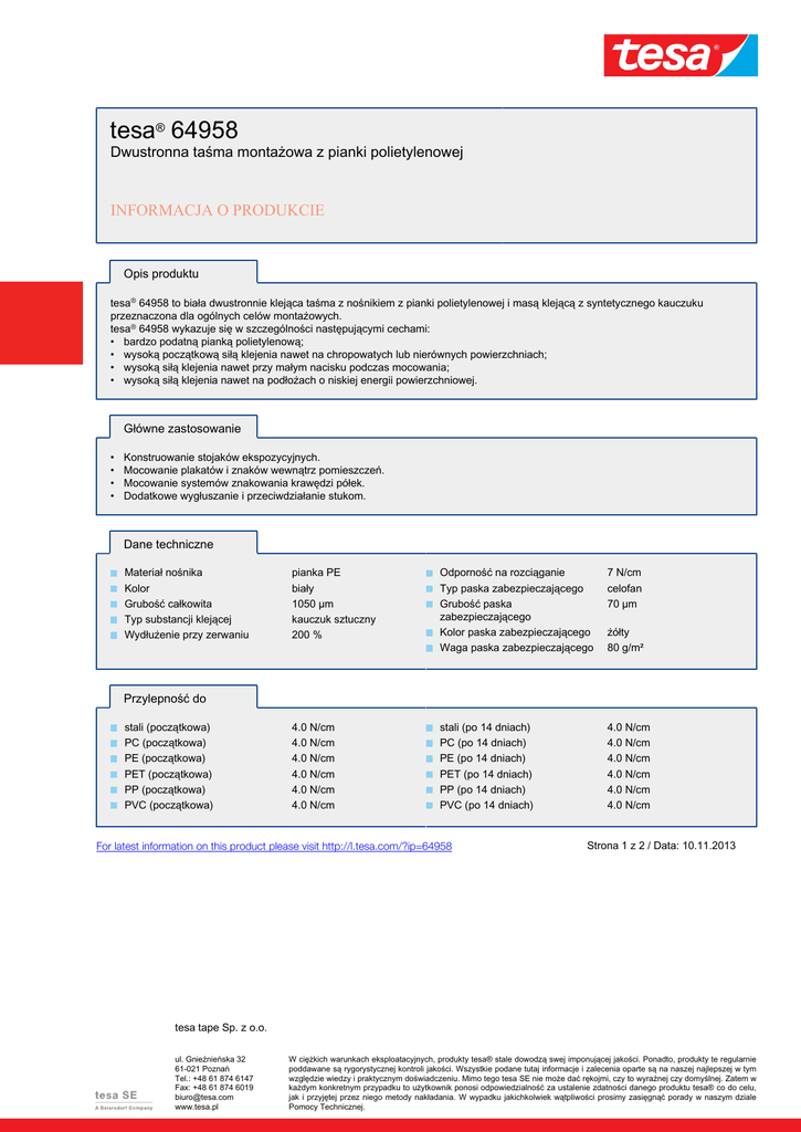 tesa® 64958 Dwustronna taśma montażowa z pianki polietylenowej INFORMACJA O PRODUKCIE Opis produktu tesa® 64958 to biała dwustronnie klejąca taśma z nośnikiem z pianki polietylenowej i masą klejącą z syntetycznego kauczuku przeznaczona dla ogólnych celów montażowych. tesa® 64958 wykazuje się w szczególności następującymi cechami: • bardzo podatną pianką polietylenową; • wysoką początkową siłą klejenia nawet na chropowatych lub nierównych powierzchniach; • wysoką siłą klejenia nawet przy małym nacisku podczas mocowania; • wysoką siłą klejenia nawet na podłożach o niskiej energii powierzchniowej. Główne zastosowanie • • • • Konstruowanie stojaków ekspozycyjnych. Mocowanie plakatów i znaków wewnątrz pomieszczeń. Mocowanie systemów znakowania krawędzi półek. Dodatkowe wygłuszanie i przeciwdziałanie stukom. Dane techniczne Materiał nośnika Kolor Grubość całkowita Typ substancji klejącej Wydłużenie przy zerwaniu pianka PE biały 1050 µm kauczuk sztuczny 200 % Odporność na rozciąganie Typ paska zabezpieczającego Grubość paska zabezpieczającego Kolor paska zabezpieczającego Waga paska zabezpieczającego 7 N/cm celofan 70 µm 4.0 N/cm 4.0 N/cm 4.0 N/cm 4.0 N/cm 4.0 N/cm 4.0 N/cm stali (po 14 dniach) PC (po 14 dniach) PE (po 14 dniach) PET (po 14 dniach) PP (po 14 dniach) PVC (po 14 dniach) 4.0 N/cm 4.0 N/cm 4.0 N/cm 4.0 N/cm 4.0 N/cm 4.0 N/cm żółty 80 g/m² Przylepność do stali (początkowa) PC (początkowa) PE (początkowa) PET (początkowa) PP (początkowa) PVC (początkowa) For�latest�information�on�this�product�please�visit�http://l.tesa.com/?ip=64958 Strona 1 z 2 / Data: 10.11.2013 tesa tape Sp. z o.o. ul. Gnieźnieńska 32 61-021 Poznań Tel.: +48 61 874 6147 Fax: +48 61 874 6019 [email protected] www.tesa.pl W ciężkich warunkach eksploatacyjnych, produkty tesa® stale dowodzą swej imponującej jakości. Ponadto, produkty te regularnie poddawane są rygorystycznej kontroli jakości. Wszystkie podane tutaj informacje i zalecenia oparte są na naszej najlepszej w tym względzie wiedzy i praktycznym doświadczeniu. Mimo tego tesa SE nie może dać rękojmi, czy to wyraźnej czy domyślnej. Zatem w każdym konkretnym przypadku to użytkownik ponosi odpowiedzialność za ustalenie zdatności danego produktu tesa® co do celu, jak i przyjętej przez niego metody nakładania. W wypadku jakichkolwiek wątpliwości prosimy zasięgnąć porady w naszym dziale Pomocy Technicznej. tesa® 64958 Dwustronna taśma montażowa z pianki polietylenowej INFORMACJA O PRODUKCIE Właściwości Odporność termiczna krótkoterminowa Odporność termiczna długoterminowa Przyczepność początkowa Odporność na starzenie (UV) Odporność na wilgoć 60 °C 40 °C + o + Odporność na chemikalia Odporność na środki zmiękczające Statyczna odporność na ścinanie w temp. 23°C Statyczna odporność na ścinanie w temp. 40°C o o ++ o Ocena dla istotnych właściwości produktów: ++bardzo dobra, +dobra, o średnia, - niska Dodatkowe informacje Przyczepność przy zdzieraniu: - natychmiast: rozwarstwienie pianki na stali, aluminium, ABS, PC, PS, PET, PVC, PE; - po upływie 14 dni: rozwarstwienie pianki na stali, aluminium, ABS, PC, PS, PET, PVC, PP, PE. For�latest�information�on�this�product�please�visit�http://l.tesa.com/?ip=64958 Strona 2 z 2 / Data: 10.11.2013 tesa tape Sp. z o.o. ul. Gnieźnieńska 32 61-021 Poznań Tel.: +48 61 874 6147 Fax: +48 61 874 6019 [email protected] www.tesa.pl W ciężkich warunkach eksploatacyjnych, produkty tesa® stale dowodzą swej imponującej jakości. Ponadto, produkty te regularnie poddawane są rygorystycznej kontroli jakości. Wszystkie podane tutaj informacje i zalecenia oparte są na naszej najlepszej w tym względzie wiedzy i praktycznym doświadczeniu. Mimo tego tesa SE nie może dać rękojmi, czy to wyraźnej czy domyślnej. Zatem w każdym konkretnym przypadku to użytkownik ponosi odpowiedzialność za ustalenie zdatności danego produktu tesa® co do celu, jak i przyjętej przez niego metody nakładania. W wypadku jakichkolwiek wątpliwości prosimy zasięgnąć porady w naszym dziale Pomocy Technicznej.