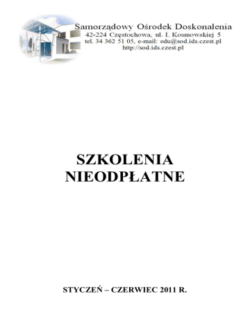 SZKOLENIA NIEODPŁATNE STYCZEŃ – CZERWIEC 2011 R. Częstochowa, 31grudnia 2010 r. Szanowni Państwo Wzorem lat ubiegłych Samorządowy Ośrodek Doskonalenia w Częstochowie, mając na uwadze jakościowy rozwój Państwa szkół i placówek, pragnie wesprzeć nauczycieli w ramach realizacji zaplanowanych szkoleń nieodpłatnych, które dotyczyć będą m.in.: nauczanego przedmiotu, ogólnej wiedzy i umiejętności zawodowych, awansu zawodowego. W załączeniu przekazuję Państwu harmonogram szkoleń nieodpłatnych konsultantów i doradców metodycznych SOD na okres od stycznia do czerwca 2011 roku, z wyszczególnieniem tematu, miejsca, godzin oraz osób prowadzących. Tematyka i zakres szkoleń zostały opracowane w oparciu o wyniki diagnozy potrzeb, przeprowadzonej przez doradców i konsultantów naszego Ośrodka podczas spotkań z nauczycielami. Za priorytetowe w naszej ofercie uznaliśmy kierunki realizacji polityki oświatowej państwa. Przewidywany, maksymalny czas trwania szkoleń - 3 godziny dydaktyczne. Na ogół nie wymagamy wcześniejszego zgłoszenia udziału w wybranym szkoleniu, jednak w kilku przypadkach zaznaczyliśmy, że jest to konieczne. Życzę Państwu w Nowym Roku 2011 wielu sukcesów zawodowych, zadowolenia z wykonywanej pracy oraz powodzenia w życiu osobistym. Serdecznie zapraszam do korzystania z naszych usług. Z poważaniem Zbigniew Janus Dyrektor SOD 2 Szkolenia nieodpłatne styczeń - czerwiec 2011 roku OBSZAR: WYCHOWANIE I PROFILAKTYKA Lp. 1 Temat Uczeń - ofiara przemocy seksualnej Prowadzący Joanna Biczak Adresat pedagodzy szkolni, wychowawcy klas, świetlic i internatów, zainteresowani nauczyciele 2 Wychowawcze aspekty poszanowania własności intelektualnej - propozycja zajęć z uczniami Joanna Biczak pedagodzy szkolni, wychowawcy klas, świetlic i internatów, zainteresowani nauczyciele Przezwyciężanie problemów wychowawczych w pracy z dzieckiem w wieku przedszkolnym Dorota Pisarek 3 Marzanna Gromotowicz nauczyciele religii przedszkoli Elżbieta Kurzynoga 4 Dziecko Katarzyna z Patrzykont niepełnosprawno-ścią sprzężoną – studium przypadku nauczyciele szkół specjalnych i ogólnodostępnych z oddziałami integracyjnymi, kształcący uczniów ze specjalnymi potrzebami edukacyjnymi 5 Metody wychowania w rodzinie i ich znaczenie w rozwoju dziecka nauczyciele wychowania przedszkolnego Elżbieta Kurzynoga Zakres tematyczny zakres działań profilaktycznych w szkole skierowanych do uczniów i ich rodziców w celu zapobiegania przemocy seksualnej i postępowania wtedy, kiedy do niej doszło elementy etyki w działaniach wychowawczych nauczycieli podejmowanych wobec niedozwolonych zachowań uczniów związanych z przywłaszczaniem cudzej własności intelektualnej przyczyny problemów wychowawczych w wieku przedszkolnym; zasady postępowania z dziećmi sprawiającymi problemy wychowawcze trudności diagnostyczne i terapeutyczne wynikające ze sprzężonej niepełnosprawności; studium przypadku, jako najlepsza metoda zbierania informacji na temat potrzeb i możliwości dziecka postawy rodzicielskie i ich wpływ na rozwój osobowości dziecka Data, godzina, miejsce 10.03.2011 r. godz. 15:00 SOD ul. Kosmowskiej 5 Częstochowa 06.04.2011 r. godz. 15:00 SOD ul. Kosmowskiej 5 Częstochowa 10.03.2011 r. godz. 15:30 SOD ul. Kosmowskiej 5 Częstochowa 13.04.2011 r. godz. 16:00 SOD ul. Kosmowskiej 5 Częstochowa 10.01.2011 r. godz. 16:00 SOD ul. Kosmowskiej 5 Częstochowa 3 6 Pedagogika zabawy istotnym elementem edukacji wczesnoszkolnej Iwona Dyja nauczyciele edukacji wczesnoszkolnej, zainteresowani nauczyciele 7 Uczeń agresywny Iwona Dyja - metody postępowania nauczyciele edukacji wczesnoszkolnej, zainteresowani nauczyciele nauczyciele edukacji wczesnoszkolnej, zainteresowani nauczyciele 8 Jak pracować z uczniem o cechach zachowań agresywnych? 9 Wszyscy równi, wszyscy różni - czyli jak zapewnić dyscyplinę, ład i uwagę w klasie? 10 Wykorzystanie filmów dokumentalnych i animowanych z pakietu "Filmoteka Szkolna" w pracy wychowawcy klasy 11 Akademia Młodego Nauczyciela - kompetencje osobiste nauczyciela 12 Praktyczne sposoby utrzymania dyscypliny w klasie 4 Iwona Kiełczykowska propozycja gier i zabaw z dzieckiem w młodszym wieku szkolnym rozwijających różne formy aktywności przykłady dobrych rozwiązań dydaktyczno -wychowawczych przykłady dobrych rozwiązań dydaktyczno -wychowawczych 10.03.2011 r. godz. 15:00 SP nr 12 ul. Warszawska 31 Częstochowa 10.05.2011 r. godz. 15:00 SP nr 12 ul. Warszawska 31 Częstochowa 12.05.2011 r. godz. 15:00 SP nr 11 ul. Festynowa 24 Częstochowa Teresa Zatoń nauczyciele przyrody metody i techniki integrujące zespół klasowy - ćwiczenia warsztatowe 22.03.2011 r. godz. 15:00 SP nr 53 ul. Orkana 95/109 Częstochowa Iwona Skrzypczyk -Gałkowska nauczyciele wychowawcy szkół ponadgimnazjalnych Częstochowy i powiatu myszkowskiego, zainteresowani nauczyciele metodyka pracy z filmem animowanym i dokumentalnym; praktyczne przykłady zastosowania filmu na lekcjach wychowawczych 06.04.2011 r. godz. 16:00 SOD ul. Kosmowskiej 5 Częstochowa Marzena Litke nauczyciele o stażu pracy 0-3 lata, zainteresowani nauczyciele motywowanie siebie i innych do działania; radzenie sobie ze stresem; zarządzanie sobą w czasie 11.05.2011 r. godz. 15:00 SOD ul. Kosmowskiej 5 Częstochowa Anna Drzewiecka -Świtała nauczyciele chemii gimnazjów, szkół ponadgimnazjalnych Częstochowy i powiatu myszkowskiego pozycja prawna nauczyciela i ucznia; nastawienie nauczyciela do uczniów w świetle różnych zaleceń nauk pedagogicznych; autorytet nauczyciela; metody skutecznej prewencji i interwencji wpływające na utrzymanie dyscypliny w klasie 24.05.2011 r. godz. 14:30 TZN ul. Jasnogórska 84/90 Częstochowa 13 Budowanie zespołu klasowego Grażyna Cierniewska -Muskała nauczyciele fizyki gimnazjów i szkół ponadgimnazjalnych Częstochowy nauczyciele fizyki szkół ponadgimnazjalnych powiatu myszkowskiego 14 nauczyciele biolog