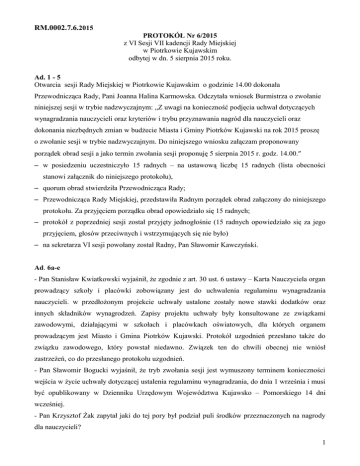 RM.0002.7.6.2015 PROTOKÓŁ Nr 6/2015 z VI Sesji VII kadencji Rady Miejskiej w Piotrkowie Kujawskim odbytej w dn. 5 sierpnia 2015 roku. Ad. 1 - 5 Otwarcia sesji Rady Miejskiej w Piotrkowie Kujawskim o godzinie 14.00 dokonała Przewodnicząca Rady, Pani Joanna Halina Karmowska. Odczytała wniosek Burmistrza o zwołanie niniejszej sesji w trybie nadzwyczajnym: „Z uwagi na konieczność podjęcia uchwał dotyczących wynagradzania nauczycieli oraz kryteriów i trybu przyznawania nagród dla nauczycieli oraz dokonania niezbędnych zmian w budżecie Miasta i Gminy Piotrków Kujawski na rok 2015 proszę o zwołanie sesji w trybie nadzwyczajnym. Do niniejszego wniosku załączam proponowany porządek obrad sesji a jako termin zwołania sesji proponuję 5 sierpnia 2015 r. godz. 14.00.” – w posiedzeniu uczestniczyło 15 radnych – na ustawową liczbę 15 radnych (lista obecności stanowi załącznik do niniejszego protokołu), – quorum obrad stwierdziła Przewodnicząca Rady; – Przewodnicząca Rady Miejskiej, przedstawiła Radnym porządek obrad załączony do niniejszego protokołu. Za przyjęciem porządku obrad opowiedziało się 15 radnych; – protokół z poprzedniej sesji został przyjęty jednogłośnie (15 radnych opowiedziało się za jego przyjęciem, głosów przeciwnych i wstrzymujących się nie było) – na sekretarza VI sesji powołany został Radny, Pan Sławomir Kawczyński. Ad. 6a-e - Pan Stanisław Kwiatkowski wyjaśnił, że zgodnie z art. 30 ust. 6 ustawy – Karta Nauczyciela organ prowadzący szkoły i placówki zobowiązany jest do uchwalenia regulaminu wynagradzania nauczycieli. w przedłożonym projekcie uchwały ustalone zostały nowe stawki dodatków oraz innych składników wynagrodzeń. Zapisy projektu uchwały były konsultowane ze związkami zawodowymi, działającymi w szkołach i placówkach oświatowych, dla których organem prowadzącym jest Miasto i Gmina Piotrków Kujawski. Protokół uzgodnień przesłano także do związku zawodowego, który powstał niedawno. Związek ten do chwili obecnej nie wniósł zastrzeżeń, co do przesłanego protokołu uzgodnień. - Pan Sławomir Bogucki wyjaśnił, że tryb zwołania sesji jest wymuszony terminem konieczności wejścia w życie uchwały dotyczącej ustalenia regulaminu wynagradzania, do dnia 1 września i musi być opublikowany w Dzienniku Urzędowym Województwa Kujawsko – Pomorskiego 14 dni wcześniej. - Pan Krzysztof Żak zapytał jaki do tej pory był podział puli środków przeznaczonych na nagrody dla nauczycieli? 1 - Pan Stanisław Kwiatkowski odpowiedział, że do tej pory 20 % środków było do dyspozycji Burmistrza a 80 % środków było do dyspozycji dyrektorów. W zaproponowanym na obecnej sesji projekcie uchwały do dyspozycji burmistrza pozostawia się 30 % środków na nagrody a do dyspozycji dyrektorów – 70 %. - Pani Joanna Karmowska zapytała w jaki sposób było to dzielone? - Pan Stanisław Kwiatkowski odpowiedział, że środki na nagrody Burmistrza były przyznawane na wnioski dyrektorów. - Pan Mariusz Wojciechowski powiedział, że rozumie przez to, że puli środków na nagrody to nie zmieni. - Pan Stanisław Kwiatkowski odpowiedział, że tak, pula środków na nagrody pozostaje bez zmian. - Pan Sławomir Bogucki powiedział, że jeśli chodzi o orzeczenia o niepełnosprawności to samorząd będzie miał na ten temat wiedzę w miesiącu wrześniu. - Pani Joanna Karmowska odczytała projekt uchwały Nr VI/48/2015 zmieniającej uchwałę w sprawie wynagradzania nauczycieli. Głosowanie: 15 „za”, 0 „przeciw”, 0 „wstrzymujących się”, uchwała Nr VI/48/2015 została przyjęta jednogłośnie. - Pani Joanna Karmowska odczytała projekt uchwały Nr VI/49/2015 zmieniającej uchwałę w sprawie ustalenia kryteriów i trybu przyznawania nagród dla nauczycieli. Głosowanie: 15 „za”, 0 „przeciw”, 0 „wstrzymujących się”, uchwała Nr VI/49/2015 została przyjęta jednogłośnie. - Pan Sławomir Bogucki wyjaśnił, że w projekcie uchwały Nr VI/50/2015 w sprawie nabycia nieruchomości zabudowanej w Wąsewie chodzi o nieruchomość zawierająca 9 arów działek oraz część obiektu (budynku), w której funkcjonowały biura. W obiekcie tym można wydzielić 6 mniejszych mieszkań socjalnych lub kilka większych. z uwagi na to planuje się wycenić prace modernizacyjne, a następnie złożyć wniosek o dofinansowanie remontu do Ministerstwa Pracy i Polityki Socjalnej. Dodał, że nie wie czy pozyskanie środków jest możliwe jeszcze w bieżącym roku, ale sądzi, że w przyszłym roku się to uda. - Pan Arkadiusz Rybak zapytał kto jest obecnie właścicielem tej nieruchomości? - Pan Sławomir Bogucki odpowiedział, że właścicielem nieruchomości jest spółka ROL-NAS. - Pan Krzysztof Żak zapytał jaki jest wstępny koszt adaptacji tych budynków? - Pan Sławomir Bogucki odpowiedział, że obecnie nie jest jeszcze wiadomo jakie to pochłonie środki. Dodał, że przychylność Rady, co do wyznaczenia środków na zakup tej nieruchomości, spowoduje dalsze procedury. powiedział, że myśli, iż będą to środki rzędu kolejnych 50 tys. zł, chyba, że otrzymanie dotacji będzie obwarowane jakimiś wymogami typu np. brak możliwości wykonania remontów przez pracowników Urzędu i konieczność wykonania tych prac przez firmę wyłonioną w przetargu. Pan Burmistrz dodał na koniec, że zamysł zakupu nieruchomości z 2 przeznaczeniem na lokale socjalne poza terenem miasta był taki, aby nie honorować i nie nagradzać ludzi, którzy w Piotrkowie kujawskim nie płacą za mieszkania. - Pani Joanna Karmowska odczytała projekt uchwały Nr VI/50/2015 w sprawie nabycia nieruchomości zabudowanej w Wąsewie Głosowanie: 15 „za”, 0 „przeciw”, 0 „wstrzymujących się”, uchwała Nr VI/50/2015 została przyjęta jednogłośnie. - Pani Joanna Karmowska odczytała projekt uchwały Nr VI/51/2015 zmieniającą uchwałe w sprawie Wieloletniej Prognoz