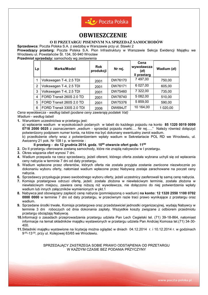OBWIESZCZENIE O II PRZETARGU PISEMNYM NA SPRZEDAŻ SAMOCHODÓW Sprzedawca: Poczta Polska S.A. z siedzibą w Warszawie przy ul. Stawki 2 Prowadzący przetarg: Poczta Polska S.A. Pion Infrastruktury w Warszawie Sekcja Ewidencji Majątku we Wrocławiu ul. Powstańców Śl. 134, 50-940 Wrocław Przedmiot sprzedaży: samochody wg zestawienia Cena wywoławcza Rok Lp Marka/Model Nr rej. Wadium (zł) produkcji (zł) II przetarg 7 497,00 1 Volkswagen T-4, 2.5 TDI DW76170 750,00 2001 6 027,00 2 Volkswagen T-4, 2.5 TDI DW76171 605,00 2001 7 322,00 3 Volkswagen T-4, 2.5 TDI DW75460 735,00 2001 4 FORD Transit 260S 2.0 TD 5 FORD Transit 260S 2.0 TD 2001 DW78740 5 082,00 510,00 2001 DW75376 5 859,00 590,00 10 164,00 6 FORD Transit 330S 2.0 TDI DW694JT 1 020,00 2006 Cena wywoławcza - według tabeli (podane ceny zawierają podatek Vat) Wadium - według tabeli 1. Warunkiem uczestnictwa w przetargu jest: a) wpłacenie wadium w wysokościach podanych w tabeli do każdego pojazdu na konto 85 1320 0019 0099 0718 2000 0025 z zaznaczeniem „wadium - sprzedaż pojazdu marki…. Nr rej…..” Należy również dołączyć potwierdzony podpisem numer konta, na które ma być dokonany ewentualny zwrot wadium. b) przedłożenie oferty wraz z potwierdzeniem wpłaty wadium w Sekretariacie POL RD we Wrocławiu, ul. Awicenny 21 pok. Nr 108 I p. w terminie : II przetarg - do 12 grudnia 2014. godz. 1000 otwarcie ofert godz. 1100 2. Do II przetargu oferowane zostaną samochody, które nie znajdą nabywców w I przetargu. 3. Okres wiązania ofert wynosi 7 dni. 4. Wadium przepada na rzecz sprzedawcy, jeżeli oferent, którego oferta została wybrana uchyli się od wpłacenia ceny nabycia w terminie 7 dni od daty przetargu. 5. Wadium wpłacone przez oferentów, których oferta nie została przyjęta zostanie zwrócone niezwłocznie po dokonaniu wyboru oferty, natomiast wadium wpłacone przez Nabywcę zostaje zarachowane na poczet ceny nabycia. 6. Sprzedawcy przysługuje prawo swobodnego wyboru oferty, jeżeli uczestnicy zaoferowali tę samą cenę nabycia. 7. Komisja przetargowa odrzuci ofertę, jeżeli: została złożona w niewłaściwym terminie, została złożona w niewłaściwym miejscu, zawiera cenę niższą niż wywoławcza, nie dołączono do niej potwierdzenia wpłaty wadium lub innych załączników wymienionych w pkt.1 8. Nabywca jest obowiązany zapłacić cenę nabycia (pomniejszoną o wadium) na konto: 12 1320 2550 1100 0702 0000 0000 w terminie 7 dni od daty przetargu, w przeciwnym razie traci prawo wynikające z przetargu oraz wadium. 9. Sprzedane środki trwałe, Komisja przetargowa oraz przedstawiciel jednostki organizacyjnej, wydają Nabywcy w terminie 3 dni roboczych od dnia dokonania zapłaty. Wszystkie koszty związane z odbiorem przedmiotu przetargu obciążają Nabywcę. 10. Informacji o zasadach przeprowadzenia przetargu udziela Pan Lech Cegielski tel. (71) 39-18-864, natomiast informacje na temat składników majątku wystawionych w przetargu udziela Pan Andrzej Komosa tel.(71) 34-30400. 11. Składniki majątku wystawione na licytację można oglądać w dniach 04.12.2014 r. i 10.12.2014 r. w godzinach 9:00-13:00, przy ul. Kolejowej 63/65 we Wrocławiu. SPRZEDAJĄCY ZASTRZEGA SOBIE PRAWO ODSTĄPIENIA OD PRZETARGU W KAŻDYM CZASIE BEZ PODANIA PRZYCZYNY