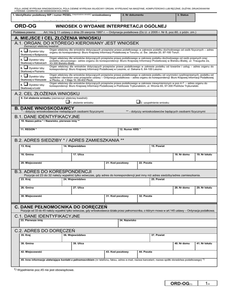 POLA JASNE WYPEŁNIA WNIOSKODAWCA, POLA CIEMNE WYPEŁNIA WŁAŚCIWY ORGAN. WYPEŁNIAĆ NA MASZYNIE, KOMPUTEROWO LUB RĘCZNIE, DUŻYMI, DRUKOWANYMI LITERAMI, CZARNYM LUB NIEBIESKIM KOLOREM. 1. Identyfikator podatkowy NIP / numer PESEL (niepotrzebne skreślić) wnioskodawcy 2. Nr dokumentu 3. Status └────┴────┴────┴────┴────┴────┴────┴────┴────┴────┴────┘ ORD-OG Podstawa prawna: WNIOSEK O WYDANIE INTERPRETACJI OGÓLNEJ Art.14a § 11 ustawy z dnia 29 sierpnia 1997 r. – Ordynacja podatkowa (Dz.U. z 2005 r. Nr 8, poz.60, z późn. zm.) A. MIEJSCE I CEL ZŁOŻENIA WNIOSKU A.1. ORGAN, DO KTÓREGO KIEROWANY JEST WNIOSEK Zaznaczyć właściwy kwadrat: Organ właściwy dla wniosków dotyczących przepisów prawa podatkowego w zakresie podatku dochodowego od osób fizycznych – adres 4. Dyrektor Izby organu do korespondencji: Biuro Krajowej Informacji Podatkowej w Toruniu, ul. Św. Jakuba 20, 87-100 Toruń. Skarbowej w Bydgoszczy Organ właściwy dla wniosków dotyczących przepisów prawa podatkowego w zakresie podatku dochodowego od osób prawnych oraz 5. Dyrektor Izby podatku akcyzowego– adres organu do korespondencji: Biuro Krajowej Informacji Podatkowej w Bielsku-Białej, ul. Traugutta 2a, Skarbowej w Katowicach 43-300 Bielsko-Biała. Organ właściwy dla wniosków dotyczących przepisów prawa podatkowego w zakresie podatku od towarów i usług – adres organu do 6. Dyrektor Izby korespondencji: Biuro Krajowej Informacji Podatkowej w Lesznie, ul. Dekana 6, 64-100 Leszno. Skarbowej w Poznaniu Organ właściwy dla wniosków dotyczących przepisów prawa podatkowego w zakresie podatku od czynności cywilnoprawnych, podatku od 7. Dyrektor Izby spadków i darowizn oraz przepisów ustawy – Ordynacja podatkowa – adres organu do korespondencji: Biuro Krajowej Informacji Podatkowej Skarbowej w Warszawie w Płocku, ul. 1 Maja 10, 09-402 Płock. Organ właściwy dla wniosków dotyczących przepisów prawa podatkowego w zakresie niewymienionym w poz.4-7 – adres organu do 8. Dyrektor Izby korespondencji: Biuro Krajowej Informacji Podatkowej w Piotrkowie Trybunalskim, ul. Wronia 65, 97-300 Piotrków Trybunalski. Skarbowej w Łodzi A.2. CEL ZŁOŻENIA WNIOSKU 9. Cel złożenia wniosku (zaznaczyć właściwy kwadrat): 1. złożenie wniosku 2. uzupełnienie wniosku B. DANE WNIOSKODAWCY * - dotyczy wnioskodawców niebędących osobami fizycznymi ** - dotyczy wnioskodawców będących osobami fizycznymi B.1. DANE IDENTYFIKACYJNE 10. Nazwa pełna * / Nazwisko, pierwsze imię ** 11. REGON * 12. Numer KRS * B.2. ADRES SIEDZIBY * / ADRES ZAMIESZKANIA ** 13. Kraj 16. Gmina 14. Województwo 15. Powiat 17. Ulica 20. Miejscowość 18. Nr domu 21. Kod pocztowy 19. Nr lokalu 22. Poczta B.3. ADRES DO KORESPONDENCJI Pozycje od 23 do 32 należy wypełnić tylko wówczas, gdy adres do korespondencji jest inny niż adres siedziby/adres zamieszkania. 23. Kraj 26. Gmina 24. Województwo 25. Powiat 27. Ulica 30. Miejscowość 28. Nr domu 31. Kod pocztowy 29. Nr lokalu 32. Poczta C. DANE PEŁNOMOCNIKA DO DORĘCZEŃ Pozycje od 33 do 45 należy wypełnić tylko wówczas, gdy wnioskodawca działa przez pełnomocnika, o którym mowa w art.145 ustawy – Ordynacja podatkowa. C.1. DANE IDENTYFIKACYJNE 33. Pierwsze imię 34. Nazwisko C.2. ADRES DO DORĘCZEŃ 35. Kraj 38. Gmina 36. Województwo 37. Powiat 39. Ulica 42. Miejscowość 40. Nr domu 43. Kod pocztowy 41. Nr lokalu 44. Poczta 45. Inne informacje ułatwiające kontakt z pełnomocnikiem (nr telefonu, faksu, adres e-mail, nazwa kancelarii, nazwa spółki doradztwa podatkowego) 1) 1) Wypełnienie poz.45 nie jest obowiązkowe. ORD-OG(1) 1/4 POLA JASNE WYPEŁNIA WNIOSKODAWCA, POLA CIEMNE WYPEŁNIA WŁAŚCIWY ORGAN. WYPEŁNIAĆ NA MASZYNIE, KOMPUTEROWO LUB RĘCZNIE, DUŻYMI, DRUKOWANYMI LITERAMI, CZARNYM LUB NIEBIESKIM KOLOREM. D. SPOSÓB UISZCZENIA I ZWROTU OPŁATY ORAZ NUMERY KONT BANKOWYCH 46. Sposób uiszczenia opłaty (zaznaczyć właściwy kwadrat): 1. na rachunek 2. gotówka 47. Kserokopia dowodu uiszczenia opłaty (zaznaczyć właściwy kwadrat): 1. dołączona do wniosku 2. zostanie przesłana w terminie 7 dni od dnia złożenia wniosku 48. Numer konta bankowego, na który wnoszona jest opłata (zaznaczyć właściwy kwadrat w przypadku zaznaczenia kwadratu nr 1 w poz.46): Izba Skarbowa w Bydgoszczy, Izba Skarbowa w Katowicach, Izba Skarbowa w Poznaniu, Izba Skarbowa w Warszawie, Izba Skarbowa w Łodzi, nr konta bankowego 52 1010 1078 0040 6622 3100 0000 68 1010 1212 0010 3622 3100 0000 nr konta bankowego 29 1010 1469 0032 6122 3100 0000 nr konta bankowego 31 1010 1010 0166 4922 3100 0000 nr konta bankowego 87 1010 1371 0005 2122 3100 0000 nr konta bankowego 49. Sposób zwrotu nienależnej opłaty (zaznaczyć właściwy kwadrat): 1. zwrot na rachunek bankowy 3. zwrot przekazem pocztowym na adres wskazany w części B.3 2. zwrot przekazem pocztowym na adres wskazany w części B.2 4. zwrot przekazem pocztowym na adres wskazany w części C.2 50. Numer rachunku (wypełnić, jeżeli w poz.49 zaznaczono kwadrat nr 1): └────┴────┘-└────┴────┴────┴────┘ └────┴────┴────┴────┘ └────┴────┴────┴────┘ └────┴────┴────┴────┘ └────┴────┴────┴────┘ └────┴────┴────┴────┘ E. PRZEDSTAWIENIE ZAGADNIENIA ORAZ WSKAZANIE PRZEPISÓW PRAWA PODATKOWEGO WYMAGAJĄCYCH WYDANIA INTERPRETACJI OGÓLNEJ Jeżeli obszerność przedstawionego zagadnienia oraz przepisów prawa podatkowego wymagających wydania interpretacji ogólnej nie pozwala na ich opisanie na formularzu ORD-OG, należy je opisać w załączniku ORD-OG/A do wniosku. 51. Zagadnienie będące przedmiotem wniosku (należy przedstawić jedno zagadnienie, 