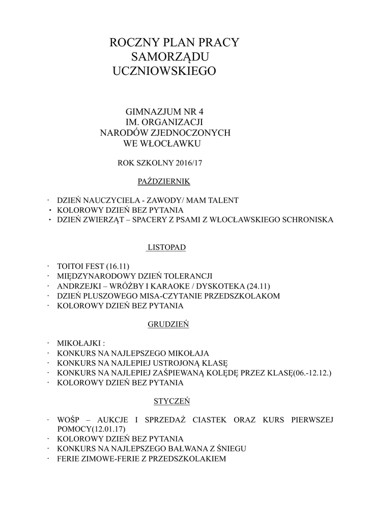 ROCZNY PLAN PRACY SAMORZĄDU UCZNIOWSKIEGO GIMNAZJUM NR 4 IM. ORGANIZACJI NARODÓW ZJEDNOCZONYCH WE WŁOCŁAWKU ROK SZKOLNY 2016/17 PAŹDZIERNIK • DZIEŃ NAUCZYCIELA - ZAWODY/ MAM TALENT KOLOROWY DZIEŃ BEZ PYTANIA DZIEŃ ZWIERZĄT – SPACERY Z PSAMI Z WŁOCŁAWSKIEGO SCHRONISKA LISTOPAD • • • • • TOITOI FEST (16.11) MIĘDZYNARODOWY DZIEŃ TOLERANCJI ANDRZEJKI – WRÓŻBY I KARAOKE / DYSKOTEKA (24.11) DZIEŃ PLUSZOWEGO MISA-CZYTANIE PRZEDSZKOLAKOM KOLOROWY DZIEŃ BEZ PYTANIA GRUDZIEŃ • • • • • MIKOŁAJKI : KONKURS NA NAJLEPSZEGO MIKOŁAJA KONKURS NA NAJLEPIEJ USTROJONĄ KLASĘ KONKURS NA NAJLEPIEJ ZAŚPIEWANĄ KOLĘDĘ PRZEZ KLASĘ(06.-12.12.) KOLOROWY DZIEŃ BEZ PYTANIA STYCZEŃ • WOŚP – AUKCJE I SPRZEDAŻ CIASTEK ORAZ KURS PIERWSZEJ POMOCY(12.01.17) • KOLOROWY DZIEŃ BEZ PYTANIA • KONKURS NA NAJLEPSZEGO BAŁWANA Z ŚNIEGU • FERIE ZIMOWE-FERIE Z PRZEDSZKOLAKIEM LUTY • POCZTA WALETYNKOWA • KOLOROWY DZIEŃ BEZ PYTANIA • NOC HORRORÓW W SZKOLE MARZEC • DZIEŃ KOBIET – KONCERT ŻYCZEŃ(08.03.17) • POCZĄTEK ASTRONOMICZNEJ WIOSNY-MAM TALENT/ DYSKOTEKA(22.03.17) • MIĘDZYNARODOWY DZIEŃ TEATRU • KOLOROWY DZIEŃ BEZ PYTANIA KWIECIEŃ • KONKURS NA NAJŁADNIEJSZĄ KARTKĘ WIELKANOCNĄ • KIERMASZ ŚWIĄTECZNY KARTEK PRZYGOTOWANYCH PRZEZ UCZNI • WIELKANOC MAJ • DZIEŃ MLEKA • DZIEŃ EUROPY • DZIEŃ PRAW ZWIERZĄT-SPACER Z PSAMI Z WŁOCŁAWSKIEGO SCHRONISKA • DZIEŃ FLAGI-DZIEŃ BEZ PYTANIA Z FLAGĄ NA PIERSI LUB BARWY NARODOWE NA ODZIEŻY CZERWIEC • DZIEŃ DZIECKA – ZAWODY KLASOWE/ MAM TALENT • MIĘDZYNARODOWY DZIEŃ POMAGANIA DZIECIOM Z AFRYKI – KIERMASZ CIASTEK • UROCZYSTE ZAKOŃCZENIE ROKU SZKOLNEGO 2016/17 KOLOROWY DZIEŃ ZASADY: 1. Kolorowy Dzień przypada na ostatni dzień roboczy każdego miesiąca poczynając od października 2016 roku 2. Przewodniczący Szkolnego Samorządu Uczniowskiego wraz z opiekunami ustalają listę obowiązujących kolorów i powieszą w Pokoju Nauczycielskim oraz tablicy SSU 3. Uczeń, który w wyznaczony dzień przyjdzie w wyznaczonym wcześniej kolorze jest zwolniony z: Niezapowiedzianego sprawdzianu Odpowiadania 4. Każdy uczeń bez względu na strój jest zobowiązany: Do napisania klasówki Odrobienia pracy domowej Przygotowania do zajęć LISTA KOLORÓW Październik –pomarańczowy Listopad –żółty Grudzień –biały Styczeń –fioletowy Luty –czerwony Marzec –zielony Kwiecień –niebieski Maj –różowy Czerwiec –indiańskie lato :D