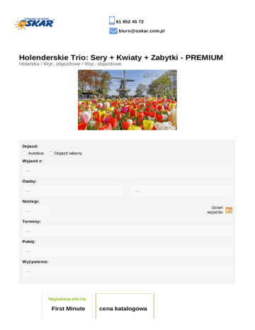 61 852 45 72 [email protected] Holenderskie Trio: Sery + Kwiaty + Zabytki - PREMIUM Holandia / Wyc. objazdowe / Wyc. objazdowe Dojazd: Autobus Dojazd własny Wyjazd z: Osoby: Noclegi: Dzień wyjazdu Terminy: Pokój: Wyżywienie: Najtańsza oferta First Minute cena katalogowa do 11 marca 2017: 346,20 zł do 11 marca 2017: 346,20 zł do 4 kwietnia 2017: 807,80 zł do 4 kwietnia 2017: 807,80 zł Suma:1154,00 Suma: zł 1154,00 zł Opis oferty Miejscowość Przejazd autokarem PREMIUM autokar-premium-oskar-tablet-gniazdko-usb-wygodne-fotele Opinie Realizacja imprezy autokarami PREMIUM to gwarancja: transportu autokarami z roczników 2015 i 2016 produkcji Irizar i VDL Rozkład jazdy indywidualnego, multimedialnego systemu rozrywki - tablet z dotykowym ekranem w każdym zagłówku (filmy, gry, muzyka itp.). Możliwość podłączenia własnego nośnika danych poprzez wejście AUX lub USB. najwyższej klasy skórzanych lub półskórzanych foteli z możliwością regulacji oparcia lub/i zagłówka największej w Polsce przestrzeni między siedzeniami małej półki przed każdym siedzeniem + siateczki na czasopisma, książki czy telefon bezpłatnego dostępu do sieci WiFi na terenie Polski* gniazdek elektrycznych 230V wydajnej klimatyzacji sterowanej indywidualnie bogato wyposażonego barku udostępnionego w czasie jazdy WC na pokładzie autokaru Idealna i komfortowa podróż… ZAWSZE! Na ternie Polski GWARANTUJEMY, że wszystkie przejazdy realizowane są autobusem, busem lub samochodem osobowym. Zapewnimy komfortowy transport na każdym etapie podróży. Ważne: Autokar Premium jest autokarem docelowym. *jakość usług internetowych może różnić się w zależności od jakości sygnału TOUR GUIDE oprowadzanie z indywidualnym systemem nagłośnieniowym Mobilny zestaw audio: indywidulany zestaw słuchawkowy połączony bezprzewodowo z mikrofonem pilota/przewodnika. Ubezpieczenie Warunki ubezpieczenia Bezpieczne Podróże Signal Iduna dokument do pobrania www.oskar.com.pl/zalaczniki/owu Warunki ubezpieczenia Kosztów Imprezy Turystycznej Signal Iduna dokument do pobrania www.oskar.com.pl/zalaczniki/owurg Karta Dużej Rodziny www.oskar.com.pl/zalaczniki/karta_duzej_rodziny Turystyczny Fundusz Gwarancyjny W związku z powołaniem do życia w dniu 26.11.2016 Turystycznego Funduszu Gwarancyjnego każdy klient Biura Podróży Oskar zobowiązany jest do zapłaty kwoty w wysokości 10zł/os. przy każdorazowej rezerwacji imprezy turystycznej (obowiązuje od dnia 26.11.2016). Kwota przeznaczona na Turystyczny Fundusz Gwarancyjny zostanie automatycznie doliczona do wartości rezerwacji (w momencie jej dokonania). Wyjątkiem są imprezy turystyczne odbywające się w krajach posiadających granicę z Rzeczpospolitą Polską. Składka nie jest przychodem biura. Warunki promocji FIRST MINUTE www.oskar.com.pl/zalaczniki/warunki_promocji Udogodnienia Klimatyzacja Regulowane fotele Tacki Multimedia Nowoczesna flota Zawodowy kierowca Pasy bezpieczeństwa Toaleta w autokarze Podnóżki Wi-Fi Bez paszportu Premium Elite Tour guide Program ramowy Dzień 1 Wyjazd z Polski zgodnie z rozkładem jazdy autokarów. Dzień 2 Przyjazd w do Alkmaar - miasteczka słynącego z targów serowych, w którym będziemy mieli możliwość zakupy holenderskiego sera. Następnie przejazd do jednej z fabryki serów Jacob's Hoeve (lub innej), a tam oprowadzanie z przewodnikiem, który pokaże nam z czego powstają prawdziwe holenderskie sery, jak wygląda ich proces produkcji oraz jak one smakują. Każdy z Was podczas wizyty w fabryce będzie mógł skosztować tego co wyda mu się najsmaczniejsze. Po oprowadzaniu przez przewodnika udamy się do sklepu, gdzie każdy w Was będzie mógł zakupić to, co najbardziej mu zasmakowało. Wieczorem wizyta z mieście Zaanstand, gdzie każdy z nas będzie miał okazję do zobaczenia prawdziwych holenderskich wiatraków czyli jednego z symboli Holandii. Nocleg na terenie Holandii. Dzień 3 Śniadanie. Wykwaterowanie z hotelu. Przejazd do ogrodów Keukenhof - najpiękniejszego parku wiosennego świata gdzie na powierzchni 32 ha można podziwiać ponad 7 milionów kwitnących tulipanów, żonkili, hiacyntów oraz innych roślin cebulowych. Dzień w Keukenhof to dzień pełen wspaniałych przeżyć i niezapomnianych wrażeń. Keukenhof pełen jest niepowtarzalnych kolorów i zapachów, które wywołują jedyne w swoim rodzaju poczucie wolności. Dysponuje doskonałym zapleczem, zachwyca 30 spektakularnymi wystawami kwiatowymi, zaskakującymi i inspirującymi ogrodami oraz tętniącymi życiem wydarzeniami. W godzinach południowych przejazd do Amsterdamu zwanego Wenecją Północy - miasta położonego na ponad sześciuset kanałach które kiedyś były drogą komunikacji i transportu towarów w tym portowym, kupieckim mieście, a teraz niezwykle malownicze, oddają specyficzny charakter miasta. W programie zwiedzania- Oude Kerk - "Stary Kościół" - jedna z najpiękniejszych budowli w mieście, najstarszy kościół, Nieuwe Kerk - kościół (z początku XV wieku), Magere Brud - najsłynniejszy most w Amsterdamie, Singel (najstarszy kanał), Plac Dam, Pałac Królewski, Plac Mennicy, Nieuwmarkt, Chinatown i dzielnica Czerwonych Latarni. Po zakończeniu zwiedzania czas wolny. W godzinach późnowieczornych wyjazd w drogę powrotną do Polski. Nocny przejazd. Dzień 4 Przyjazd do Polski. Cena obejmuje przejazd autokarem klasy LUX (klimatyzacja, DVD, WC, barek) zakwaterowanie: 1 nocleg wyżywienie: 1 śniadanie kontynentalne ubezpieczenie KL, NNW, bagaż opiekę pilota Cena nie obejmuje Dopłaty wymagane na miejscu koszty programowe: 30 €/os (obejmują bilet wstępu do Keukenhof, opłaty lokalne oraz usługę przewodnicką po Amsterdamie) - płatne u pilota w autokarze; nie podlegają rozliczeniu obiadokolacja: 15 €/os; płatne u pilota w autokarze Dopłaty opcjonalne godzinny rejs autobusem wodnym po kanałach Amsterdamu: 16 €/os z audioguide w języku polskim; (wymagana wcześniejsza dek