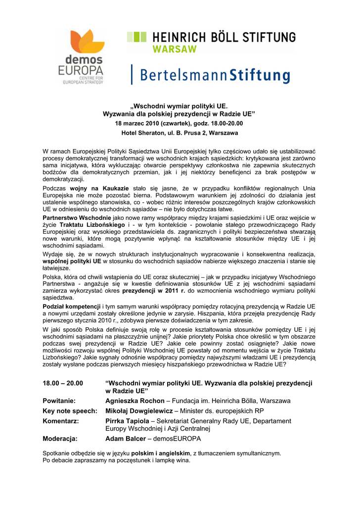 „Wschodni wymiar polityki UE. Wyzwania dla polskiej prezydencji w Radzie UE” 18 marzec 2010 (czwartek), godz. 18.00-20.00 Hotel Sheraton, ul. B. Prusa 2, Warszawa W ramach Europejskiej Polityki Sąsiedztwa Unii Europejskiej tylko częściowo udało się ustabilizować procesy demokratycznej transformacji we wschodnich krajach sąsiedzkich: krytykowana jest zarówno sama inicjatywa, która wykluczając otwarcie perspektywy członkostwa nie zapewnia skutecznych bodźców dla demokratycznych przemian, jak i jej niektórzy beneficjenci za brak postępów w demokratyzacji. Podczas wojny na Kaukazie stało się jasne, że w przypadku konfliktów regionalnych Unia Europejska nie może pozostać bierna. Podstawowym warunkiem jej zdolności do działania jest ustalenie wspólnego stanowiska, co - wobec różnic interesów poszczególnych krajów członkowskich UE w odniesieniu do wschodnich sąsiadów – nie było dotychczas łatwe. Partnerstwo Wschodnie jako nowe ramy współpracy między krajami sąsiedzkimi i UE oraz wejście w życie Traktatu Lizbońskiego i - w tym kontekście - powołanie stałego przewodniczącego Rady Europejskiej oraz wysokiego przedstawiciela ds. zagranicznych i polityki bezpieczeństwa stwarzają nowe warunki, które mogą pozytywnie wpłynąć na kształtowanie stosunków między UE i jej wschodnimi sąsiadami. Wydaje się, że w nowych strukturach instytucjonalnych wypracowanie i konsekwentna realizacja, wspólnej polityki UE w stosunku do wschodnich sąsiadów nabierze większego znaczenia i stanie się łatwiejsze. Polska, która od chwili wstąpienia do UE coraz skuteczniej – jak w przypadku inicjatywy Wschodniego Partnerstwa - angażuje się w kwestie definiowania stosunków UE z jej wschodnimi sąsiadami zamierza wykorzystać okres prezydencji w 2011 r. do wzmocnienia wschodniego wymiaru polityki sąsiedztwa. Podział kompetencji i tym samym warunki współpracy pomiędzy rotacyjną prezydencją w Radzie UE a nowymi urzędami zostały określone jedynie w zarysie. Hiszpania, która przejęła prezydencję Rady pierwszego stycznia 2010 r., zdobywa pierwsze doświadczenia w tym zakresie. W jaki sposób Polska definiuje swoją rolę w procesie kształtowania stosunków pomiędzy UE i jej wschodnimi sąsiadami na płaszczyźnie unijnej? Jakie priorytety Polska chce określić w tym obszarze podczas swej prezydencji w Radzie UE? Jakie cele powinny zostać osiągnięte? Jakie nowe możliwości rozwoju wspólnej Polityki Wschodniej UE powstały od momentu wejścia w życie Traktatu Lizbońskiego? Jakie sygnały odnośnie współpracy pomiędzy najwyższymi władzami UE i prezydencją zostały wysłane podczas pierwszych miesięcy hiszpańskiego przewodnictwa w Radzie UE? 18.00 – 20.00 “Wschodni wymiar polityki UE. Wyzwania dla polskiej prezydencji w Radzie UE” Powitanie: Agnieszka Rochon – Fundacja im. Heinricha Bölla, Warszawa Key note speech: Mikołaj Dowgielewicz – Minister ds. europejskich RP Komentarz: Pirrka Tapiola – Sekretariat Generalny Rady UE, Departament Europy Wschodniej i Azji Centralnej Moderacja: Adam Balcer – demosEUROPA Spotkanie odbędzie się w języku polskim i angielskim, z tłumaczeniem symultanicznym. Po debacie zapraszamy na poczęstunek i lampkę wina.