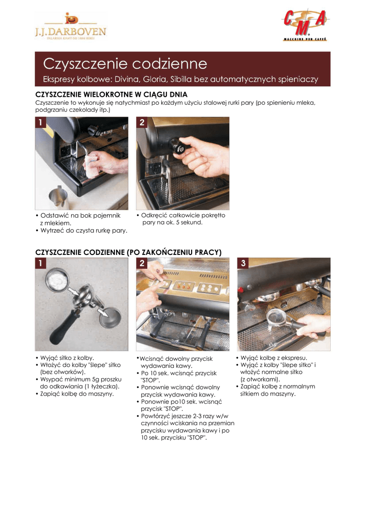 CZYSZCZENIE WIELOKROTNE W CIĄGU DNIA Czyszczenie to wykonuje się natychmiast po każdym użyciu stalowej rurki pary (po spienieniu mleka, podgrzaniu czekolady itp.) • Odstawić na bok pojemnik z mlekiem. • Wytrzeć do czysta rurkę pary. • Odkręcić całkowicie pokrętło pary na ok. 5 sekund. CZYSZCZENIE CODZIENNE (PO ZAKOŃCZENIU PRACY) • Wyjąć sitko z kolby. • Włożyć do kolby "ślepe" sitko (bez otworków). • Wsypać minimum 5g proszku do odkawiania (1 łyżeczka). • Zapiąć kolbę do maszyny. •Wcisnąć dowolny przycisk • Wyjąć kolbę z ekspresu. • Wyjąć z kolby "ślepe sitko" i wydawania kawy. włożyć normalne sitko • Po 10 sek. wcisnąć przycisk (z otworkami). "STOP". • Zapiąć kolbę z normalnym • Ponownie wcisnąć dowolny sitkiem do maszyny. przycisk wydawania kawy. • Ponownie po10 sek. wcisnąć przycisk "STOP". • Powtórzyć jeszcze 2-3 razy w/w czynności wciskania na przemian przycisku wydawania kawy i po 10 sek. przycisku "STOP". • Wcisnąć dowolny przycisk wydawania kawy. • Po 10 sek. wcisnąć przycisk "STOP". • Ponownie wcisnąć dowolny przycisk wydawania kawy. •Ponownie po10 sek. wcisnąć przycisk "STOP". • Powtórzyć jeszcze 2-3 razy w/w czynności wciskania na przemian przycisku wydawania kawy i po 10 sek. przycisku "STOP". • Odkręcić końcówkę z rurki pary. • Przekuć otworki w końcówce przy pomocy igły. • Wypłukać końcówkę pod bieżącą ciepłą wodą. • Zakręcić końcówkę na rurce pary. • Rozłożyć kolby na części. • Zanurzyć części w ciepłej wodzie z detergentami i zostawić na całą noc. • Opłukaćczęścipodbieżącą, ciepłą wodą. • Złożyćkolby.