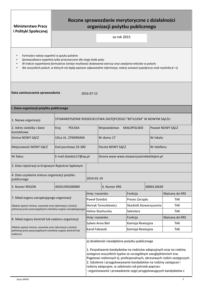 ZŽĐnjŶĞƐƉƌĂǁŽnjĚĂŶŝĞŵĞƌLJƚŽƌLJĐnjŶĞnjĚnjŝĂųĂůŶŽƑĐŝ ŽƌŐĂŶŝnjĂĐũŝƉŽǏLJƚŬƵƉƵďůŝĐnjŶĞŐŽ Ministerstwo Pracy ŝWŽůŝƚLJŬŝ^ƉŽųĞĐnjŶĞũ za rok 2015 • • • • &ŽƌŵƵůĂƌnjŶĂůĞǏLJǁLJƉĞųŶŝđǁũħnjLJŬƵƉŽůƐŬŝŵ͖ ^ƉƌĂǁŽnjĚĂǁĐĂǁLJƉĞųŶŝĂƚLJůŬŽƉƌnjĞnjŶĂĐnjŽŶĞĚůĂŶŝĞŐŽďŝĂųĞƉŽůĂ͖ tƚƌĂŬĐŝĞǁLJƉĞųŶŝĂŶŝĂĨŽƌŵƵůĂƌnjĂŝƐƚŶŝĞũĞŵŽǏůŝǁŽƑđĚŽĚĂǁĂŶŝĂǁŝĞƌƐnjLJŽƌĂnjnjĂǁŝũĂŶŝĂƚĞŬƐƚſǁǁƉŽůĂĐŚ͖ tĞǁƐnjLJƐƚŬŝĐŚƉŽůĂĐŚ͕ǁŬƚſƌLJĐŚŶŝĞďħĚČǁƉŝƐĂŶĞŽĚƉŽǁŝĞĚŶŝĞŝŶĨŽƌŵĂĐũĞ͕ŶĂůĞǏLJǁƐƚĂǁŝđƉŽũĞĚLJŶĐnjLJnjŶĂŬŵLJƑůŶŝŬĂ (--–). Data zamieszczenia sprawozdania 2016-07-15 /͘ĂŶĞŽƌŐĂŶŝnjĂĐũŝƉŽǏLJƚŬƵƉƵďůŝĐnjŶĞŐŽ 1. Nazwa organizacji ^dKtZz^E/ZK//>^dt^d%W'KΗd>:DΗtEKtzD^h 2. Adres siedziby i dane kontaktowe Kraj 'ŵŝŶĂEKtz^ POLSKA tŽũĞǁſĚnjƚǁŽDBKWK>^</ WŽǁŝĂƚEKtz^ Ulica UL. ZYNDRAMA Nr domu 17 Nr lokalu DŝĞũƐĐŽǁŽƑđEKtz^ Kod pocztowy 33-300 WŽĐnjƚĂEKtz^ Nr telefonu Nr faksu E-mail [email protected] Strona www www.stowarzyszeniebetlejem.pl ϯ͘ĂƚĂƌĞũĞƐƚƌĂĐũŝǁ<ƌĂũŽǁLJŵZĞũĞƐƚƌnjĞ^ČĚŽǁLJŵ ϰ͘ĂƚĂƵnjLJƐŬĂŶŝĂƐƚĂƚƵƐƵŽƌŐĂŶŝnjĂĐũŝƉŽǏLJƚŬƵ publicznego 5. Numer REGON 49201395500000 ϳ͘^ŬųĂĚŽƌŐĂŶƵnjĂƌnjČĚnjĂũČĐĞŐŽŽƌŐĂŶŝnjĂĐũŝ ;EĂůĞǏLJǁƉŝƐĂđŝŵŝŽŶĂ͕ŶĂnjǁŝƐŬĂŽƌĂnjŝŶĨŽƌŵĂĐũĞŽĨƵŶŬĐũŝ ƉĞųŶŝŽŶĞũƉƌnjĞnjƉŽƐnjĐnjĞŐſůŶLJĐŚĐnjųŽŶŬſǁŽƌŐĂŶƵnjĂƌnjČĚnjĂũČĐĞŐŽͿ ϴ͘^ŬųĂĚŽƌŐĂŶƵŬŽŶƚƌŽůŝůƵďŶĂĚnjŽƌƵŽƌŐĂŶŝnjĂĐũŝ ;EĂůĞǏLJǁƉŝƐĂđŝŵŝŽŶĂ͕ŶĂnjǁŝƐŬĂŽƌĂnjŝŶĨŽƌŵĂĐũĞŽĨƵŶŬĐũŝ ƉĞųŶŝŽŶĞũƉƌnjĞnjƉŽƐnjĐnjĞŐſůŶLJĐŚĐnjųŽŶŬſǁŽƌŐĂŶƵŬŽŶƚƌŽůŝůƵď nadzoru) 2014-01-14 6. Numer KRS 0000110630 /ŵŝħŝŶĂnjǁŝƐŬŽ Funkcja Wpisany do KRS WĂǁĞųnjŝĞĚnjŝĐ WƌĞnjĞƐĂƌnjČĚƵ TAK Henryk Tereszkiewicz Skarbnik Stowarzyszenia TAK Halina Stachurska Sekretarz TAK /ŵŝħŝŶĂnjǁŝƐŬŽ Funkcja Sylwia Anna Biel Komisja Rewizyjna TAK <ĂƌŽů&ĂųŽǁƐŬŝ Komisja Rewizyjna TAK Wpisany do KRS ĂͿĚnjŝĂųĂůŶŽƑđŶŝĞŽĚƉųĂƚŶĂƉŽǏLJƚŬƵƉƵďůŝĐnjŶĞŐŽ 1. Pozyskiwanie kandydatów na rodziców adopcyjnych oraz na rodziny njĂƐƚħƉĐnjĞǁƐnjLJƐƚŬŝĐŚƚLJƉſǁnjĞƐnjĐnjĞŐſůŶLJŵƵǁnjŐůħĚŶŝĞŶŝĞŵƚnjǁ͘ WŽŐŽƚŽǁŝƌŽĚnjŝŶŶLJĐŚƚũ͘ƉƌŽĨĞƐũŽŶĂůŶLJĐŚ͕ŽŬƌĞƐŽǁLJĐŚƌŽĚnjŝŶnjĂƐƚħƉĐnjLJĐŚ͘ 2͘^njŬŽůĞŶŝĞŝƉƌnjLJŐŽƚŽǁLJǁĂŶŝĞŬĂŶĚLJĚĂƚſǁŶĂƌŽĚnjŝŶLJnjĂƐƚħƉĐnjĞŝ ƌŽĚnjŝŶLJĂĚŽƉĐLJũŶĞ͕ǁnjĂůĞǏŶŽƑĐŝŽĚƉŽƚƌnjĞďƉŽƉƌnjĞnj͗ ͲŽƌŐĂŶŝnjŽǁĂŶŝĞŝƉƌŽǁĂĚnjĞŶŝĞnjĂũħđƉƌnjLJŐŽƚŽǁƵũČĐLJĐŚŬĂŶĚLJĚĂƚſǁnj Druk: MPiPS 1 9. Cele statutowe organizacji ;EĂůĞǏLJŽƉŝƐĂđĐĞůĞŶĂƉŽĚƐƚĂǁŝĞƐƚĂƚƵƚƵŽƌŐĂŶŝnjĂĐũŝͿ dziedziny psychologii, prawa, socjologii, pedagogiki, medycyny itp. ͲŽƉƌĂĐŽǁLJǁĂŶŝĞŝƌŽnjƉƌŽǁĂĚnjĂŶŝĞŵĂƚĞƌŝĂųſǁƐnjŬŽůĞŶŝŽǁLJĐŚ͕ ͲƵĚnjŝĞůĂŶŝĞƉŽŵŽĐLJǁnjĂųĂƚǁŝĂŶŝƵĨŽƌŵĂůŶŽƑĐŝnjǁŝČnjĂŶLJĐŚnjƵƚǁŽƌnjĞŶŝĞŵ ƌŽĚnjŝŶLJnjĂƐƚħƉĐnjĞũůƵďĂĚŽƉĐLJũŶĞũ͕ - prowadzenie kwalifikacji rodzin do odpowiednich form opieki nad dzieckiem, ͲƉŽƑƌĞĚŶŝĐnjĞŶŝĞǁĂĚŽƉĐũŝ͘ 3͘tƐƉŝĞƌĂŶŝĞŝŽƌŐĂŶŝnjŽǁĂŶŝĞƐĂŵŽƉŽŵŽĐLJƌŽĚnjŝŶnjĂƐƚħƉĐnjLJĐŚŝ ĂĚŽƉĐLJũŶLJĐŚƐnjĐnjĞŐſůŶŝĞĐnjųŽŶŬſǁ^ƚŽǁĂƌnjLJƐnjĞŶŝĂƉŽƉƌnjĞnj͗ ͲƌĞŐƵůĂƌŶĞƐƉŽƚŬĂŶŝĂŐƌƵƉŽǁĞĐĞůĞŵǁLJŵŝĂŶLJĚŽƑǁŝĂĚĐnjĞŷ͕ - spotkania towarzyskie, wyjazdy integracyjne, ͲŽƌŐĂŶŝnjŽǁĂŶŝĞƐnjŬŽůĞŷŝŵŽǏůŝǁŽƑĐŝƵnjLJƐŬŝǁĂŶŝĂƉŽƌĂĚƐƉĞĐũĂůŝƐƚLJĐnjŶLJĐŚ͕ psychologicznych, prawnych, itp. ͲǁƐnjĞĐŚƐƚƌŽŶŶĂƉŽŵŽĐǁƐLJƚƵĂĐũĂĐŚŬƌLJnjLJƐƵƌŽĚnjŝŶLJŶƉ͘ƉƐLJĐŚŽůŽŐŝĐnjŶČ ƐŽĐũĂůŶČ͕ƉƌĂǁŶČŝƚƉ͘ ͲƉŽĚĞũŵŽǁĂŶŝĞĚnjŝĂųĂŷnjǁŝČnjĂŶLJĐŚnjƵƐĂŵŽĚnjŝĞůŶŝĞŶŝĞŵĚnjŝĞĐŬĂǁ ƌŽĚnjŝŶŝĞnjĂƐƚħƉĐnjĞũ͘ 4͘KƌŐĂŶŝnjŽǁĂŶŝĞŝƉƌŽǁĂĚnjĞŶŝĞƐnjĞƌŽŬŝĞŐŽƐƉĞŬƚƌƵŵĚnjŝĂųĂŷ ƵŵŽǏůŝǁŝĂũČĐLJƉŽǁƌſƚĚnjŝĞĐŬĂnjĞƑƌŽĚŽǁŝƐŬĂnjĂƐƚħƉĐnjĞŐŽ;ƌŽĚnjŝŶĂ njĂƐƚħƉĐnjĂ͕ĚŽŵĚnjŝĞĐŬĂŝƚƉ͘ͿĚŽƌŽĚnjŝŶLJŶĂƚƵƌĂůŶĞũ͘ 5͘WŽĚĞũŵŽǁĂŶŝĞĚnjŝĂųĂŷƉƌŽĨŝůĂŬƚLJĐnjŶLJĐŚ͕ĚnjŝĂųĂŷŝŶƚĞƌǁĞŶĐLJũŶLJĐŚŝ udzielanie stosownej pomocy w sytuacjach, gdy dobro dziecka lub jego ƌŽĚnjŝŶLJũĞƐƚnjĂŐƌŽǏŽŶĞŵ͘ŝŶ͘ƉŽƉƌnjĞnj͗ ͲƐnjŬŽůĞŶŝĞŝĂŬĐũĞƉƌŽƉĂŐƵũČĐĞnjĚƌŽǁČƌŽĚnjŝŶħ͕ ͲƉƌnjLJŐŽƚŽǁLJǁĂŶŝĞŝƌŽnjƉƌŽǁĂĚnjĂŶŝĞŵĂƚĞƌŝĂųſǁnjĂƉŽďŝĞŐĂũČĐLJĐŚ alkoholizmowi, narkomanii, przemocy w rodzinie i radzenia sobie z ich skutkami, - interwencje i udzielanie stosownej pomocy dla rodzin w kryzysie (terapia, szkolenie, pomoc prawna, ekonomiczna, psychologiczna itp.), ͲƵŵŝĞƐnjĐnjĞŶŝĞͲŽŝůĞnjĂŝƐƚŶŝĞũĞƚĂŬĂƉŽƚƌnjĞďĂͲĚnjŝĞĐŬĂnjĂŐƌŽǏŽŶĞŐŽǁ njĂƐƚħƉĐnjLJŵƑƌŽĚŽǁŝƐŬƵŶĂŽŬƌĞƑůŽŶLJĐnjĂƐ͕ ͲĂŶĂůŝnjĂƉŽƚƌnjĞďǁnjĂŬƌĞƐŝĞƉƌŽĨŝůĂŬƚLJŬŝŽƉŝĞŬŝŶĂĚĚnjŝĞĐŬŝĞŵŝƌŽĚnjŝŶČ͘ 6͘tƐƉŝĞƌĂŶŝĞŬŽďŝĞƚǁĐŝČǏLJ;ĚůĂŬƚſƌLJĐŚnjƌſǏŶLJĐŚƉŽǁŽĚſǁƵƌŽĚnj