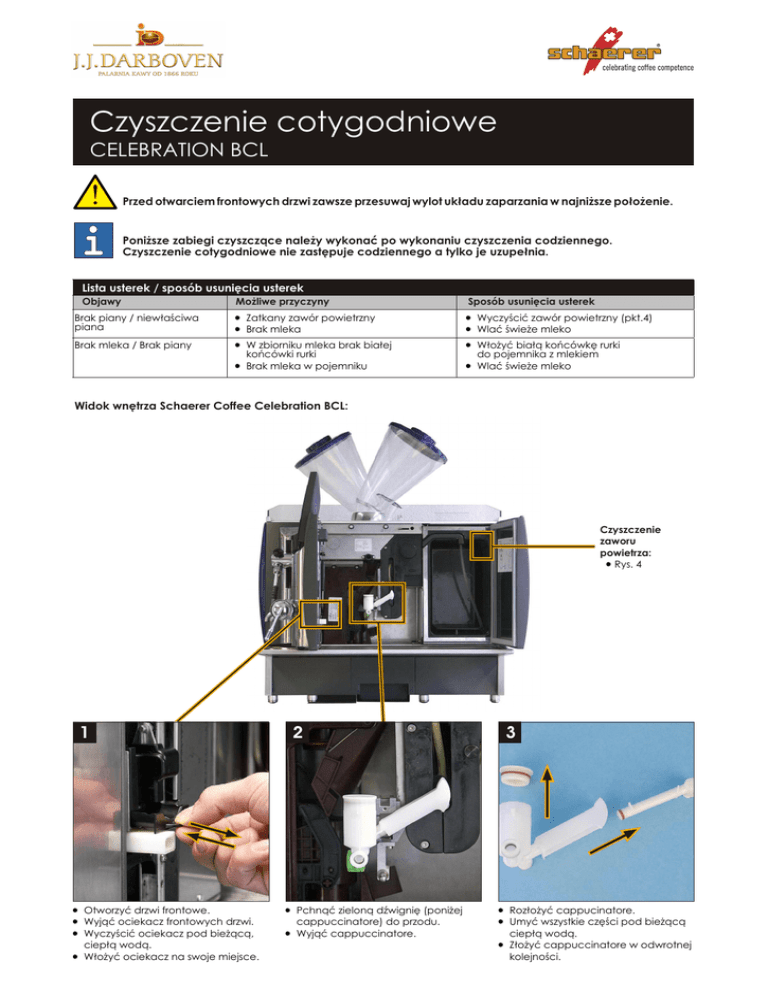 Czyszczenie cotygodniowe CELEBRATION BCL Przed otwarciem frontowych drzwi zawsze przesuwaj wylot uk³adu zaparzania w najni¿sze po³o¿enie. Poni¿sze zabiegi czyszcz¹ce nale¿y wykonaæ po wykonaniu czyszczenia codziennego. Czyszczenie cotygodniowe nie zastêpuje codziennego a tylko je uzupe³nia. Lista usterek / sposób usuniêcia usterek Objawy Mo¿liwe przyczyny Sposób usuniêcia usterek Brak piany / niew³aœciwa piana & Zatkany zawór powietrzny & Brak mleka & Wyczyœciæ zawór powietrzny (pkt.4) & Wlaæ œwie¿e mleko Brak mleka / Brak piany & W zbiorniku mleka brak bia³ej koñcówki rurki & Brak mleka w pojemniku & W³o¿yæ bia³¹ koñcówkê rurki do pojemnika z mlekiem & Wlaæ œwie¿e mleko Widok wnêtrza Schaerer Coffee Celebration BCL: Czyszczenie zaworu powietrza: & Rys. 4 1 & Otworzyæ drzwi frontowe. & Wyj¹æ ociekacz frontowych drzwi. & Wyczyœciæ ociekacz pod bie¿¹c¹, ciep³¹ wod¹. & W³o¿yæ ociekacz na swoje miejsce. 2 & Pchn¹æ zielon¹ dŸwigniê (poni¿ej cappuccinatore) do przodu. & Wyj¹æ cappuccinatore. 3 & Roz³o¿yæ cappucinatore. & Umyæ wszystkie czêœci pod bie¿¹c¹ ciep³¹ wod¹. & Z³o¿yæ cappuccinatore w odwrotnej kolejnoœci. 4 5 & Zdj¹æ pokrywê pompy (poluŸniæ œrubê). & Wyj¹æ koñcówkê z zaworem powietrza. & Czyœciæ zawór powietrza specjaln¹ koñcówk¹. & Zmontowaæ czêœci w odwrotnej kolejnoœci. & Zamkn¹æ drzwi frontowe. & Przesun¹æ wylot uk³adu zaparzania w najni¿sze po³o¿enie. & Ci¹gn¹æ os³onê wylotu w kierunku strza³ki. Zawór powietrza jest w³aœciwie po³¹czony jak na pozycji ! 7 8 & Otworzyæ drzwi frontowe. & Nanieœæ na bibu³ê papierow¹ œrodek w sprayu do czyszczenia szk³a i czyœciæ bibu³¹ ekran bez dociskania. Nigdy nie nanoœ œrodka w sprayu bezpoœrednio na ekran! & Przesun¹æ wylot uk³adu zaparzania w najni¿sze po³o¿enie. & Otworzyæ drzwi frontowe. & Wyj¹æ pojemnik na fusy. & Poci¹gn¹æ w dó³ dŸwigniê (zdjêcie). & Unieœæ agregat w kierunku i nachyliæ do przodu. & Obróciæ agregat w lewo (90°) i wyci¹gn¹æ na zewn¹trz . & Wysuszyæ ekran bibu³¹ papierow¹. & Zamkn¹æ drzwi frontowe. J.J. Darboven Poland Sp. z o.o. 84-230 Rumia ul. Kolejowa 54 6 & Trzymaæ ten wylot w dwóch d³oniach. & Ostro¿nie œci¹gn¹æ pokrywê wylotu w kierunku strza³ki. & Czyœciæ os³onê wylotu oraz pokrywê wylotu pod bie¿¹c¹, ciep³¹ wod¹. & Z³o¿yæ wszystkie czêœci w odwrotnej kolejnoœci ( 6 - 5 ) i w³o¿yæ je na swoje miejsce. 9 & Myæ agregat dok³adnie z dwu stron / pod bie¿¹c¹ ciep³¹ wod¹. & Usun¹æ resztki kawy miêkk¹ œciereczk¹. Nigdy nie u¿ywaæ misek do mycia agregatu. & Agregat musi byæ ca³kowicie wyschniêty przed w³o¿eniem do maszyny. & W³o¿yæ pojemnik na odpady. & Zamkn¹æ drzwi frontowe. tel. 0-801 567 890 0-58 679 49 29 e-mail: [email protected] www.darboven.pl