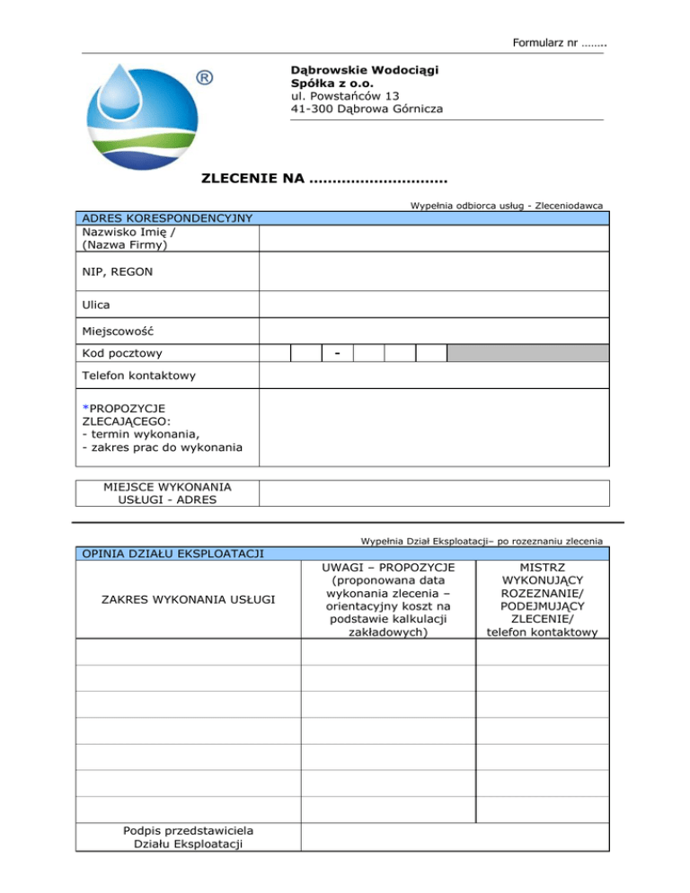 Formularz nr …….. Dąbrowskie Wodociągi Spółka z o.o. ul. Powstańców 13 41-300 Dąbrowa Górnicza ZLECENIE NA ………………………… Wypełnia odbiorca usług - Zleceniodawca ADRES KORESPONDENCYJNY Nazwisko Imię / (Nazwa Firmy) NIP, REGON Ulica Miejscowość Kod pocztowy - Telefon kontaktowy *PROPOZYCJE ZLECAJĄCEGO: - termin wykonania, - zakres prac do wykonania MIEJSCE WYKONANIA USŁUGI - ADRES Wypełnia Dział Eksploatacji– po rozeznaniu zlecenia OPINIA DZIAŁU EKSPLOATACJI ZAKRES WYKONANIA USŁUGI Podpis przedstawiciela Działu Eksploatacji UWAGI – PROPOZYCJE (proponowana data wykonania zlecenia – orientacyjny koszt na podstawie kalkulacji zakładowych) MISTRZ WYKONUJĄCY ROZEZNANIE/ PODEJMUJĄCY ZLECENIE/ telefon kontaktowy Formularz nr …….. Wypełnia Dział Eksploatacji – po wykonaniu zlecenia REALIZACJA – DZIAŁ EKSPLOATACJI Termin realizacji Godzina realizacji od; do Koszt realizacji zlecenia Uwagi Podpis przedstawiciela Działu Eksploatacji Podpis Zleceniodawcy – Akceptacja kosztów, potwierdzenie wykonania usługi *ZLECAJĄCY OKREŚLA ZAKRES USŁUG po zapoznaniu się z cennikiem dostępnym na stanowisku Obsługi Klienta (CENNIK W ZAŁĄCZENIU) Klient może zlecić do Dąbrowskich Wodociągów Sp. z o.o. wykonanie następujących usług: a. zlokalizowanie nieszczelności przyłącza lub sieci wodociągowej - należy przedstawić: orientacyjną długość kontrolowanego przyłącza (sieci), plan sytuacyjny (jeśli posiada) lub orientacyjną trasę przebiegu przyłącza (sieci) b. monitoring TV wodociągu - należy określić: średnicę monitorowanego przyłącza lub sieci wodociągowej, materiał z jakiego wykonano rurociąg c. trasowanie ( wyznaczenie w terenie przebiegu) przyłącza lub sieci wodociągowej - należy przedstawić: orientacyjną długość sprawdzanego odcinka d. wykonanie włączenia tzw. Wcinki do sieci wodociągowej wraz z zainstalowaniem zasuwy włączeniowej - należy przedstawić: projekt techniczny, uzgodnienia branżowe e. wykonanie przyłącza od sieci wodociągowej do budynku - należy przedstawić: projekt techniczny, uzgodnienia branżowe f. usunięcie awarii na przyłączu lub sieci wodociągowej - należy określić: zakres prac takich jak: wykonanie renowacji przyłącza lub sieci, odsłonięcie wykopu g. nadzór nad wykonaniem prac ziemnych w okolicach sieci wodociągowej - należy przedstawić: uzgodnienia z Działem Rozwoju Technicznego Klient może również wnioskować o udostępnienie lub wykonanie kopii dokumentacji hydrogeologicznej określając jednocześnie zakres jakim jest zainteresowany. Wnioskodawca wyraża zgodę na przetwarzanie przez Dąbrowskie Wodociągi Sp. z o.o. podanych powyżej danych osobowych w celu sporządzenia i realizacji umowy o zaopatrzenie w wodę i/lub odprowadzanie ścieków oraz w celu realizacji wniosku zgodnie z ustawą z dnia 29 sierpnia 1997r. o ochronie danych osobowych ( tj. Dz. U. z 2002 r. Nr 101 poz. 926 z późń. Zm.). …………………………………………………… Data i czytelny podpis Wnioskodawcy