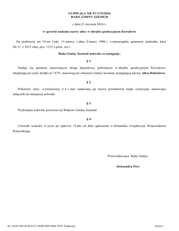 UCHWAŁA NR XV/175/2016 RADY GMINY SZEMUD z dnia 21 stycznia 2016 r. w sprawie nadania nazwy ulicy w obrębie geodezyjnym Kowalewo Na podstawie art. 18 ust. 2 pkt. 13 ustawy z dnia 8 marca 1990 r. o samorządzie gminnym (jednolity tekst Dz. U. z 2015 roku, poz. 1515 z późn. zm.) Rada Gminy Szemud uchwala co następuje: § 1. Nadaje się gruntom stanowiącym drogę dojazdową, położonym w obrębie geodezyjnym Kowalewo, obejmującym część działki nr 15/55, stanowiącym własność Gminy Szemud, następującą nazwę: ulica Daktylowa. § 2. Położenie ulicy, wymienionej w § 1 oraz nadawaną jej nazwę przedstawia mapa sytuacyjna stanowiąca załącznik do niniejszej uchwały. § 3. Wykonanie uchwały powierza się Wójtowi Gminy Szemud. § 4. Uchwała wchodzi w życie po upływie 14 dni od dnia ogłoszenia w Dzienniku Urzędowym Województwa Pomorskiego. Przewodnicząca Rady Gminy Aleksandra Perz Id: A438119D-661B-4A73-984B-009C9D8C7EFF. Podpisany Strona 1 Załącznik do Uchwały Nr XV/175/2016 Rady Gminy Szemud Mapa sytuacyjna - Kowalewo ul. Daktylowa Id: A438119D-661B-4A73-984B-009C9D8C7EFF. Podpisany Strona 1