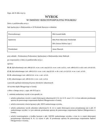 Sygn. akt II AKa 123/13 WYROK W IMIENIU RZECZYPOSPOLITEJ POLSKIEJ Dnia 17 października 2013 r. Sąd Apelacyjny w Białymstoku w II Wydziale Karnym w składzie: Przewodniczący SSA Leszek Kulik Sędziowie SSA Piotr Sławomir Niedzielak SSA Janusz Sulima (spr.) Protokolant Anna Tkaczyk przy udziale - Prokuratora Prokuratury Apelacyjnej w Białymstoku Anny Malczyk po rozpoznaniu w dniu 10 października 2013 r. sprawy: K. K. (1) oskarżonej z art. 286 §1 k.k. w zw. z art. 294 §1 k.k. w zw. z art. 12 k.k., z art. 286 §1 k.k. w zb. z art. 270 §1 k.k. Z. K. (1) oskarżonego z art. 286 §1 k.k. w zw. z art. 294 §1 k.k. w zb. z art. 271 §1 k.k. w zw. z art. 12 k.k. S. D. oskarżonego z art. 286 §1 k.k. w zw. z art. 12 k.k. I. O. oskarżonego z art. 286 §1 k.k. w zw. z art. 12 k.k. z powodu apelacji wniesionych przez obrońców oskarżonych od wyroku Sądu Okręgowego w Łomży z dnia 11 lutego 2013 r., sygn. akt II K 39/11 I. zmienia zaskarżony wyrok w ten sposób, że: • uchyla zaskarżony wyrok w części dotyczącej oskarżonych Z. K. (1), S. D. oraz I. O. i w tym zakresie przekazuje sprawę do ponownego rozpoznania Sądowi Okręgowemu w Łomży, • uchyla orzeczenie o karze łącznej z pkt. XXVI zaskarżonego wyroku, • uchyla zaskarżony wyrok odnośnie oskarżonej K. K. (1) w części dotyczącej czynu przypisanego jej w pkt. II zaskarżonego wyroku i w tym zakresie przekazuje sprawę do ponownego rozpoznania Sądowi Okręgowemu w Łomży, • uchyla rozstrzygnięcie o środku karnym z pkt. XXVIII zaskarżonego wyroku, z tym że w części dotyczącej przypisanego oskarżonej K. K. (1) czynu w pkt. II przekazuje sprawę do ponownego rozpoznania Sądowi Okręgowemu w Łomży, • z opisu czynu przypisanego oskarżonej K. K. (1) w pkt. I eliminuje sformułowanie „i powstania w/w spółdzielni szkody znacznej wartości w wysokości 284.913,02 złotych”, • zmniejsza orzeczoną wobec oskarżonej K. K. (1) za czyn przypisany jej w pkt. I grzywnę do 50 (pięćdziesięciu) stawek dziennych, obniżając jednocześnie wysokość jednej stawki do 30 (trzydziestu) złotych, • w ramach czynów przypisanych oskarżonej K. K. (1) w punktach od III do XI i w punktach od XIII do XV uznaje ją za winną tego, że: a) wykonując obowiązki kasjerki Spółdzielni (...) w G. woj. (...) w dniu 28 lutego 2003 r. użyła jako autentycznego dokumentu w postaci dowodu wypłaty z dnia 28 lutego 2003 r. na nazwisko S. C. (1), na którym uprzednio podrobiła jego podpis, i dokonała na szkodę w/w spółdzielni zaboru w celu przywłaszczenia kwoty 2000 złotych z funduszu udziałowego spółdzielni, tj. czynu z art. 278 §1 k.k. w zb. z art. 270 §1 k.k., b) wykonując obowiązki kasjerki Spółdzielni (...) w G. woj. (...) w dniu 28 maja 2003 r. użyła jako autentycznego dokumentu w postaci dowodu wypłaty z dnia 28 maja 2003 r. na nazwisko L. C., na którym uprzednio podrobiony został jego podpis, i dokonała na szkodę w/w spółdzielni zaboru w celu przywłaszczenia kwoty 3000 złotych z funduszu udziałowego spółdzielni, tj. czynu z art. 278 §1 k.k. w zb. z art. 270§1 k.k., c) wykonując obowiązki kasjerki Spółdzielni (...) w G. woj. (...) w dniu 29 maja 2003 r. na złożonym w dniu 11 grudnia 1997 r. podaniu B. K. o zwrot udziałów członkowskich podrobiła adnotacje o przysługującej jej kwocie wypłaty z tytułu posiadanych udziałów i dokonała na szkodę w/w spółdzielni zaboru w celu przywłaszczenia kwoty 1060,03 złotych z funduszu udziałowego spółdzielni, tj. czynu z art. 278 §1 k.k. w zb. z art. 270 §1 k.k., d) wykonując obowiązki kasjerki Spółdzielni (...) w G. woj. (...) w dniu 08 września 2003 r. użyła jako autentycznego dokumentu w postaci dowodu wypłaty z dnia 08 września 2003 r. na nazwisko K. P. (1), na którym uprzednio podrobiła jego podpis, i dokonała na szkodę w/w spółdzielni zaboru w celu przywłaszczenia kwoty 2074,64 złotych z funduszu udziałowego spółdzielni, tj. czynu z art. 278 §1 k.k. w zb. z art. 270 §1 k.k. e) wykonując obowiązki kasjerki Spółdzielni (...) w G. woj. (...) w dniu 27 października 2003 r. użyła jako autentycznego dokumentu w postaci dowodu wypłaty z dnia 27 października 2003 r. na nazwisko K. K. (2), na którym uprzednio podrobiła jego podpis, i dokonała na szkodę w/w spółdzielni zaboru w celu przywłaszczenia kwoty 3500 złotych z funduszu udziałowego spółdzielni, tj. czynu z art. 278 §1 k.k. w zb. z art. 270 §1 k.k., f) wykonując obowiązki kasjerki Spółdzielni (...) w G. woj. (...) w dniu 29 grudnia 2003 r. użyła jako autentycznego dokumentu w postaci dowodu wypłaty z dnia 29 grudnia 2003 r. na nazwisko E. R. (1), na którym uprzednio podrobiła jej podpis, i dokonała na szkodę w/w spółdzielni zaboru w celu przywłaszczenia kwoty 2150,60 złotych z funduszu udziałowego spółdzielni, tj. czynu z art. 278 §1 k.k. w zb. z art. 270 §1 k.k., g) wykonując obowiązki kasjerki Spółdzielni (...) w G. woj. (...) w dniu 01 września 2004 r. użyła jako autentycznego dokumentu w postaci dowodu wypłaty z dnia 01 września 2004 r. na nazwisko M. M. (1), na którym uprzednio podrobiła jej podpis, i dokonała na szkodę w/w spółdzielni zaboru w celu przywłaszczenia kwoty 6732 złotych z funduszu udziałowego spółdzielni, tj. czynu z art. 278 §1 k.k. w zb. z art. 270 §1 k.k. h) wykonując obowiązki kasjerki Spółdzielni (...) w G. woj. (...) użyła jako autentycznego dokumentu w postaci dowodu wypłaty z dnia 25 września 2004 r. na nazwisko H. M. (1), na którym uprzednio podrobiła jego podpis, i dokonała na szkodę w/w spółdzielni zaboru w celu przywłaszczenia kwoty 4596,03 złotych z funduszu udziałowego spółdzielni, tj. czynu z art. 278 §1 k.k. w zb. z art. 270 §1 k.k. i) wykonując obowiązki kasjerki Spółdzielni (...) w G. woj. (...) użyła jako autentycznego dokumentu w postaci dowodu wypłaty z dnia 08 marca 2005 r. na nazwisko D. S., na którym uprzednio 