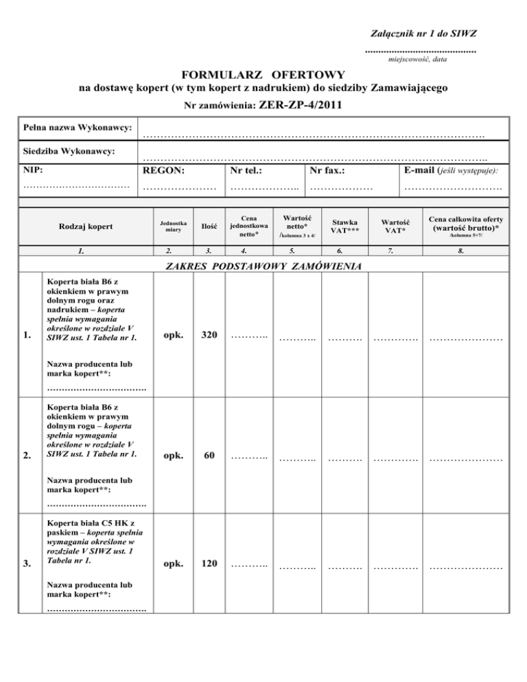 Załącznik nr 1 do SIWZ .......................................... miejscowość, data FORMULARZ OFERTOWY na dostawę kopert (w tym kopert z nadrukiem) do siedziby Zamawiającego Nr zamówienia: ZER-ZP-4/2011 Pełna nazwa Wykonawcy: Siedziba Wykonawcy: ……………………………………………………………………………………. NIP: …………………………………………………………………………………….. E-mail (jeśli występuje): REGON: Nr tel.: Nr fax.: …………………………… ………………… Rodzaj kopert 1. Jednostka miary 2. Ilość 3. ……………….. Cena jednostkowa netto* 4. ……………… Wartość netto* /kolumna 3 x 4/ 5. Stawka VAT*** 6. ………………………. Wartość VAT* 7. Cena całkowita oferty (wartość brutto)* /kolumna 5+7/ 8. ZAKRES PODSTAWOWY ZAMÓWIENIA 1. Koperta biała B6 z okienkiem w prawym dolnym rogu oraz nadrukiem – koperta spełnia wymagania określone w rozdziale V SIWZ ust. 1 Tabela nr 1. opk. 320 ……….. ……….. ………. …………. ………………… opk. 60 ……….. ……….. ………. …………. ………………… opk. 120 ……….. ……….. ………. …………. ………………… Nazwa producenta lub marka kopert**: ……………………………. 2. Koperta biała B6 z okienkiem w prawym dolnym rogu – koperta spełnia wymagania określone w rozdziale V SIWZ ust. 1 Tabela nr 1. Nazwa producenta lub marka kopert**: ……………………………. 3. Koperta biała C5 HK z paskiem – koperta spełnia wymagania określone w rozdziale V SIWZ ust. 1 Tabela nr 1. Nazwa producenta lub marka kopert**: ……………………………. 4. Koperta biała C6 SK bez okienka – koperta spełnia wymagania określone w rozdziale V SIWZ ust. 1 Tabela nr 1. opk. 40 ……….. ……….. ………. …………. ………………… Nazwa producenta lub marka kopert**: ……………………………. 5. Koperta biała C6 SK z okienkiem w prawym dolnym rogu - koperta spełnia wymagania określone w rozdziale V SIWZ ust. 1 Tabela nr 1. opk. 22 ……….. ……….. ………. …………. ………………… opk. 160 ……….. ……….. ………. …………. ………………… opk. 25 ……….. ……….. ………. …………. ………………… opk. 10 ……….. ……….. ………. …………. ………………… Nazwa producenta lub marka kopert**: ……………………………. 6. Koperta biała DL SK 110mm x 220mm SK z okienkiem w dolnym prawym rogu – koperta spełnia wymagania określone w rozdziale V SIWZ ust. 1 Tabela nr 1. Nazwa producenta lub marka kopert**: ……………………………. 7. Koperta biała DL SK 110mm x 220mm SK z okienkiem w dolnym prawym rogu oraz nadrukiem – koperta spełnia wymagania określone w rozdziale V SIWZ ust. 1 Tabela nr 1. Nazwa producenta lub marka kopert**: ……………………………. 8. Koperta biała DL SK 110mm x 220mm bez okienka – koperta spełnia wymagania określone w rozdziale V SIWZ ust. 1 Tabela nr 1. Nazwa producenta lub marka kopert**: ……………………………. 2/7 9. Koperta biała C4 HK z paskiem – koperta spełnia wymagania określone w rozdziale V SIWZ ust. 1 Tabela nr 1. opk. 36 ……….. ……….. ………. …………. ………………… opk. 5 ……….. ……….. ………. …………. ………………… opk. 30 ……….. ……….. ………. …………. ………………… szt. 1500 ……….. ……….. ………. …………. ………………… szt. 1000 ……….. ……….. ………. …………. ………………… Nazwa producenta lub marka kopert**: ……………………………. 10. Koperta biała LDS z paskiem – koperta spełnia wymagania określone w rozdziale V SIWZ ust. 1 Tabela nr 1. Nazwa producenta lub marka kopert**: ……………………………. 11. Koperta B4 HK rozszerzana brązowa z paskiem – koperta spełnia wymagania określone w rozdziale V SIWZ ust. 1 Tabela nr 1. Nazwa producenta lub marka kopert**: 12. ……………………………. Koperta listowa do płyt CD z okienkiem – koperta spełnia wymagania określone w rozdziale V SIWZ ust. 1 Tabela nr 1. Nazwa producenta lub marka kopert**: 13. ……………………………. Koperta powietrzna do płyt CD - koperta spełnia wymagania określone w rozdziale V SIWZ ust. 1 Tabela nr 1. Nazwa producenta lub marka kopert**: ……………………………. 3/7 14. Koperta biała B6 z okienkiem w prawym dolnym rogu - koperta spełnia wymagania określone w rozdziale V SIWZ ust. 1 Tabela nr 1. ZAKRES WARUNKOWY ZAMÓWIENIA opk. 50 ……….. ……….. ………. …………. ………………… opk. 50 ……….. ……….. ………. …………. ………………… opk. 20 ……….. ……….. ………. …………. ………………… opk. 10 ……….. ……….. ………. …………. ………………… opk. 60 ……….. ……….. ………. …………. ………………… Nazwa producenta lub marka kopert**: ……………………………. 15. Koperta biała C5 HK z paskiem – koperta spełnia wymagania określone w rozdziale V SIWZ ust. 1 Tabela nr 1. Nazwa producenta lub marka kopert**: ……………………………. 16. Koperta biała C6 SK bez okienka – koperta spełnia wymagania określone w rozdziale V SIWZ ust. 1 Tabela nr 1. Nazwa producenta lub marka kopert**: ……………………………. 17. Koperta biała C6 SK z okienkiem w prawym dolnym rogu - koperta spełnia wymagania określone w rozdziale V SIWZ ust. 1 Tabela nr 1. Nazwa producenta lub marka kopert**: ……………………………. 18. Koperta biała DL SK 110mm x 220mm SK z okienkiem w dolnym prawym rogu, bez nadruku – koperta spełnia wymagania określone w rozdziale V SIWZ ust. 1 Tabela nr 1. Nazwa producenta lub marka kopert**: ……………………