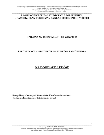 5 Wojskowy Szpital Kliniczny z Polikliniką – Samodzielny Publiczny Zakład Opieki Zdrowotnej w Krakowie Sekcja Zamówień Publicznych (budynek nr 45) Tel. (012) 630 80 57, (012) 630 80 58, tel/fax (012) 630 80 59 Godziny urzędowania: pn. – pt.: 7:30 – 15:05 ------------------------------------------------------------------------------------------------------------------------------------------------------- 5 WOJSKOWY SZPITAL KLINICZNY Z POLIKLINIKĄ – SAMODZIELNY PUBLICZNY ZAKŁAD OPIEKI ZDROWOTNEJ SPRAWA Nr 25/5WSzKzP – SP ZOZ/2006 SPECYFIKACJA ISTOTNYCH WARUNKÓW ZAMÓWIENIA NA DOSTAWY LEKÓW Specyfikacja Istotnych Warunków Zamówienia zawiera: 46 stron (słownie: czterdzieści sześć stron) 1 ------------------------------------------------------------------------------------------------------------------------------------------------------Nr sprawy 25/5WSzKzP SP–ZOZ/2006 Przetarg nieograniczony powyżej kwoty wartości zamówienia określonej w przepisach wydanych na podstawie art. 11 ust. 8 ustawy Prawo Zamówień Publicznych 5 Wojskowy Szpital Kliniczny z Polikliniką – Samodzielny Publiczny Zakład Opieki Zdrowotnej w Krakowie Sekcja Zamówień Publicznych (budynek nr 45) Tel. (012) 630 80 57, (012) 630 80 58, tel/fax (012) 630 80 59 Godziny urzędowania: pn. – pt.: 7:30 – 15:05 ------------------------------------------------------------------------------------------------------------------------------------------------------- SPECYFIKACJA ISTOTNYCH WARUNKÓW ZAMÓWIENIA 1. ZAMAWIAJĄCY: 5 Wojskowy Szpital Kliniczny z Polikliniką – Samodzielny Publiczny Zakład Opieki Zdrowotnej 30 – 901 Kraków, ul. Wrocławska 1–3, tel.: (0-12) 630-80-57, fax: (0-12) 630-80-59, REGON: 351506868, NIP: 677-20-81-964. Godziny urzędowania: pn. – pt: 7:30 – 15:05 2. TRYB POSTĘPOWANIA: 5 WSzKzP – SP ZOZ zaprasza do udziału w postępowaniu o udzielenie zamówienia publicznego prowadzonego w trybie PRZETARGU NIEOGRANICZONEGO POWYŻEJ 137 000 EURO. 3. PRZEDMIOT ZAMÓWIENIA: Przedmiotem postępowania są DOSTAWY LEKÓW; zgodnie z ZAŁĄCZNIKIEM NR 1 do SIWZ – FORMULARZ CENOWY OPIS PRZEDMIOTU ZAMÓWIENIA. Kod CPV: 24492200-0, 24400000-0, 24421100-0, 24451100-0, 24452100-0 4. OPIS ODPOWIEDNICH CZĘŚCI ZAMÓWIENIA PRZY DOPUSZCZENIU SKŁADANIA OFERT CZĘŚCIOWYCH. Zamawiający dopuszcza składanie ofert częściowych, według pakietów: - Pakiet nr 1 – Leki psychotropowe I - Pakiet nr 2 – Leki psychotropowe II - Pakiet nr 3 – Leki psychotropowe III - Pakiet nr 4 – Leki narkotyczne I - Pakiet nr 5 – Leki narkotyczne II - Pakiet nr 6 – Antybiotyki I - Pakiet nr 7 – Antybiotyki II - Pakiet nr 8 – Antybiotyki III - Pakiet nr 9 – Antybiotyki IV - Pakiet nr 10 – Antybiotyki V - Pakiet nr 11 – Antybiotyki VI - Pakiet nr 12 – Insuliny - Pakiet nr 13 – Lek anestezjologiczny - Pakiet nr 14 – Leki onkologiczne I - Pakiet nr 15 – Leki onkologiczne II - Pakiet nr 16 – Leki onkologiczne III - Pakiet nr 17 – Leki onkologiczne IV - Pakiet nr 18 – Środki kontrastowe I – Niejonowy radiologiczny środek kontrastujący 200mgJ – 240 mgJ - Pakiet nr 19 – Środki kontrastowe II – Niejonowy radiologiczny środek kontrastujący iohexol 647mg/ml - Pakiet nr 20 – Środki kontrastowe III – Niejonowy radiologiczny środek kontrastujący o stężeniu jowersolu 636 mg/ml - Pakiet nr 21 – Środki kontrastowe IV – Niejonowy radiologiczny środek kontrastujący o stężeniu iopromidum 623 mg/ml - Pakiet nr 22 – Lek na ratunek - Pakiet nr 23 – Leki recepturowe I - Pakiet nr 24 – Leki recepturowe II - Pakiet nr 25 – Heparyny drobnocząsteczkowe I - Pakiet nr 26 – Heparyny drobnocząsteczkowe II - Pakiet nr 27 – Heparyna - Pakiet nr 28 – Leki różne I - Pakiet nr 29 – Leki różne II - Pakiet nr 30 – Leki różne III - Pakiet nr 31 – Leki różne IV - Pakiet nr 32 – Leki różne V - Pakiet nr 33 – Leki różne VI - Pakiet nr 34 – Leki różne VII - Pakiet nr 35 – Leki różne VIII - Pakiet nr 36 – Leki różne IX - Pakiet nr 37 – Leki różne X - Pakiet nr 38 – Leki różne XI - Pakiet nr 39 – Leki różne XII 2 ------------------------------------------------------------------------------------------------------------------------------------------------------Nr sprawy 25/5WSzKzP SP–ZOZ/2006 Przetarg nieograniczony powyżej kwoty wartości zamówienia określonej w przepisach wydanych na podstawie art. 11 ust. 8 ustawy Prawo Zamówień Publicznych 5 Wojskowy Szpital Kliniczny z Polikliniką – Samodzielny Publiczny Zakład Opieki Zdrowotnej w Krakowie Sekcja Zamówień Publicznych (budynek nr 45) Tel. (012) 630 80 57, (012) 630 80 58, tel/fax (012) 630 80 59 Godziny urzędowania: pn. – pt.: 7:30 – 15:05 ------------------------------------------------------------------------------------------------------------------------------------------------------- Pakiet nr 40 – Leki różne XIII - Pakiet nr 41 – Leki różne XIV - Pakiet nr 42 – Leki zewnętrzne - Pakiet nr 43 – Płyny infuzyjne I - Pakiet nr 44 – Płyny infuzyjne II - Pakiet nr 45 – Płyny infuzyjne III - Pakiet nr 46 – Płyny infuzyjne IV - Pakiet nr 47 – Płyny infuzyjne V - Pakiet nr 48 – Płyny infuzyjne VI - Pakiet nr 49 – Płyny infuzyjne VII - Pakiet nr 50 – Płyny infuzyjne VIII - Pakiet nr 51 – Płyny infuzyjne IX - Pakiet nr 52 – Płyny infuzyjne X - Pakiet nr 53 – Paski do glucometrów - Pakiet nr 54 – Lek przeciwbólowy - Pakiet nr 55 – Żywienie dojelitowe I - Pakiet nr 56 – Żywienie dojelitowe II - Pakiet nr 57 – Żywienie pozajelitowe I - Pakiet nr 58 – Żywienie pozajelitowe II - Pakiet nr 59 – Środek przeczyszczający - Pakiet nr 60 – Antybiotyki VII - Pakiet nr 61 – Antybiotyki VIII 5. ZAMÓWIENIE Z PRAWEM OPCJI. Zamawiający, zgodnie z art. 34 ust. 5 ustawy – Prawo Zamówień Publicznych (Dz. U. nr 19, poz. 177, z dnia 09 lutego 2004 roku, z późn. zm.), określił maksymalną ilość 