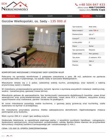 +48504647433 Ofertanumer466/710/OMS OpiekunofertyEmilaCupa Mieszkania Domy Działki Lokale Sprzedaż Wynajem GorzówWielkopolski,os.Sady-135000zł Typbudynku Niskiblok Ratakredytu* tylko725zł Powierzchnia 38m2 Cena/m2 3553zł Liczbapokoi 2 Piętro Parter Typogrzewania Miejskie Ciepławoda Piecgazowy Typokien Zroletami,PCV Czynsz 260zł Piwnica Tak KOMFORTOWEMIESZKANIE2POKOJOWESADYGORZÓWWLKP. Polecamy na sprzedaż komfortowe 2 pokojowe mieszkanie o pow. 38 m2, położone na parterze ocieplonegobloku4piętrowego,naosiedluSadywGorzowieWielkopolskim. Mieszkanie składa się z 2 pokoi, oddzielnej widnej kuchni, przedpokoju oraz łazienki z kabiną prysznicowąrazemztoaletą. Wmieszkaniuprzeprowadzonogeneralnyremont,łączniezwymianąwszystkichinstalacji:elektrycznej, wodno-kanalizacyjnej,gazowej(nowaterma). Mieszkanie gotowe do wprowadzenia, bez konieczności ponoszenia dodatkowych kosztów: nowe drzwi wewnętrzne oraz przeciwwłamaniowe drzwi wejściowe, nowe okna PCV z roletami, wszystkie ściany szpachlowaneorazmalowane,paneleiterakotanapodłogach. W cenie mieszkania pozostają meble kuchenne, z gazową płytą grzewczą oraz kuchenką, szafa wykonananawymiarwprzedpokoju. Do mieszkania przynależy piwnica. Klatka zabezpieczona domofonem. Ogólnodostępne miejsca parkingoweprzybudynku. Niskiczynsz260zł+prądigazwedługzużycia. Doskonała lokalizacja, w sąsiedztwie pięknego parku, z wszelkimi punktami handlowo- -usługowymi, dyskontamispożywczymi,przychodniami,przedszkolem,szkołą.Bardzobliskorównieżdoprzystanków komunikacjimiejskiejzarównotramwajowegojakiautobusowego(1min.). CENA:135.000ZŁOFERTAZAREZERWOWANA ul.MieszkaI-go2/3,66-400GorzówWlkp.,telefon:+48504647443,e-mail:[email protected]