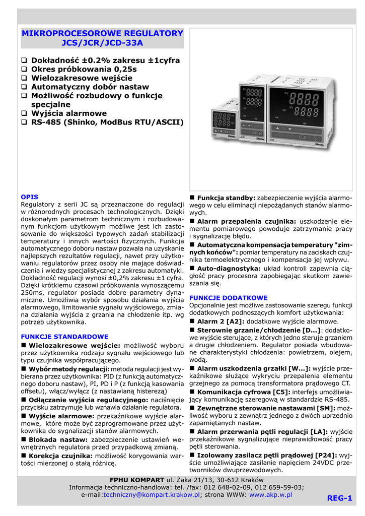 MIKROPROCESOROWE REGULATORY JCS/JCR/JCD-33A Dokładność ±0.2% zakresu ±1cyfra Okres próbkowania 0,25s Wielozakresowe wejście Automatyczny dobór nastaw Możliwość rozbudowy o funkcje specjalne q Wyjścia alarmowe q RS-485 (Shinko, ModBus RTU/ASCII) q q q q q OPIS Regulatory z serii JC są przeznaczone do regulacji w różnorodnych procesach technologicznych. Dzięki doskonałym parametrom technicznym i rozbudowanym funkcjom użytkowym możliwe jest ich zastosowanie do większości typowych zadań stabilizacji temperatury i innych wartości fizycznych. Funkcja automatycznego doboru nastaw pozwala na uzyskanie najlepszych rezultatów regulacji, nawet przy użytkowaniu regulatorów przez osoby nie mające doświadczenia i wiedzy specjalistycznej z zakresu automatyki. Dokładność regulacji wynosi ±0,2% zakresu ±1 cyfra. Dzięki krótkiemu czasowi próbkowania wynoszącemu 250ms, regulator posiada dobre parametry dynamiczne. Umożliwia wybór sposobu działania wyjścia alarmowego, limitowanie sygnału wyjściowego, zmiana działania wyjścia z grzania na chłodzenie itp. wg potrzeb użytkownika. FUNKCJE STANDARDOWE n Wielozakresowe wejście: możliwość wyboru przez użytkownika rodzaju sygnału wejściowego lub typu czujnika współpracującego. n Wybór metody regulacji: metoda regulacji jest wybierana przez użytkownika: PID (z funkcją automatycznego doboru nastaw), PI, PD i P (z funkcją kasowania offsetu), włącz/wyłącz (z nastawianą histerezą) n Odłączanie wyjścia regulacyjnego: naciśnięcie przycisku zatrzymuje lub wznawia działanie regulatora. n Wyjście alarmowe: przekaźnikowe wyjście alarmowe, które może być zaprogramowane przez użytkownika do sygnalizacji stanów alarmowych. n Blokada nastaw: zabezpieczenie ustawień wewnętrznych regulatora przed przypadkową zmianą. n Korekcja czujnika: możliwość korygowania wartości mierzonej o stałą różnicę. n Funkcja standby: zabezpieczenie wyjścia alarmo- wego w celu eliminacji niepożądanych stanów alarmowych. n Alarm przepalenia czujnika: uszkodzenie elementu pomiarowego powoduje zatrzymanie pracy i sygnalizację błędu. n Automatyczna kompensacja temperatury "zimnych końców": pomiar temperatury na zaciskach czujnika termoelektrycznego i kompensacja jej wpływu. n Auto-diagnostyka: układ kontroli zapewnia ciągłość pracy procesora zapobiegając skutkom zawieszania się. FUNKCJE DODATKOWE Opcjonalnie jest możliwe zastosowanie szeregu funkcji dodatkowych podnoszących komfort użytkowania: n Alarm 2 [A2]: dodatkowe wyjście alarmowe. n Sterownie grzanie/chłodzenie [D...]: dodatkowe wyjście sterujące, z których jedno steruje grzaniem a drugie chłodzeniem. Regulator posiada wbudowane charakterystyki chłodzenia: powietrzem, olejem, wodą. n Alarm uszkodzenia grzałki [W...]: wyjście przekaźnikowe służące wykryciu przepalenia elementu grzejnego za pomocą transformatora prądowego CT. n Komunikacja cyfrowa [C5]: interfejs umożliwiający komunikację szeregową w standardzie RS-485. n Zewnętrzne sterowanie nastawami [SM]: możliwość wyboru z zewnątrz jednego z dwóch uprzednio zapamiętanych nastaw. n Alarm przerwania pętli regulacji [LA]: wyjście przekaźnikowe sygnalizujące nieprawidłowość pracy pętli sterowania. n Izolowany zasilacz pętli prądowej [P24]: wyjście umożliwiające zasilanie napięciem 24VDC przetworników dwuprzewodowych. FPHU KOMPART ul. Żaka 21/13, 30-612 Kraków Informacja techniczno-handlowa: tel. /fax: 012 648-02-09, 012 659-59-03; e-mail:[email protected]; strona WWW: www.akp.w.pl REG-1 n Czarny kolor obudowy [BK]: czarny kolor obu- Metoda regulacji - PID z funkcją automatycznego doboru nastaw - PD, PI, P z funkcja kasowania offsetu - ON/OFF (włącz/wyłącz - dwustawna) Strefa proporcjonalności (P): termopary: 0...1000°C (ON/OFF P=0), RTD: 0,0...999,9°C (ON/OFF P=0,0), prądowe lub napięciowe: 0,0...100,0% Czas zdwojenia (I): 0...1000s Czas wyprzedzenia (D): 0...300s Cykl proporcjonalności: 1...120s ARW: 0...100% Histereza (regulacja ON/OFF): termopary i RTD: 0.1...100,0°C, prądowe i napięciowe: 1...1000 (z ustawionym punktem dziesiętnym) Zasilanie Do wyboru przy zamawianiu: 100...240VAC 50/60Hz (zakres zmian 85...264VAC) lub 24VAC/DC (zakres zmian 20...28VAC/DC) Pobór mocy Ok. 8VA Izolacja, wytrzymałość elektryczna Rezystancja izolacji: min 10MΩ przy 500VDC (oprócz zacisków nieizolowanych) Wytrzymałość elektryczna: 1,5kV przez 1 min. pomiędzy parami zacisków: wejście -uziemienie, wejście - zasilanie, wyjście - uziemienie, wyjście - zasilanie i zasilanie - uziemienie Parametry środowiska Temperatura otoczenia: 0...50°C Wilgotność: 35...85% bez kondensacji Stopień ochrony IP66 Masa JCS ok. 200g, JCR ok. 250g, JCD ok. 370g Materiał obudowy Poliwęglan dowy (standardowo kolor szary). n Pokrywa zacisków podłączeniowych [TC]: pokrywa osłaniająca zaciski przyłączeniowe, dzięki której zwiększa się stopień bezpieczeństwa montażu elektrycznego. ZAKRESY POMIAROWE Typ czujnika lub sygnału wejściowego Zakres pomiarowy [°C] Rozdzielczość [°C] -200...1370 1 -199,9...400,0 0,1 K J -200...1000 R 0...1760 S 0...1760 B 0...1820 E 0...800 T -199,9...400,0 N -200...1300 C 0...2315 PL-II 0...1390 Pt100 JPt100 1 0,1 1 -199,9...850,0 0,1 -200...850 1 -199,9...500,0 0,1 -200...500 1 4...20mA** 0...20mA** 0...1V -1999...9999* 0...10V 1/0,1/0,01/0,001 1...5V 0...5V *) zakres dowolnie skalowany w podanym zakresie **) dla sygnałów prądowych wymagane jest opornik bocznikujący R=50Ω DANE TECHNICZNE Funkcje standardowe Wyświetlanie Wejścia Wartość mierzona (PV): 4 czerwone cyfry 18x8mm (JCD), 11,2x5,4mm (JCR), 10,2x4,9 (JCS) Wartość nastawy (SV): 4 zielone cyfry 12,6x6,6mm (JCD), 11,2x5,4mm (JCR), 8,8x4,9 (JCS) Termopary: max. rezyst. wew. 100Ω RTD: linia 3 przewodowa, max. rezyst. linii 10Ω na przewód Prądowe: 0(4)...20mA - imp. wej. 50Ω (wymagany opornik bocznikujący R=50Ω) Napięciowe: 0...1V - imp. wej.