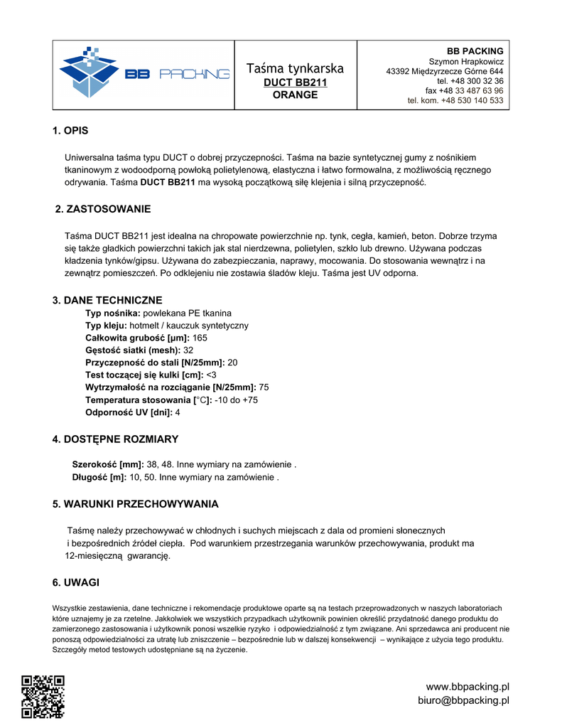 BB PACKING Taśma tynkarska DUCT BB211 ORANGE Szymon Hrapkowicz 43392 Międzyrzecze Górne 644 tel. +48 300 32 36 fax +48 33 487 63 96 tel. kom. +48 530 140 533 1. OPIS Uniwersalna taśma typu DUCT o dobrej przyczepności. Taśma na bazie syntetycznej gumy z nośnikiem tkaninowym z wodoodporną powłoką polietylenową, elastyczna i łatwo formowalna, z możliwością ręcznego odrywania. Taśma DUCT BB211 ma wysoką początkową siłę klejenia i silną przyczepność. 2. ZASTOSOWANIE Taśma DUCT BB211 jest idealna na chropowate powierzchnie np. tynk, cegła, kamień, beton. Dobrze trzyma się także gładkich powierzchni takich jak stal nierdzewna, polietylen, szkło lub drewno. Używana podczas kładzenia tynków/gipsu. Używana do zabezpieczania, naprawy, mocowania. Do stosowania wewnątrz i na zewnątrz pomieszczeń. Po odklejeniu nie zostawia śladów kleju. Taśma jest UV odporna. 3. DANE TECHNICZNE Typ nośnika: powlekana PE tkanina Typ kleju: hotmelt / kauczuk syntetyczny Całkowita grubość [μm]: 165 Gęstość siatki (mesh): 32 Przyczepność do stali [N/25mm]: 20 Test toczącej się kulki [cm]: <3 Wytrzymałość na rozciąganie [N/25mm]: 75 Temperatura stosowania [°C]: 10 do +75 Odporność UV [dni]: 4 4. DOSTĘPNE ROZMIARY Szerokość [mm]: 38, 48. Inne wymiary na zamówienie . Długość [m]: 10, 50. Inne wymiary na zamówienie . 5. WARUNKI PRZECHOWYWANIA Taśmę należy przechowywać w chłodnych i suchych miejscach z dala od promieni słonecznych i bezpośrednich źródeł ciepła. Pod warunkiem przestrzegania warunków przechowywania, produkt ma 12miesięczną gwarancję. 6. UWAGI Wszystkie zestawienia, dane techniczne i rekomendacje produktowe oparte są na testach przeprowadzonych w naszych laboratoriach które uznajemy je za rzetelne. Jakkolwiek we wszystkich przypadkach użytkownik powinien określić przydatność danego produktu do zamierzonego zastosowania i użytkownik ponosi wszelkie ryzyko i odpowiedzialność z tym związane. Ani sprzedawca ani producent nie ponoszą odpowiedzialności za utratę lub zniszczenie – bezpośrednie lub w dalszej konsekwencji – wynikające z użycia tego produktu. Szczegóły metod testowych udostępniane są na życzenie. www.bbpacking.pl [email protected]