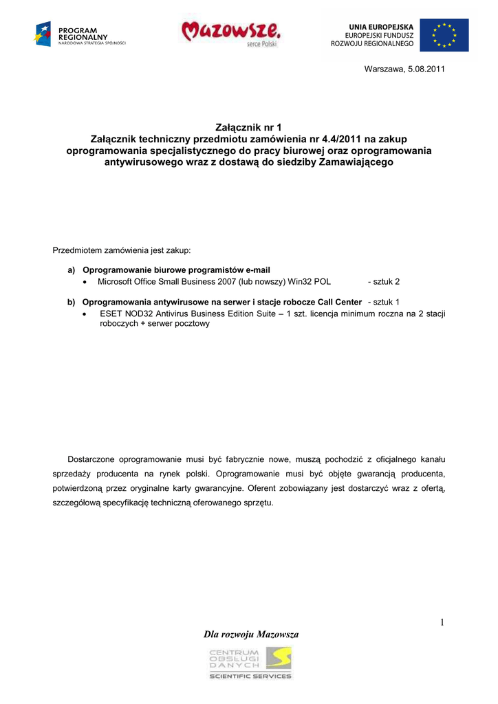 Warszawa, 5.08.2011 Załącznik nr 1 Załącznik techniczny przedmiotu zamówienia nr 4.4/2011 na zakup oprogramowania specjalistycznego do pracy biurowej oraz oprogramowania antywirusowego wraz z dostawą do siedziby Zamawiającego Przedmiotem zamówienia jest zakup: a) Oprogramowanie biurowe programistów e-mail Microsoft Office Small Business 2007 (lub nowszy) Win32 POL - sztuk 2 b) Oprogramowania antywirusowe na serwer i stacje robocze Call Center - sztuk 1 ESET NOD32 Antivirus Business Edition Suite – 1 szt. licencja minimum roczna na 2 stacji roboczych + serwer pocztowy Dostarczone oprogramowanie musi być fabrycznie nowe, muszą pochodzić z oficjalnego kanału sprzedaży producenta na rynek polski. Oprogramowanie musi być objęte gwarancją producenta, potwierdzoną przez oryginalne karty gwarancyjne. Oferent zobowiązany jest dostarczyć wraz z ofertą, szczegółową specyfikację techniczną oferowanego sprzętu. 1 Dla rozwoju Mazowsza