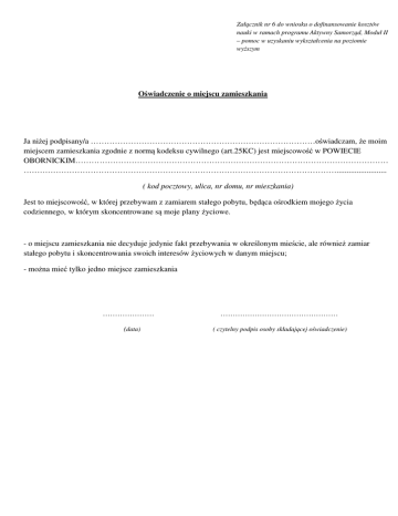 Załącznik nr 6 do wniosku o dofinansowanie kosztów nauki w ramach programu Aktywny Samorząd, Moduł II – pomoc w uzyskaniu wykształcenia na poziomie wyższym Oświadczenie o miejscu zamieszkania Ja niżej podpisany/a …………………………………………………………………………oświadczam, że moim miejscem zamieszkania zgodnie z normą kodeksu cywilnego (art.25KC) jest miejscowość w POWIECIE OBORNICKIM……………………………………………………………………………………………………… ………………………………………………………………………………………………………......................... ( kod pocztowy, ulica, nr domu, nr mieszkania) Jest to miejscowość, w której przebywam z zamiarem stałego pobytu, będąca ośrodkiem mojego życia codziennego, w którym skoncentrowane są moje plany życiowe. - o miejscu zamieszkania nie decyduje jedynie fakt przebywania w określonym mieście, ale również zamiar stałego pobytu i skoncentrowania swoich interesów życiowych w danym miejscu; - można mieć tylko jedno miejsce zamieszkania ………………… (data) ………………………………………… ( czytelny podpis osoby składającej oświadczenie)