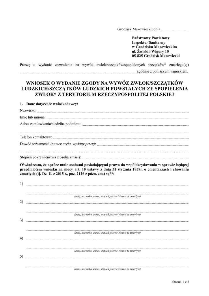 Grodzisk Mazowiecki, dnia Państwowy Powiatowy Inspektor Sanitarny w Grodzisku Mazowieckim ul. Żwirki i Wigury 10 05-825 Grodzisk Mazowiecki Proszę o wydanie zezwolenia na wywóz zwłok/szczątków/spopielonych szczątków* zmarłego(ej) zgodnie z poniższym wnioskiem. WNIOSEK O WYDANIE ZGODY NA WYWÓZ ZWŁOK/SZCZĄTKÓW LUDZKICH/SZCZĄTKÓW LUDZKICH POWSTAŁYCH ZE SPOPIELENIA ZWŁOK* Z TERYTORIUM RZECZYPOSPOLITEJ POLSKIEJ 1. Dane dotyczące wnioskodawcy: Nazwisko: Imię lub imiona: Adres zamieszkania/siedziba podmiotu: Telefon kontaktowy: Dowód tożsamości (numer, seria, wydany przez): Stopień pokrewieństwa z osobą zmarłą: Oświadczam, że oprócz mnie osobami posiadającymi prawo do współdecydowania w sprawie będącej przedmiotem wniosku na mocy art. 10 ustawy z dnia 31 stycznia 1959r. o cmentarzach i chowaniu zmarłych (tj. Dz. U. z 2015 r., poz. 2126 z późn. zm.) są**: 1) (imię, nazwisko, adres, stopień pokrewieństwa ze zmarłym) 2) (imię, nazwisko, adres, stopień pokrewieństwa ze zmarłym) 3) (imię, nazwisko, adres, stopień pokrewieństwa ze zmarłym) 4) (imię, nazwisko, adres, stopień pokrewieństwa ze zmarłym) 5) (imię, nazwisko, adres, stopień pokrewieństwa ze zmarłym) Strona 1 z 3 Wszystkie powyższe osoby nie sprzeciwiają się dokonaniu wywozu zwłok/szczątków ludzkich/szczątków ludzkich powstałych ze spopielenia zwłok* z terytorium Rzeczypospolitej Polskiej (imię i nazwisko osoby zmarłej) Należy dołączyć do wniosku czytelnie podpisane imieniem i nazwiskiem oświadczenia osób posiadających prawo do współdecydowania w sprawie 2. Dane dotyczące osoby zmarłej: Nazwisko: Imię lub imiona: Nazwisko rodowe: Data i miejsce urodzenia: Ostatnie miejsce zamieszkania: Data i miejsce zgonu: Oświadczam, że zgon nastąpił/nie nastąpił* z powodu choroby zakaźnej*** wymienionej w rozporządzeniu Ministra Zdrowia z dnia 6 grudnia 2001 r. w sprawie wykazu chorób zakaźnych, w przypadku których stwierdzenie zgonu wymaga szczególnego postępowania ze zwłokami osób zmarłych na te choroby (Dz. U. z 2001r. Nr 152, poz. 1742). 3. Miejsce, z którego zwłoki/szczątki ludzkie/szczątki ludzkie powstałe ze spopielenia zwłok* zostaną przewiezione (kraj, miejscowość, nazwa i adres): 4. Miejsce przyszłego pochówku zwłok/szczątków ludzkich/szczątków ludzkich powstałych ze spopielenia zwłok* (kraj, miejscowość, nazwa i adres): 5. Środek transportu, którym zostaną przewiezione zwłoki/szczątki/szczątki ludzkie powstałe ze spopielenia zwłok* (rodzaj): Oświadczam, że treść wniosku odpowiada stanowi faktycznemu i prawnemu oraz nieznane mi są okoliczności mogące stać w sprzeczności z pozytywnym rozstrzygnięciem wniosku i świadomy odpowiedzialności karnej z art. 233 Kodeksu Karnego z dnia 5 lipca 2016 r. (tj. Dz. U. z 2016 r., poz. 1137) biorę pełną odpowiedzialność prawną za podane we wniosku dane. data i czytelny podpis wnioskodawcy (pieczątka podmiotu) data przyjęcia wniosku podpis pracownika potwierdzającego tożsamość wnioskodawcy Strona 2 z 3 Art. 233 § 1. Kto, składając zeznanie mające służyć za dowód w postępowaniu sądowym lub w innym postępowaniu prowadzonym na podstawie ustawy, zeznaje nieprawdę lub zataja prawdę, podlega karze pozbawienia wolności od 6 miesięcy do lat 8. § 1a. Jeżeli sprawca czynu określonego w § 1 zeznaje nieprawdę lub zataja prawdę z obawy przed odpowiedzialnością karną grożącą jemu samemu lub jego najbliższym, podlega karze pozbawienia wolności od 3 miesięcy do lat 5. § 2. Warunkiem odpowiedzialności jest, aby przyjmujący zeznanie, działając w zakresie swoich uprawnień, uprzedził zeznającego o odpowiedzialności karnej za fałszywe zeznanie lub odebrał od niego przyrzeczenie. § 3. Nie podlega karze za czyn określony w § 1a, kto składa fałszywe zeznanie, nie wiedząc o prawie odmowy zeznania lub odpowiedzi na pytania. (…) § 6. Przepisy § 1-3 oraz 5 stosuje się odpowiednio do osoby, która składa fałszywe oświadczenie, jeżeli przepis ustawy przewiduje możliwość odebrania oświadczenia pod rygorem odpowiedzialności karnej. * niepotrzebne skreślić ** osobami posiadającymi prawo do współdecydowania są m.in. zmarłego: małżonek, rodzice, dziadkowie, pradziadkowie, rodzeństwo, dzieci rodzeństwa, wnuki, prawnuki, teściowie *** cholera, dur wysypkowy i inne riketsjozy, dżuma, gorączka powrotna, nagminne porażenie dziecięce, nosacizna, trąd, wąglik, wścieklizna, żółta gorączka i inne wirusowe gorączki krwotoczne INFORMACJA! 1. Do wniosku należy dołączyć załączniki: akt zgonu – oryginał lub potwierdzoną notarialnie lub urzędowo za zgodność z oryginałem kserokopię, • akt urodzenia wnioskodawcy – oryginał lub potwierdzoną notarialnie lub urzędowo za zgodność z oryginałem kserokopię, • dokument urzędowy stwierdzający wykluczenie jako przyczyny zgonu choroby zakaźnej (w przypadku nieokreślenia przyczyny zgonu w akcie zgonu lub innym dokumencie urzędowym stwierdzającym zgon), • wymagane dokumenty właściwej władzy państwa, na którego terytorium zwłoki/szczątki ludzkie/szczątki ludzkie powstałe ze spopielenia zwłok mają być pochowane, • wymagane dokumenty właściwej władzy państwa, przez którego terytorium zwłoki/szczątki ludzkie/szczątki ludzkie powstałe ze spopielenia zwłok mają być przewożone, • oświadczenia osób posiadających prawo decydowania w sprawie przewozu zwłok/szczątków ludzkich/ szczątków ludzkich powstałych ze spopielenia zwłok, • oraz ewentualnie inne akty stanu cywilnego potwierdzające pokrewieństwo lub powinowactwo wnioskodawcy ze zmarłym. • Strona 3 z 3