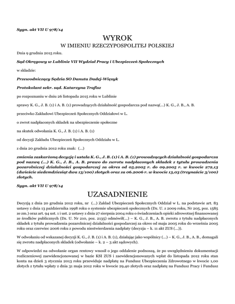 Sygn. akt VII U 978/14 WYROK W IMIENIU RZECZYPOSPOLITEJ POLSKIEJ Dnia 9 grudnia 2015 roku. Sąd Okręgowy w Lublinie VII Wydział Pracy i Ubezpieczeń Społecznych w składzie: Przewodniczący Sędzia SO Danuta Dadej-Więsyk Protokolant sekr. sąd. Katarzyna Trafisz po rozpoznaniu w dniu 26 listopada 2015 roku w Lublinie sprawy K. G., J. B. (1) i A. B. (1) prowadzących działalność gospodarcza pod nazwą(...) K. G., J. B., A. B. przeciwko Zakładowi Ubezpieczeń Społecznych Oddziałowi w L. o zwrot nadpłaconych składek na ubezpieczenie społeczne na skutek odwołania K. G., J. B. (1) i A. B. (1) od decyzji Zakładu Ubezpieczeń Społecznych Oddziału w L. z dnia 20 grudnia 2012 roku znak: (...) zmienia zaskarżoną decyzję i ustala K. G., J. B. (1) i A. B. (1) prowadzących działalność gospodarcza pod nazwą (...) K. G., J. B., A. B. prawo do zwrotu nadpłaconych składek z tytułu prowadzenia pozarolniczej działalności gospodarczej za okres od 05.2005 r. do 09.2005 r. w kwocie 272,13 (dwieście siedemdziesiąt dwa 13/100) złotych oraz za 06.2006 r. w kwocie 13,03 (trzynaście 3/100) złotych. Sygn. akt VII U 978/14 UZASADNIENIE Decyzją z dnia 20 grudnia 2012 roku, nr (...) Zakład Ubezpieczeń Społecznych Oddział w L. na podstawie art. 83 ustawy z dnia 13 października 1998 roku o systemie ubezpieczeń społecznych (Dz. U. z 2009 roku, Nr 205, poz. 1585 ze zm.) oraz art. 94 ust. 1 i ust. 2 ustawy z dnia 27 sierpnia 2004 roku o świadczeniach opieki zdrowotnej finansowanej ze środków publicznych (Dz. U. Nr 210, poz. 2135) odmówił(...) – K. G., J. B., A. B. zwrotu z tytułu nadpłaconych składek z tytułu prowadzenia pozarolniczej działalności gospodarczej za okres od maja 2005 roku do września 2005 roku oraz czerwiec 2006 roku z powodu niestwierdzenia nadpłaty (decyzja – k. 11 akt ZUS (...)). W odwołaniu od wskazanej decyzji K. G., J. B. (1) i A. B. (1), działając jako wspólnicy (...) – K. G., J. B., A. B., domagali się zwrotu nadpłaconych składek (odwołanie – k. 2 – 3 akt sądowych). W odpowiedzi na odwołanie organ rentowy wnosił o jego oddalenie podnoszą, że po uwzględnieniu dokumentacji rozliczeniowej zaewidencjonowanej w bazie KSI ZUS i zaewidencjonowanych wpłat do listopada 2012 roku stan konta na dzień 3 stycznia 2013 roku przewiduje nadpłatę na Fundusz Ubezpieczenia Zdrowotnego w kwocie 1,00 złotych z tytułu wpłaty z dnia 31 maja 2012 roku w kwocie 29,40 złotych oraz nadpłatę na Fundusz Pracy i Fundusz Gwarantowanych Świadczeń Pracowniczych w kwocie 1,00 złotych z tytułu wypłaty z dnia 31 maja 2012 roku w kwocie 92,70 złotych (odpowiedź na odwołanie – k. 5 – 6v. a.s.). Wyrokiem z dnia 17 października 2013 roku Sąd Okręgowy w Lublinie VII Wydział Pracy i Ubezpieczeń Społecznych w sprawie o sygn. akt VII U 328/13 zmienił zaskarżoną decyzję i ustalił K. G., J. B. (1) i A. B. (1) prowadzącym pozarolniczą działalność gospodarczą pod nazwą „(...) – K. G., J. B., A. B.” prawo do zwrotu z tytułu nadpłaconych składek z tytułu prowadzenia pozarolniczej działalności gospodarczej za okres od maja 2015 roku do września 2005 roku i czerwiec 2006 roku w kwocie 5018,23 złotych (wyrok – k. 39 a.s.). Apelację od wskazanego wyroku wniósł organ rentowy, zaskarżając go w całości i wnoszą o zmianę rozstrzygnięcia i oddalenie odwołania ewentualnie o uchylenie wyroku i przekazanie sprawy sądowi pierwszej instancji do ponownego rozpoznania (apelacja – k. 49 – 52 a.s.). Wyrokiem z dnia 20 marca 2014 roku Sąd Apelacyjny w Lublinie III Wydział Pracy i Ubezpieczeń Społecznych w sprawie o sygn. akt III AUa 1570/13 uchylił zaskarżony wyrok i przekazał sprawę Sądowi Okręgowemu w Lublinie do ponownego rozpoznania. We wskazaniach co do dalszego postępowania Sąd Apelacyjny podniósł, że Sąd Okręgowy przy ponownym rozpoznaniu sprawy dopuści dowód z opinii biegłego z zakresu księgowości i rachunkowości, który powinien przeanalizować konto wnioskodawców w spornym okresie i ustalić wysokość należnych składek w tym okresie, czy składki te zostały zapłacone w terminie a następnie kiedy i w jakiej wysokości zostały zwrócone przez organ rentowy. Zdaniem Sądu Apelacyjnego wyjaśnienia wymagała również kwestia kiedy organ rentowy ponownie wezwał wnioskodawców do zapłaty składek, czy zostały opłacone te składki w terminie, bądź po terminie i czy Zakład naliczył od tych spornych składek odsetki oraz kiedy zostały uregulowane przez wnioskodawców wszystkie zaległości (wyrok i uzasadnienie – k. 73, 84 – 85 a.s.). Sąd Okręgowy ustalił, co następuje: K. G., J. B. (1) oraz A. B. (1) w wyniku aneksu do umowy z dnia 9 kwietnia 2004 roku kontynuują realizację postanowień umowy spółki cywilnej zawartej w 1985 roku w celu prowadzenia cegielni polowej pod nazwą (...) – K. G., J. B., A. B.. Wspólnicy A. B. (1) i K. G. początkowo podlegali ubezpieczeniom społecznym rolników i opłacali składki w związku z prowadzoną działalnością gospodarczą w Krasie Rolniczego Ubezpieczenia Społecznego. Decyzją Prezesa Kasy z dnia 30 września 2004 roku K. G. od dnia 1 października 2004 roku został wyłączony z ubezpieczenia społecznego rolników i w związku z tym od dnia 1 października 2004 roku został zgłoszony do ubezpieczenia społecznego w Zakładzie Ubezpieczeń Społecznych i od tej daty rozpoczęto opłacanie za niego składek na ubezpieczenia społeczne z tytułu prowadzonej działalności gospodarczej. Jednakże na skutek podjętych działań i zmiany stanu prawnego Prezes Kasy Decyzją z dnia 11 września 2006 roku uchylił decyzję z dnia 30 września 2004 roku i stwierdził prawo K. G. do podlegania ubezpieczeniu społecznemu rolników i obowiązek opłacania składek na ubezpieczenia społeczne dla prowadzącego działalność gospodarczą. A. B. (1) dokonała zapłaty należności z tytułu składek na ubezpieczenie społeczne za m