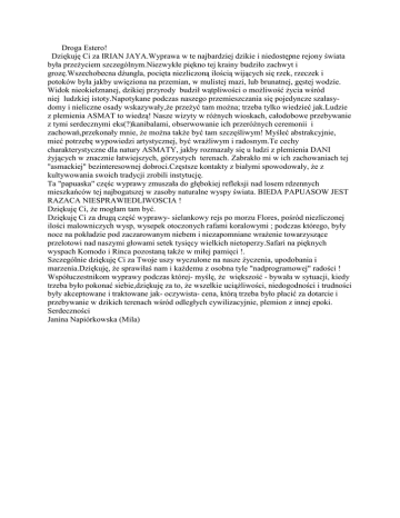 Droga Estero! Dziękuję Ci za IRIAN JAYA.Wyprawa w te najbardziej dzikie i niedostępne rejony świata była przeŜyciem szczególnym.Niezwykłe piękno tej krainy budziło zachwyt i grozę.Wszechobecna dŜungla, pocięta niezliczoną ilością wijących się rzek, rzeczek i potoków była jakby uwięziona na przemian, w mulistej mazi, lub brunatnej, gęstej wodzie. Widok nieokiełznanej, dzikiej przyrody budził wątpliwości o moŜliwość Ŝycia wśród niej ludzkiej istoty.Napotykane podczas naszego przemieszczania się pojedyncze szałasydomy i nieliczne osady wskazywały,Ŝe przeŜyć tam moŜna; trzeba tylko wiedzieć jak.Ludzie z plemienia ASMAT to wiedzą! Nasze wizyty w róŜnych wioskach, całodobowe przebywanie z tymi serdecznymi eks(?)kanibalami, obserwowanie ich przeróŜnych ceremonii i zachowań,przekonały mnie, Ŝe moŜna takŜe być tam szczęśliwym! Myśleć abstrakcyjnie, mieć potrzebę wypowiedzi artystycznej, być wraŜliwym i radosnym.Te cechy charakterystyczne dla natury ASMATY, jakby rozmazały się u ludzi z plemienia DANI Ŝyjących w znacznie łatwiejszych, górzystych terenach. Zabrakło mi w ich zachowaniach tej "asmackiej" bezinteresownej dobroci.Częstsze kontakty z białymi spowodowały, Ŝe z kultywowania swoich tradycji zrobili instytucję. Ta "papuaska" częśc wyprawy zmuszała do głębokiej refleksji nad losem rdzennych mieszkańców tej najbogatszej w zasoby naturalne wyspy świata. BIEDA PAPUASOW JEST RAZACA NIESPRAWIEDLIWOSCIA ! Dziękuję Ci, Ŝe mogłam tam być. Dziękuję Ci za drugą część wyprawy- sielankowy rejs po morzu Flores, pośród niezliczonej ilości malowniczych wysp, wysepek otoczonych rafami koralowymi ; podczas którego, były noce na pokładzie pod zaczarowanym niebem i niezapomniane wraŜenie towarzyszące przelotowi nad naszymi głowami setek tysięcy wielkich nietoperzy.Safari na pięknych wyspach Komodo i Rinca pozostaną takŜe w miłej pamięci !. Szczególnie dziękuję Ci za Twoje uszy wyczulone na nasze Ŝyczenia, upodobania i marzenia.Dziękuję, Ŝe sprawiłaś nam i kaŜdemu z osobna tyle "nadprogramowej" radości ! Współuczestnikom wyprawy podczas której- myślę, Ŝe większość - bywała w sytuacji, kiedy trzeba było pokonać siebie,dziękuję za to, Ŝe wszelkie uciąŜliwości, niedogodności i trudności były akceptowane i traktowane jak- oczywista- cena, którą trzeba było płacić za dotarcie i przebywanie w dzikich terenach wśród odległych cywilizacyjnie, plemion z innej epoki. Serdeczności Janina Napiórkowska (Mila)